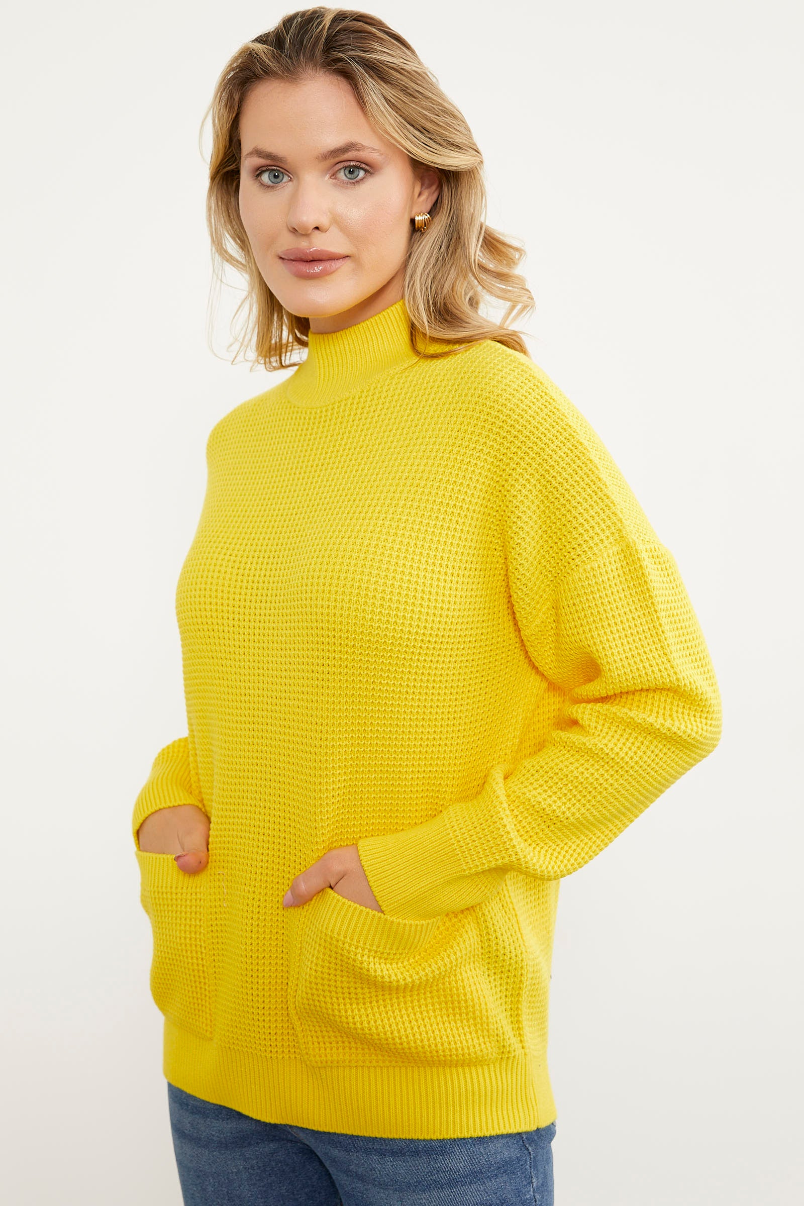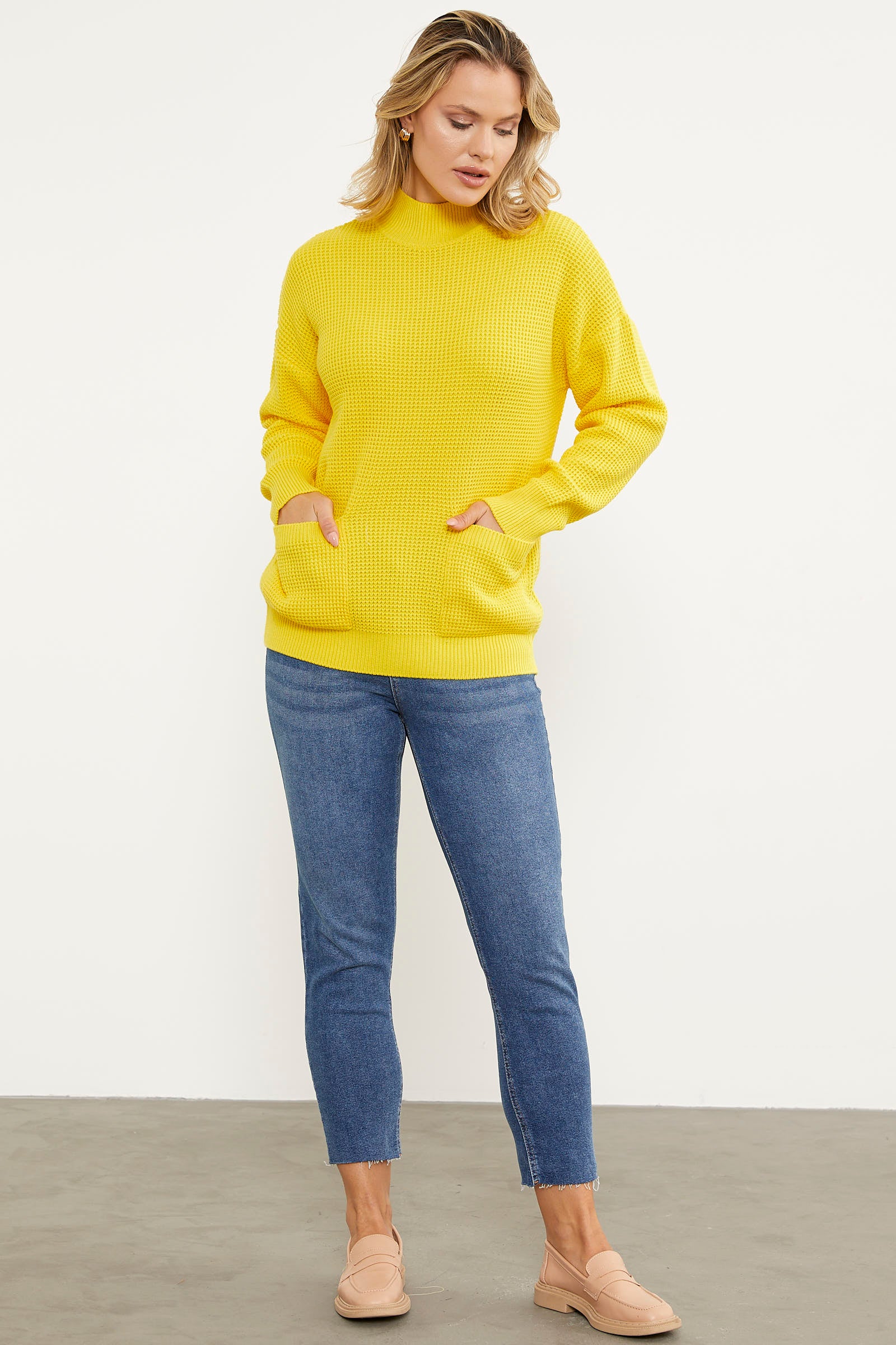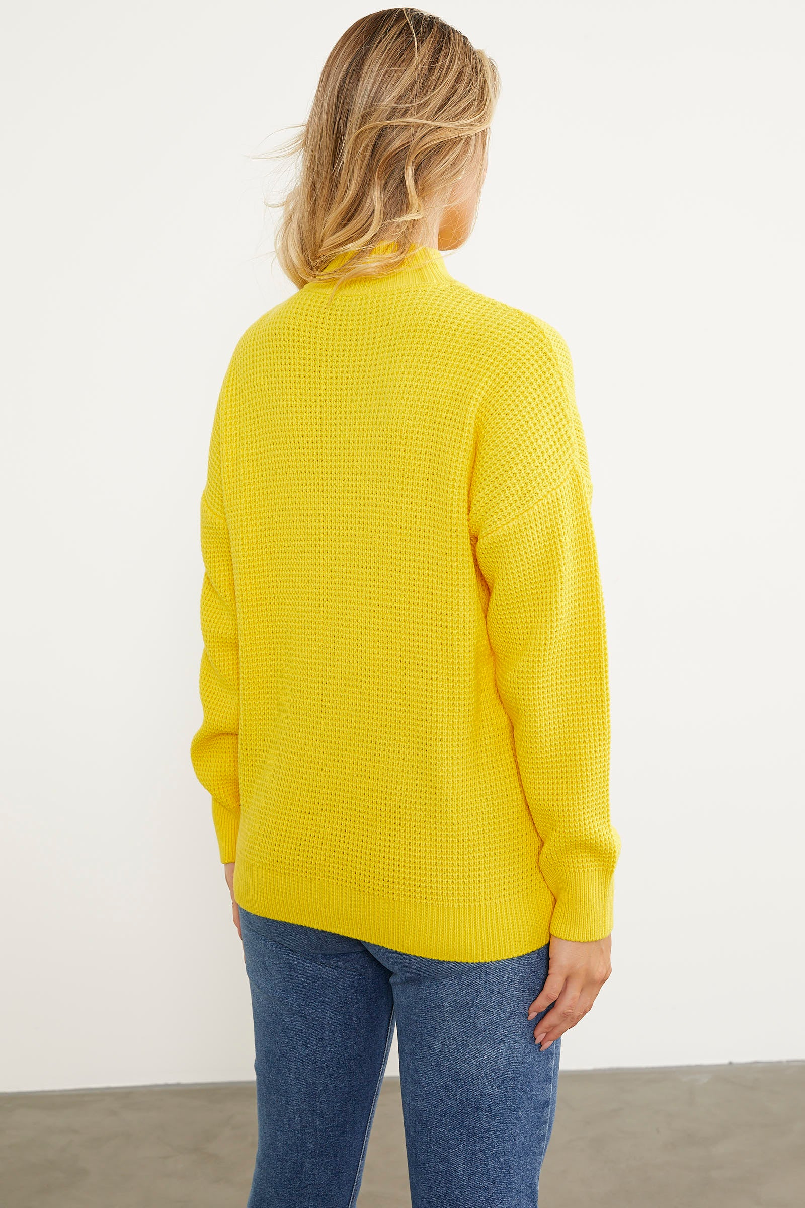 Petek Örgü Dik Yaka Triko Kazak - Sarı