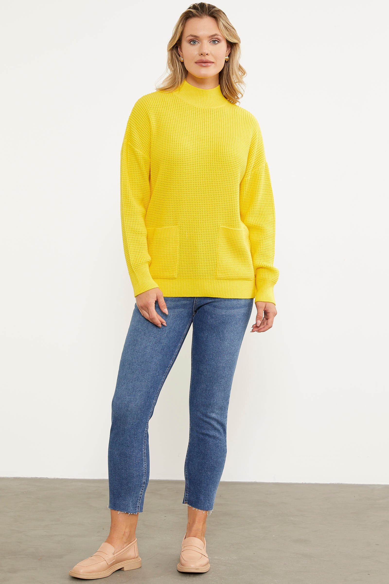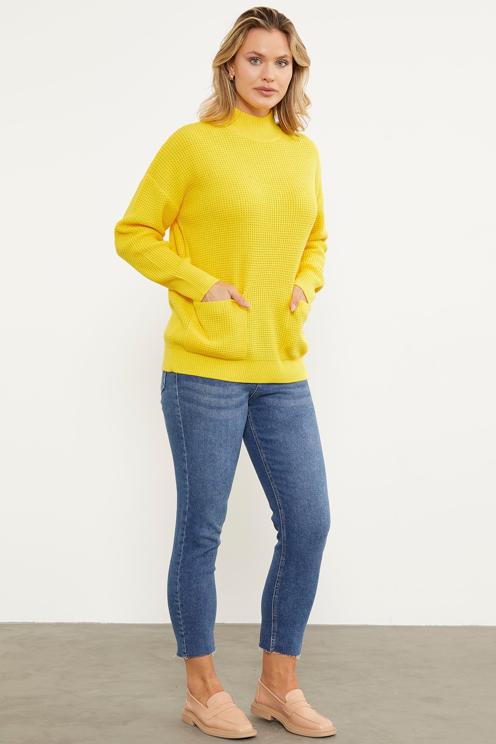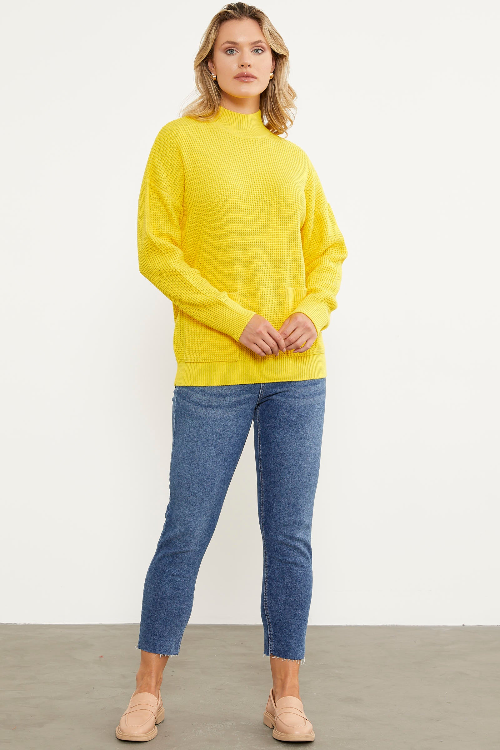 Petek Örgü Dik Yaka Triko Kazak - Sarı