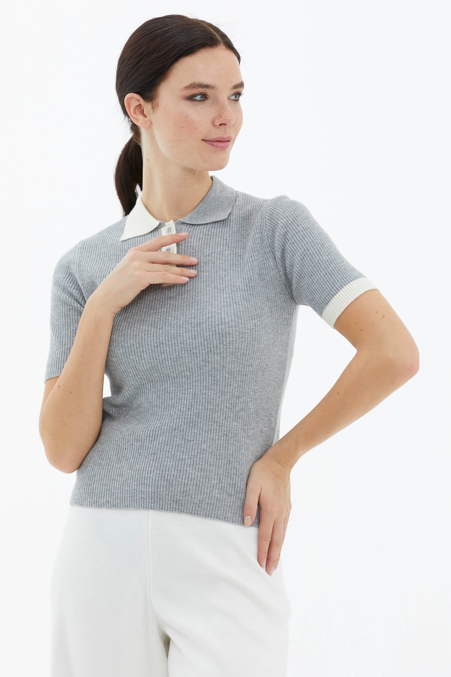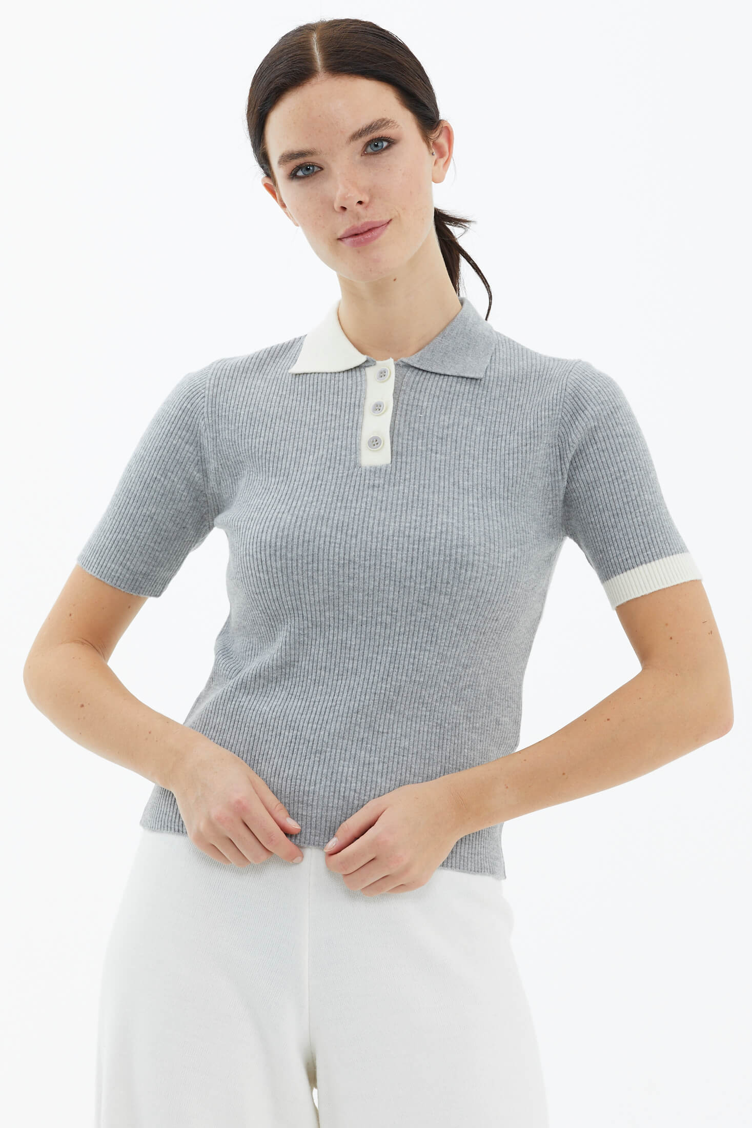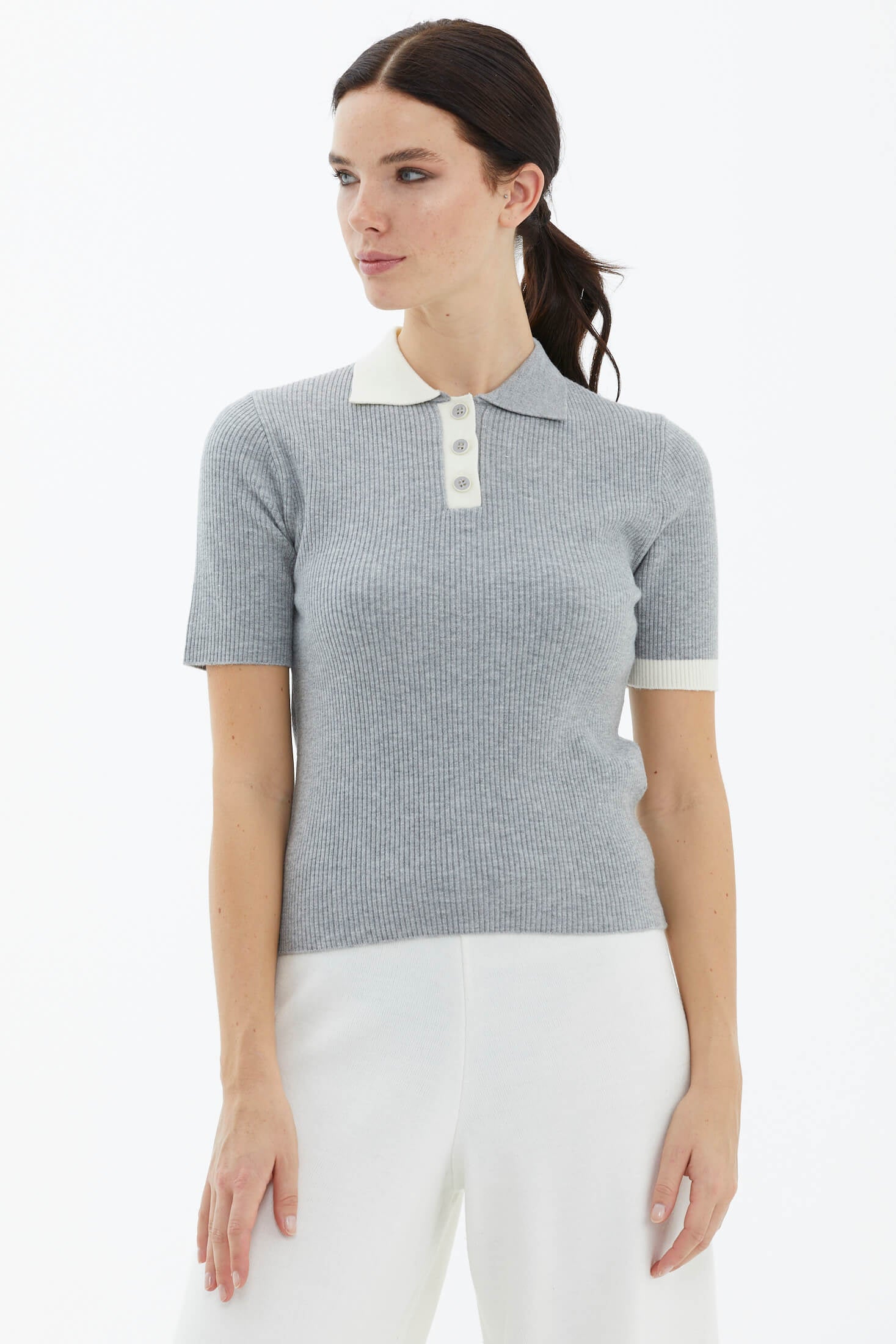 Polo yakalı, kısa kollu, düğme kapamalı, bedene oturan derbili triko kazak.