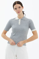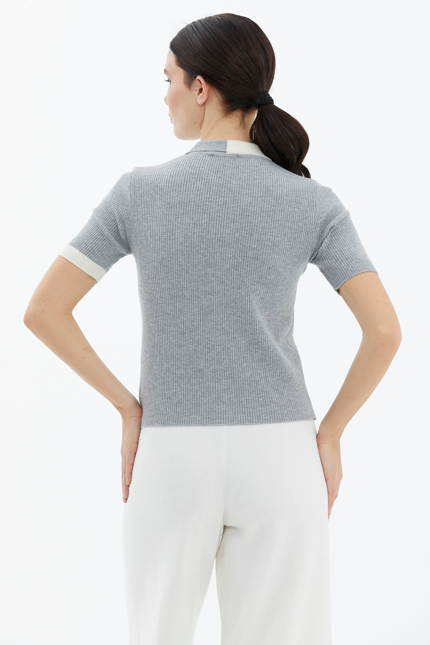 Polo Yaka Patlı Düğmeli Kısa Kollu Triko Kazak - Açık Gri