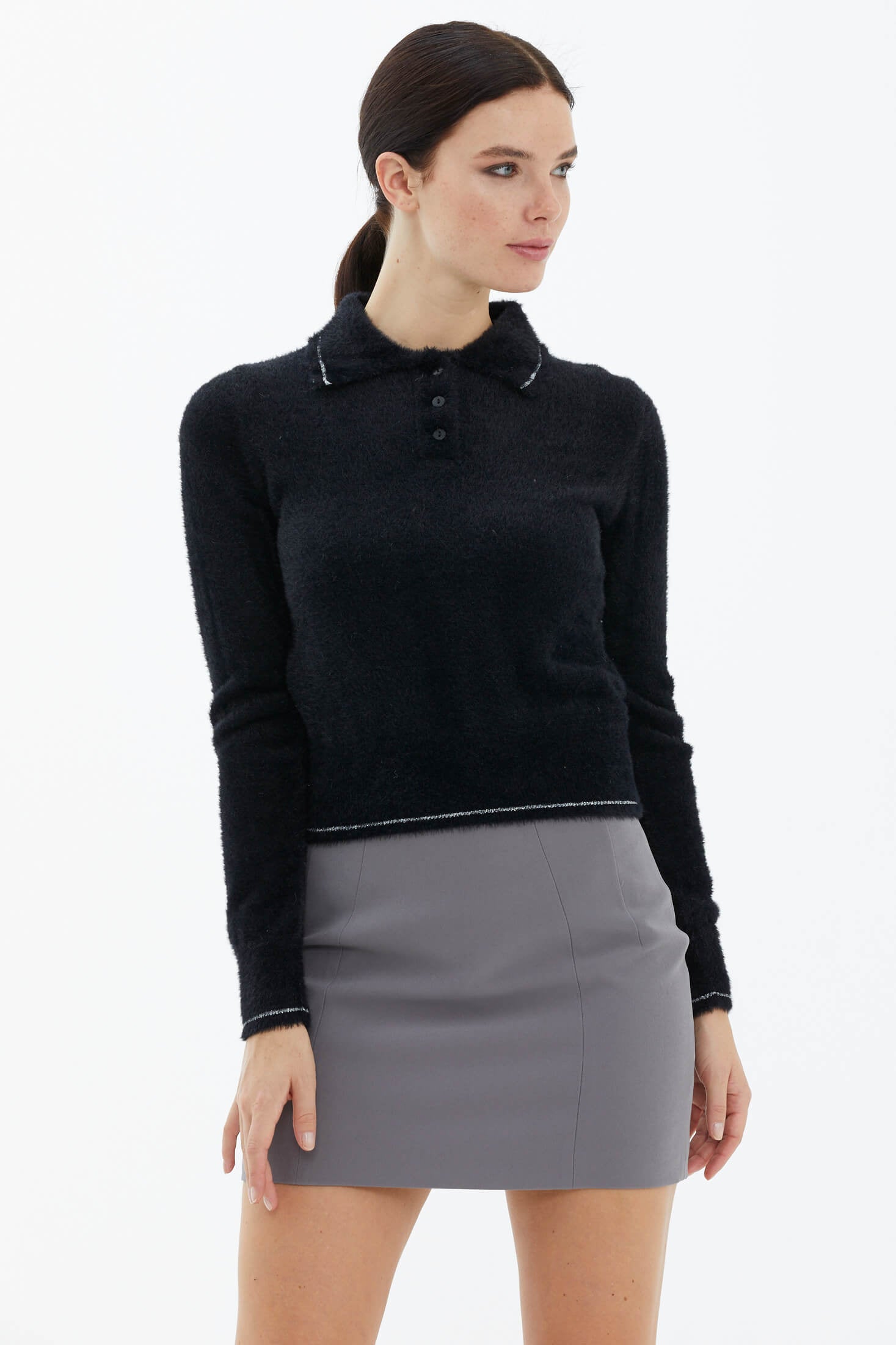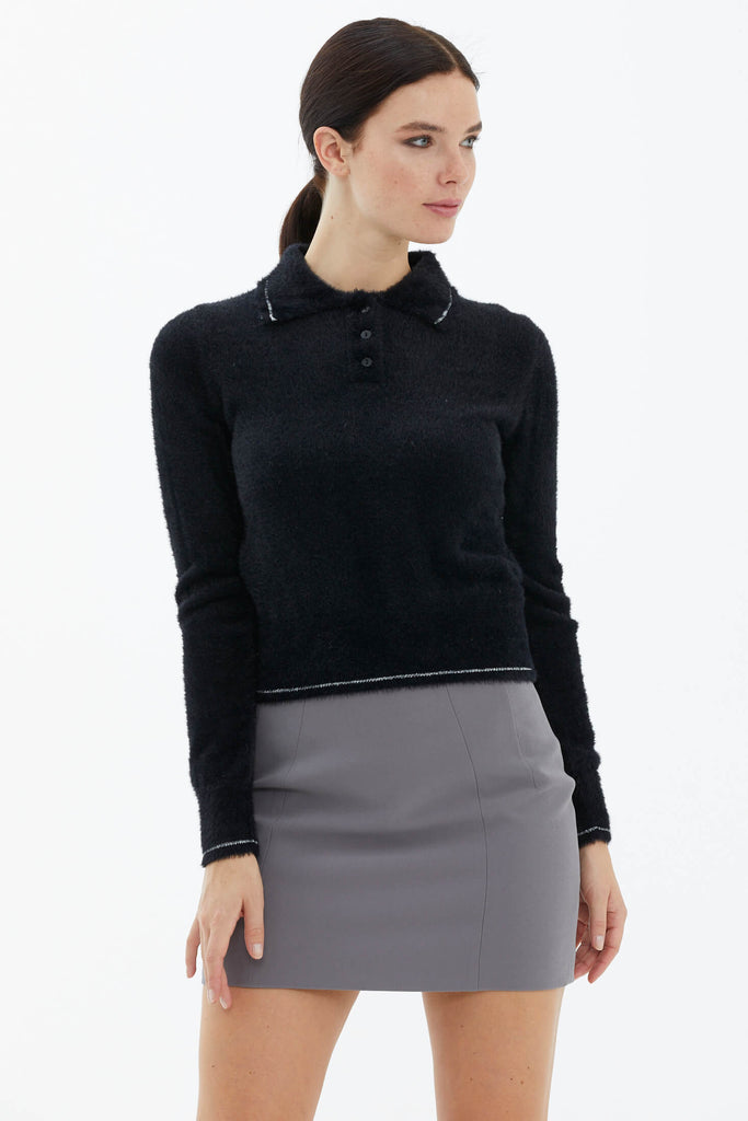 Yün karışımlı iplikten üretilen, uzun kollu, polo yaka, düğme kapamalı triko kazak. Etek ucu, manşetleri ve yakası sim iplik detaylı, yumuşak kazak.