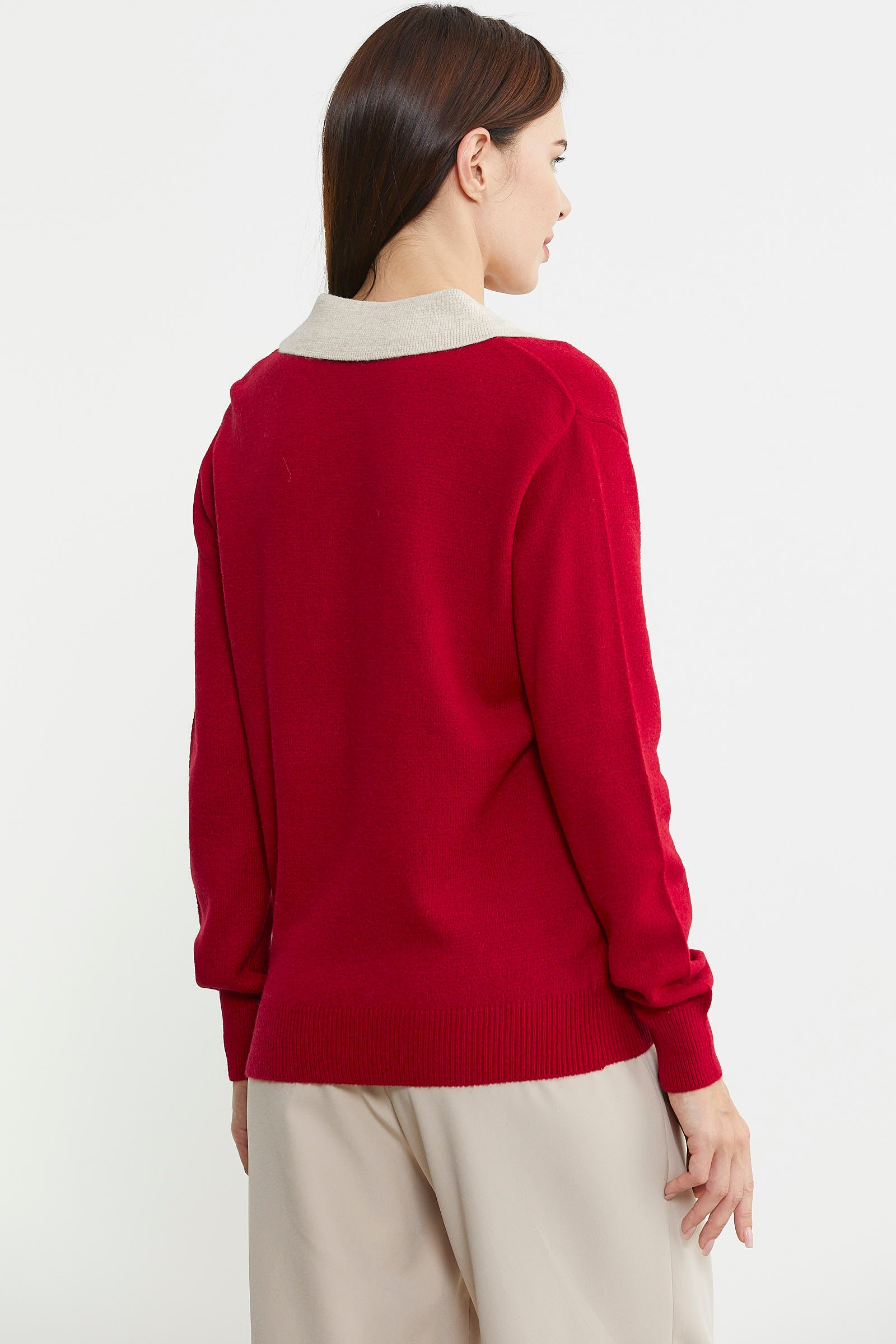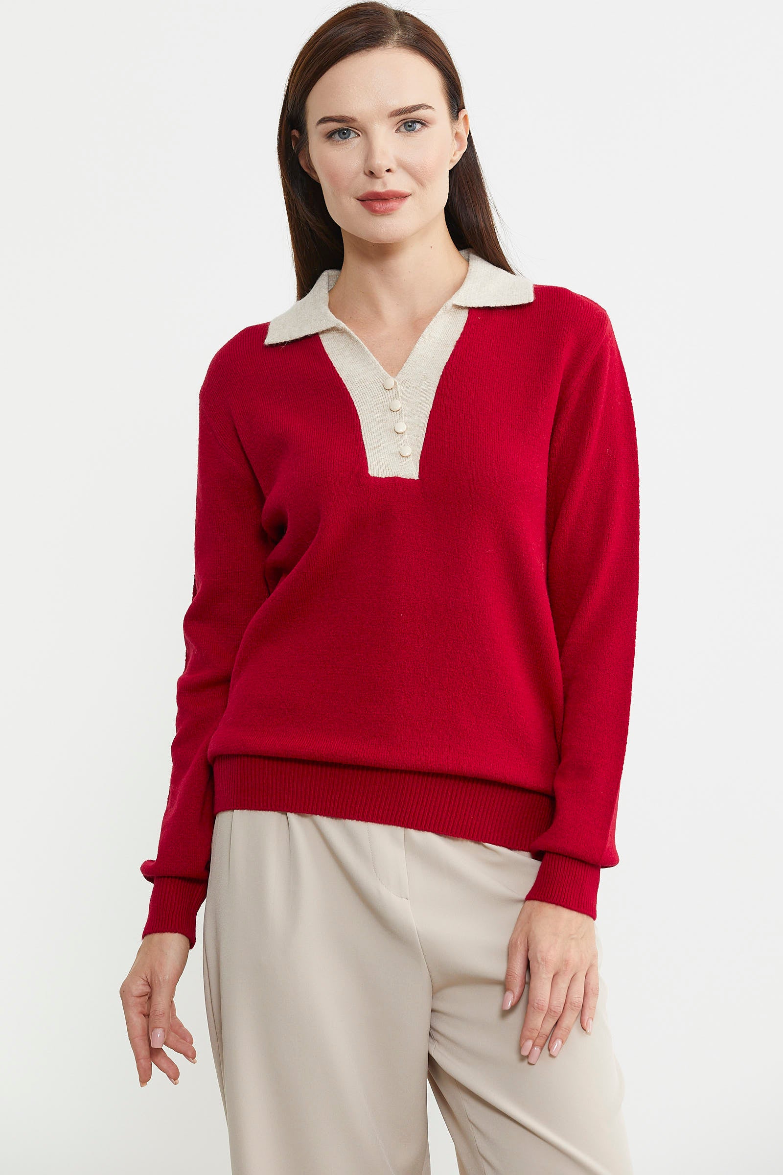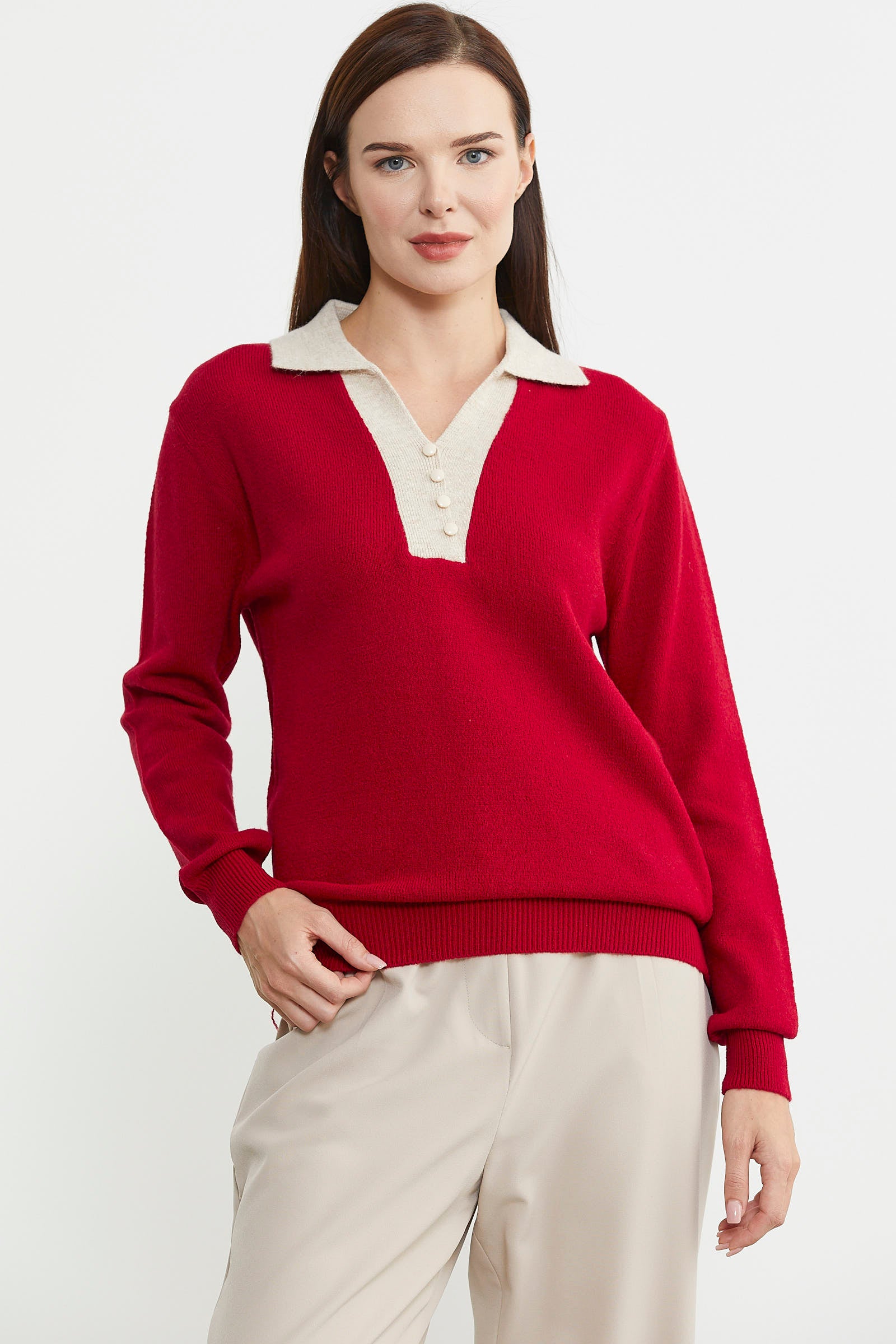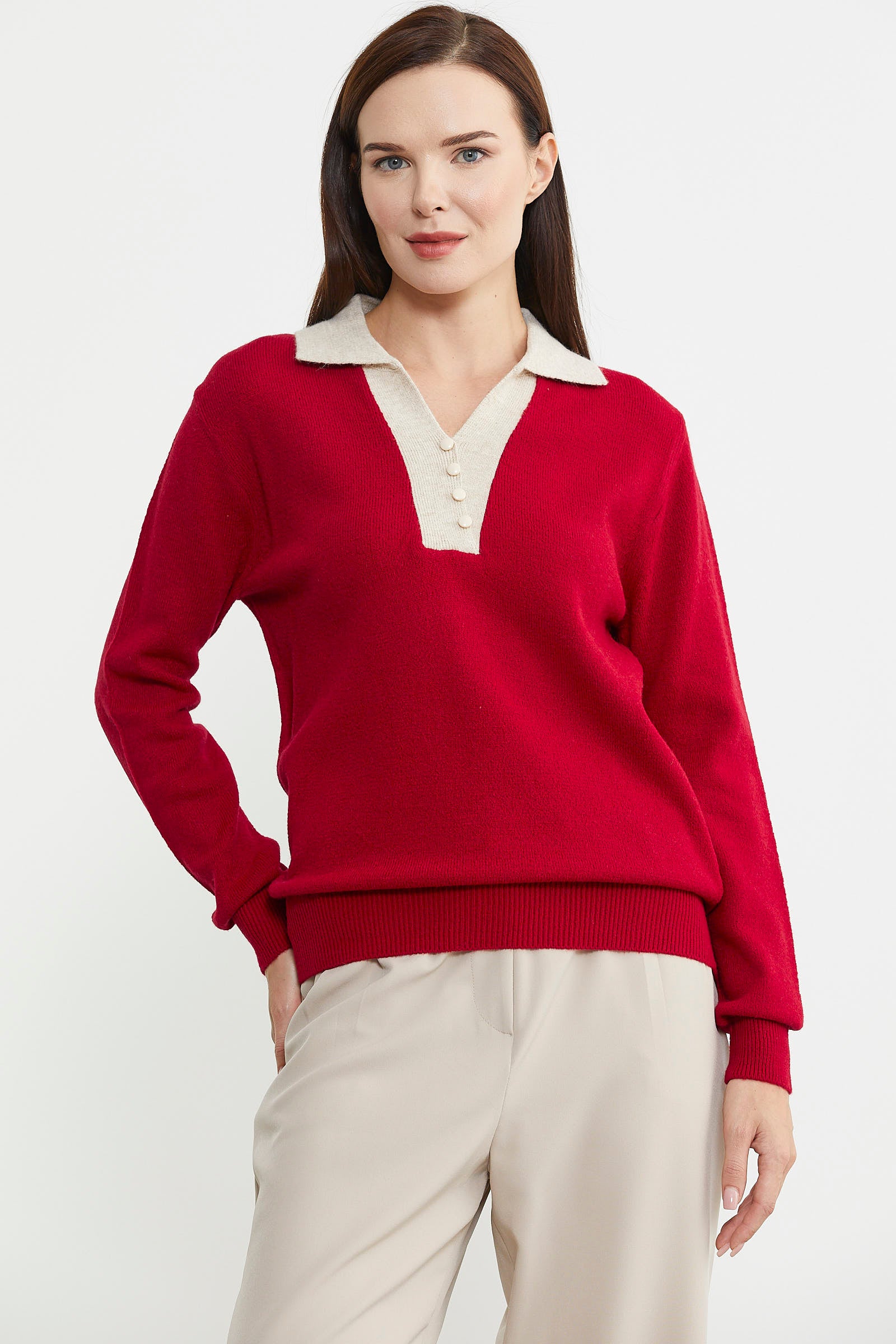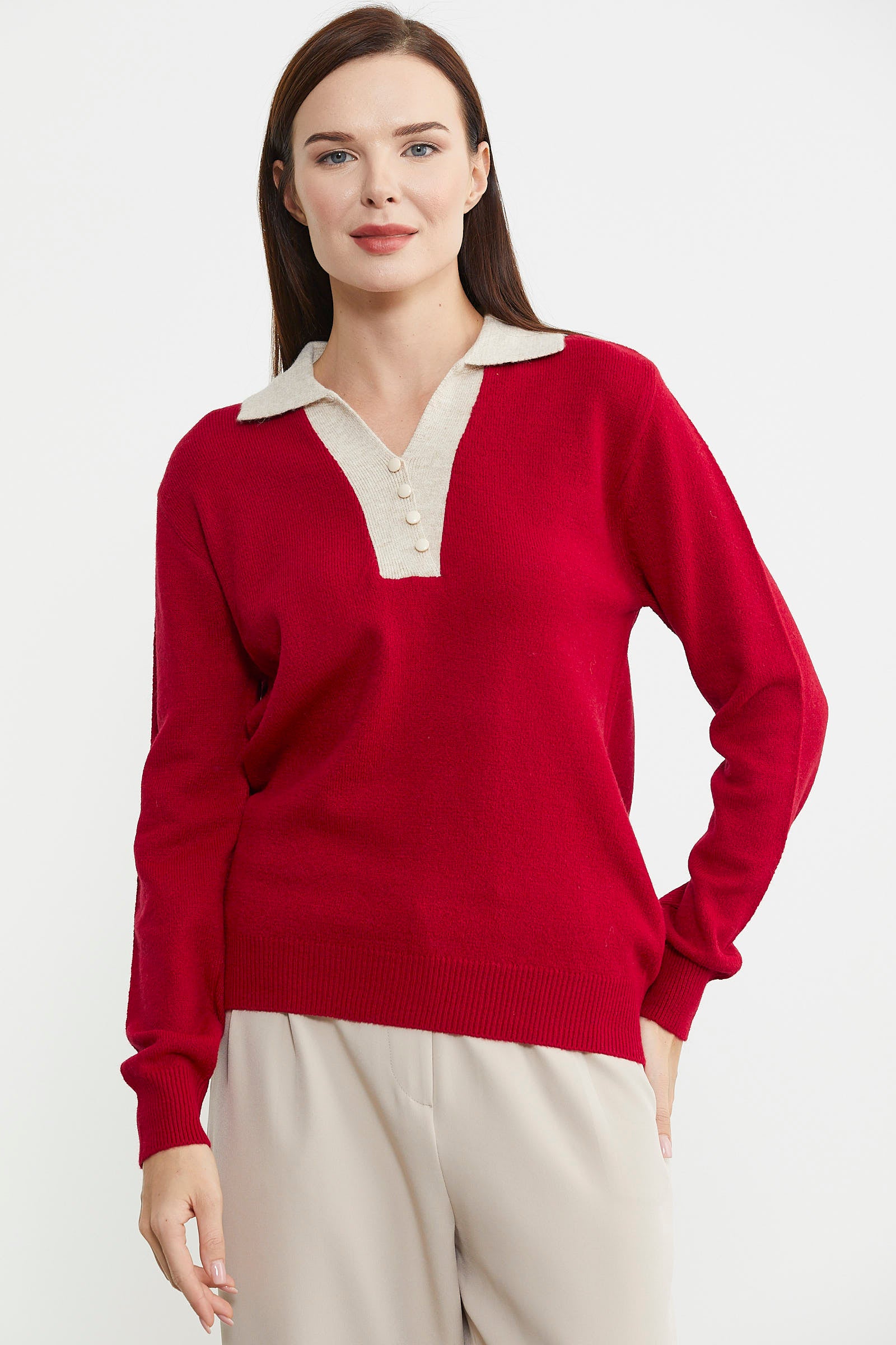 Polo Yaka Renk Kombinli Triko Kazak - Kırmızı