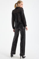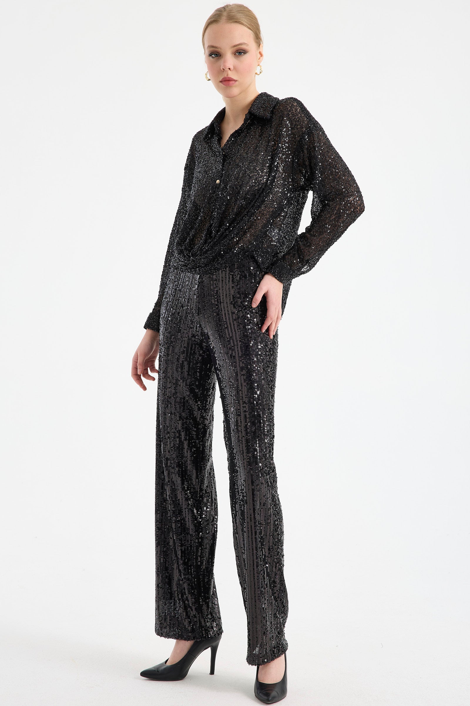 Pul payet sıvamalı, ton sür ton astarlı, yüksek bel pantolon. Cepsiz model.