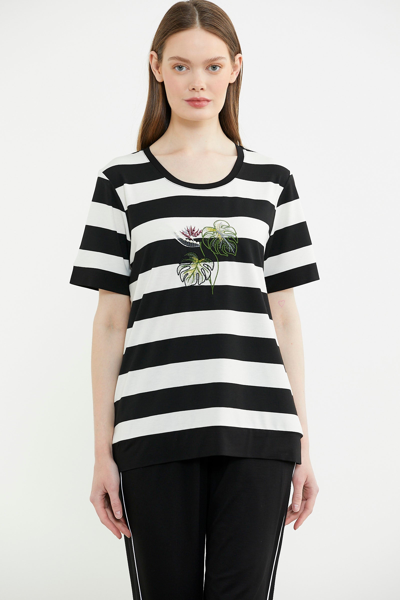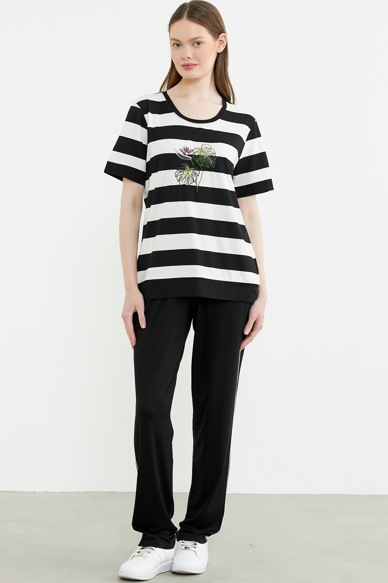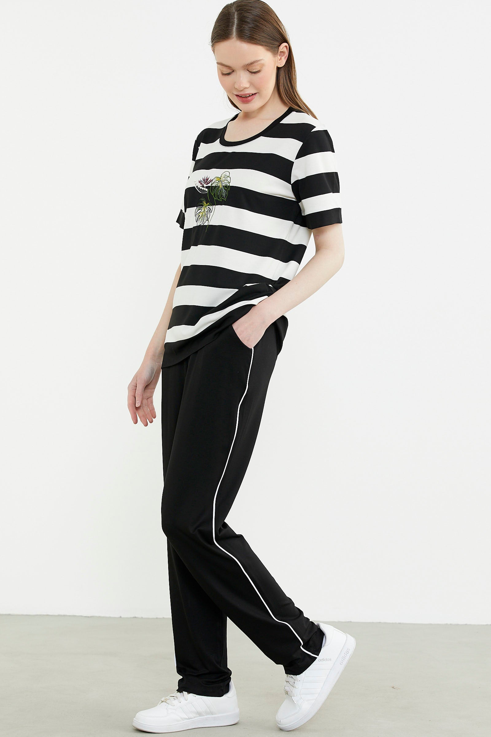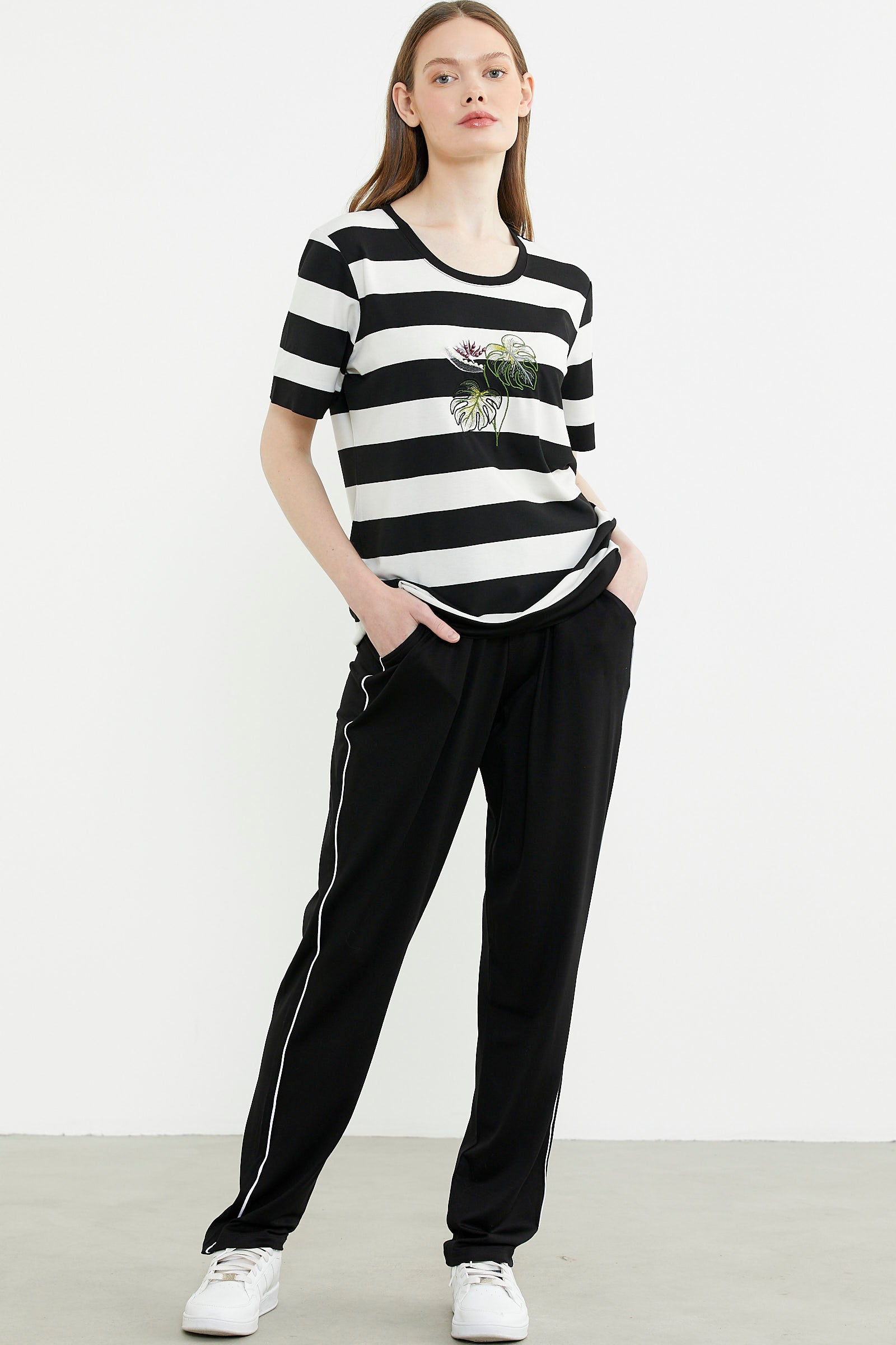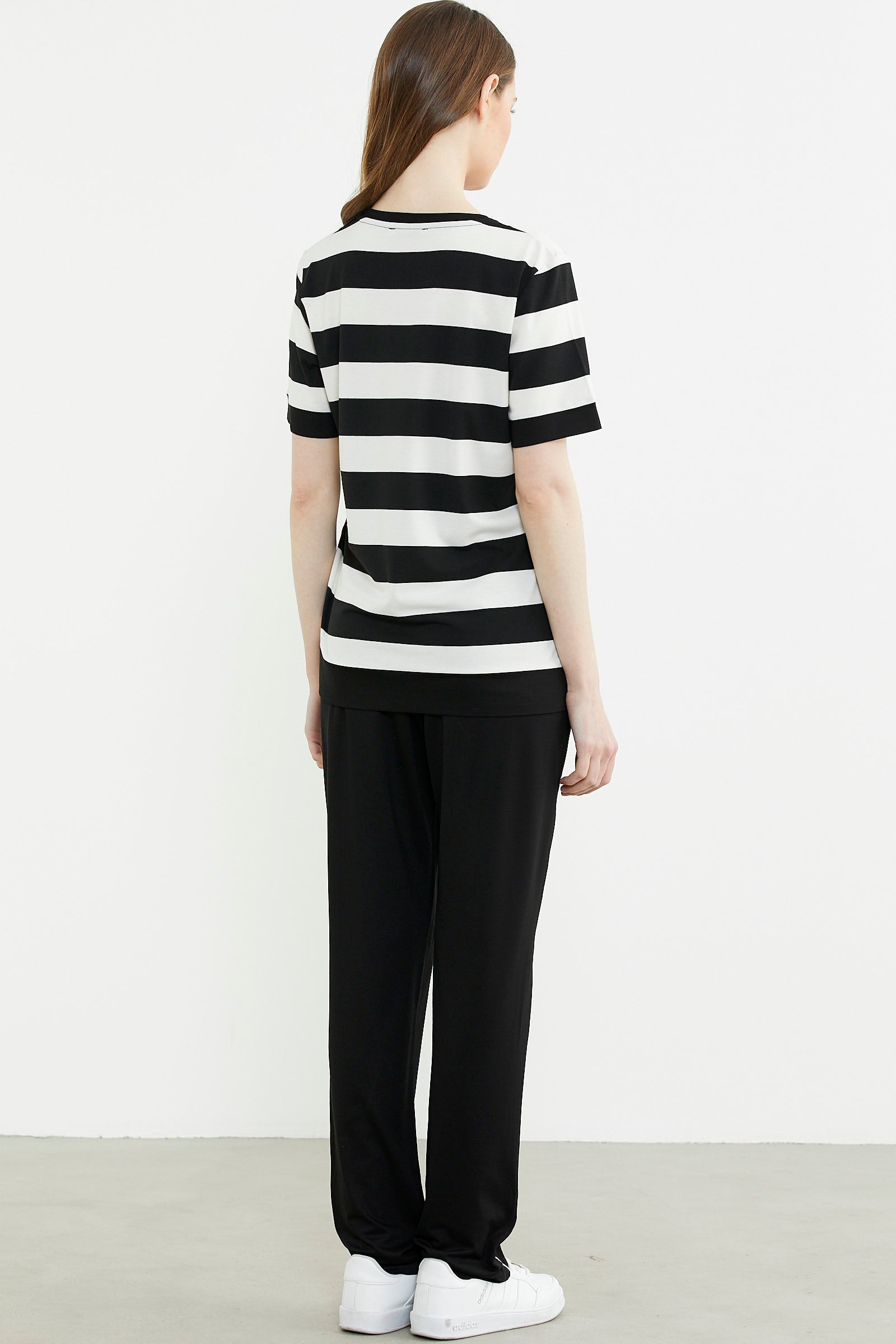 Zamansız çizgili deseniyle dikkat çeken bisiklet yaka tişört, düz renk kombinli rahat kalıp pantolonla takımdır. Yumuşak dokusuyla günlük kullanım için idealdir.