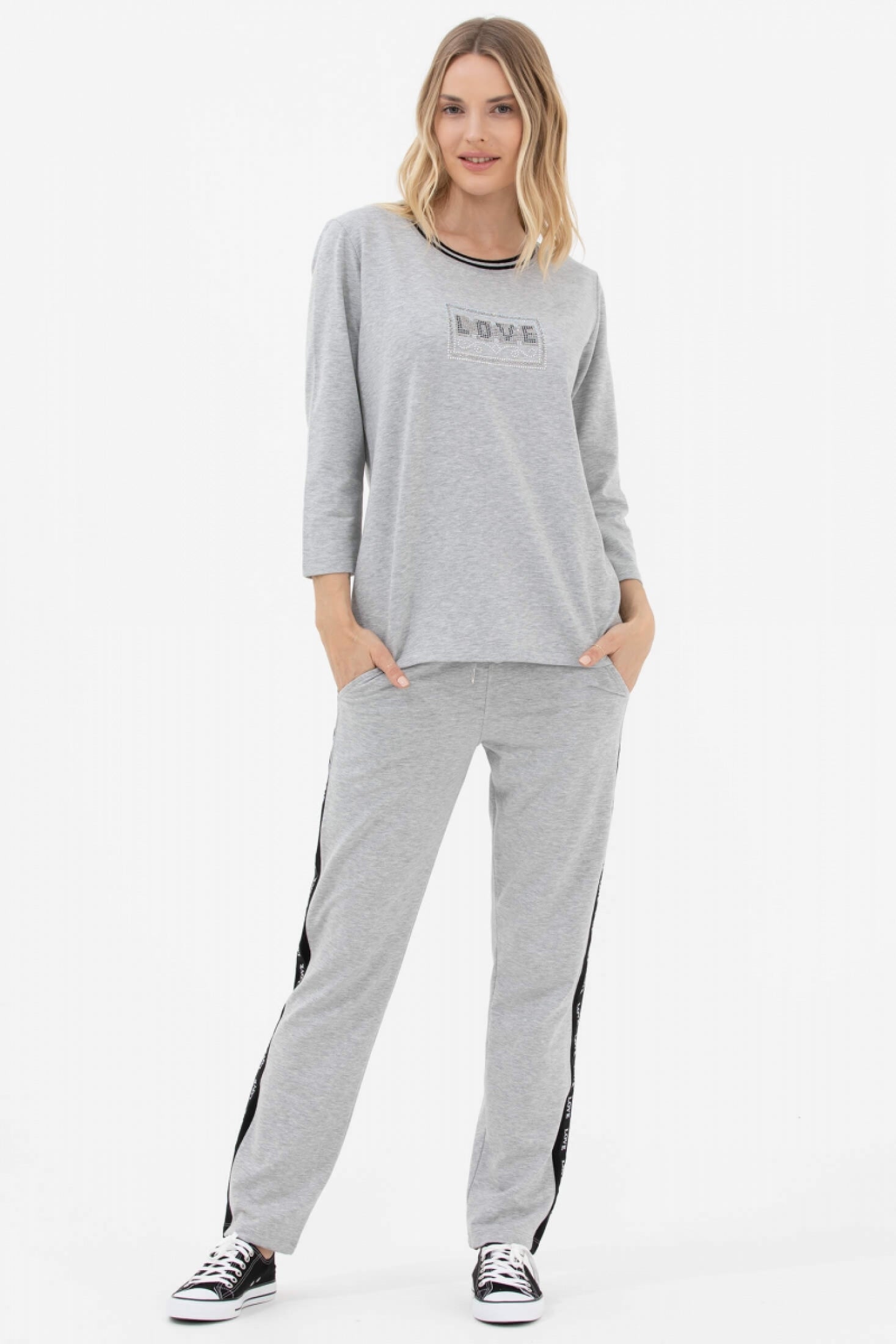 Pamuk karışımlı, yumuşak ve rahat kumaştan üretilen uyumlu bir stil sunan eşofman takımı, birlikte giyebileceğin veya diğer favori stillerinle eşleştirebileceğin kapüşonlu fermuar kapamalı yelek, taş detaylı sıfır yaka bluz ve eşofman altını içeren üçlü takımdan oluşmaktadır.