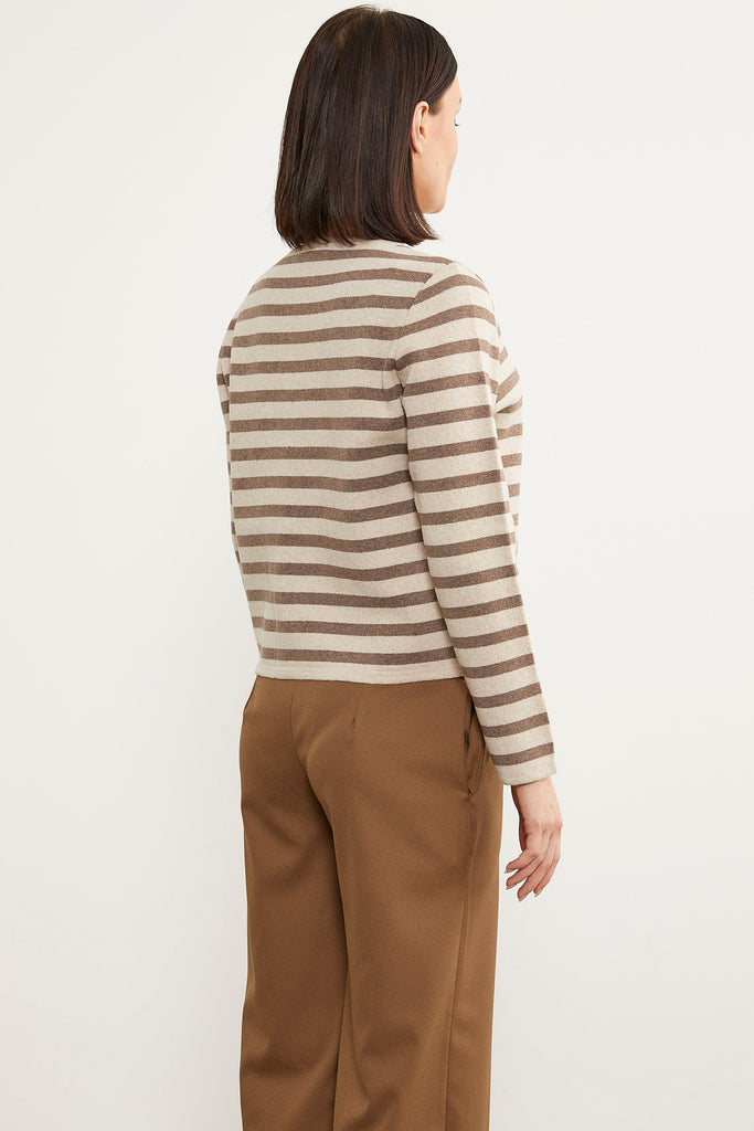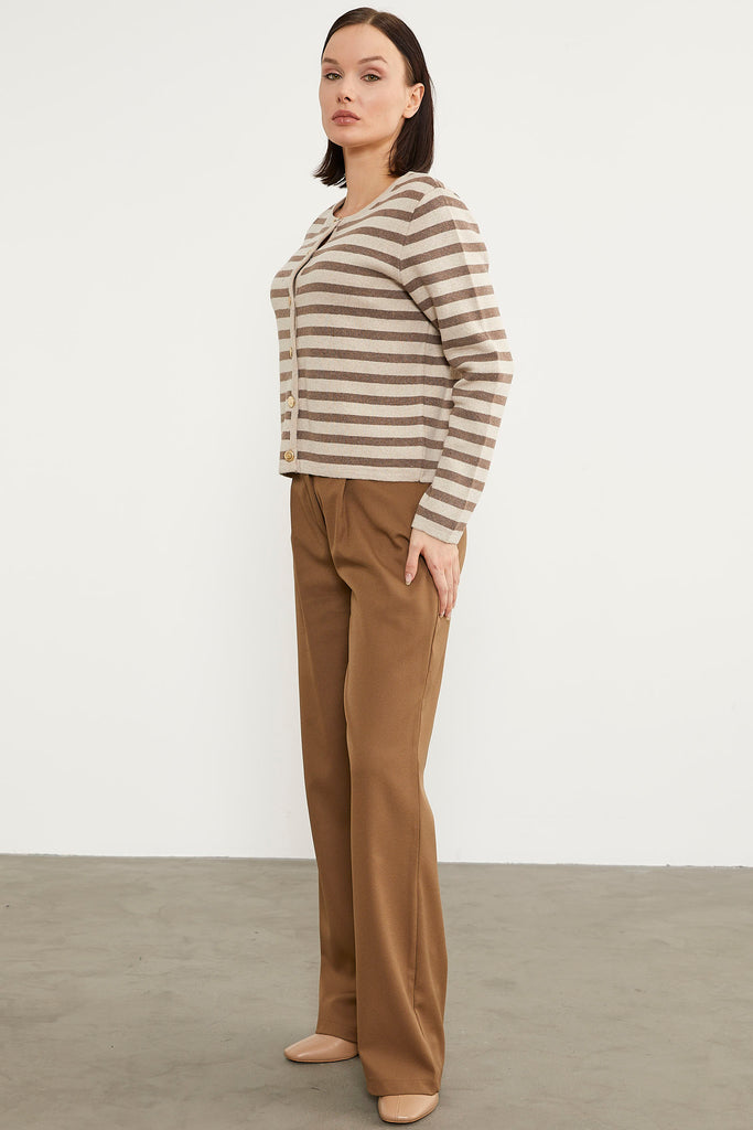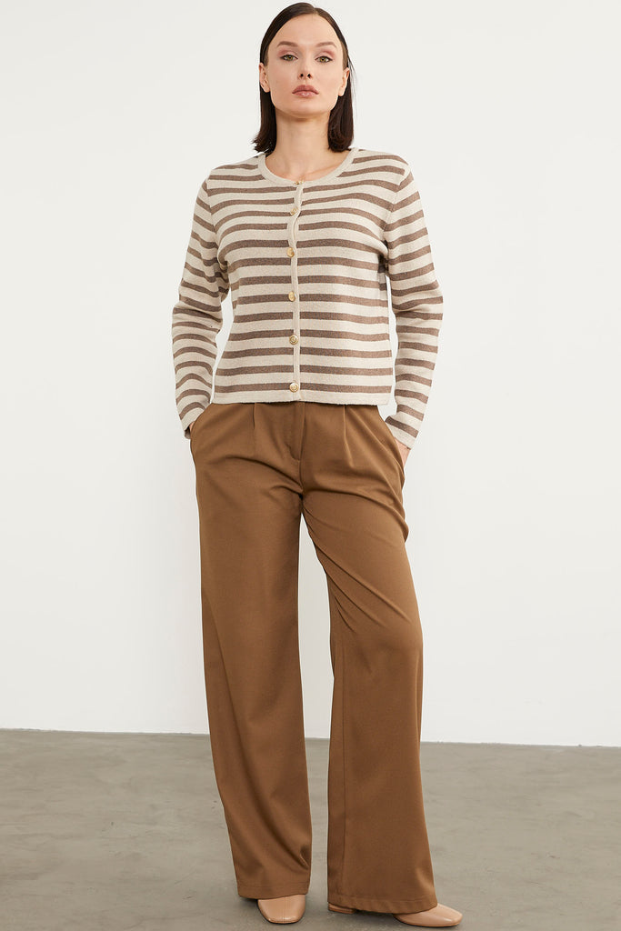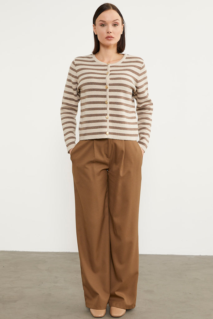 Her kombininize uyum sağlayacak bir parçaya ne dersiniz? Önden düğmeli, iki renkli, çizgili triko hırka sizi yumuşacık dokusu ile rahat hissettirirken stilinize şıklık katacaktır. İster pantolonlarınızla isterseniz de eteklerinizle kombinleyebileceğiniz tamamlayıcı bir parça olacaktır.