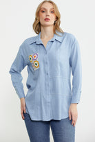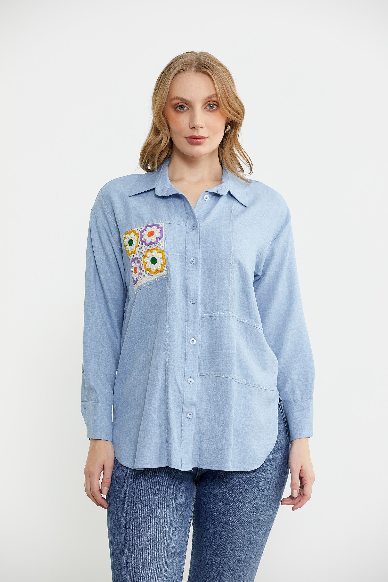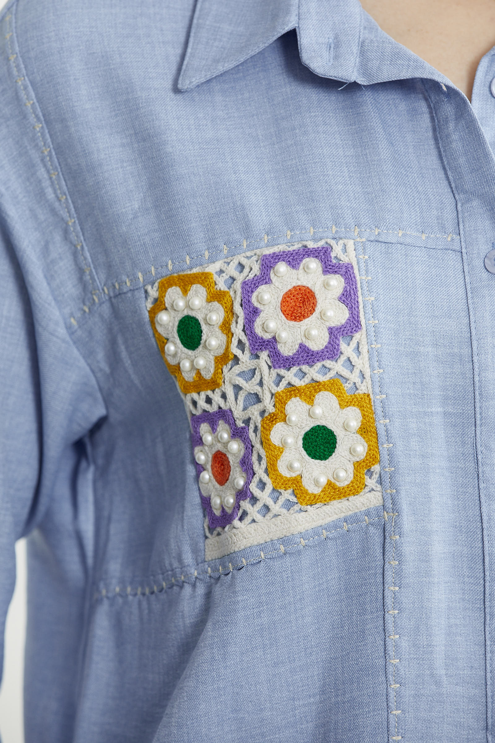 Pamuk içeren gömlek modelinin, ön cepde nostaljik renkli dantel motif kullanılmıştır. Ön bedende kullanılan patcwork detayı ile dinamik görünüm oluşturulmuştur.