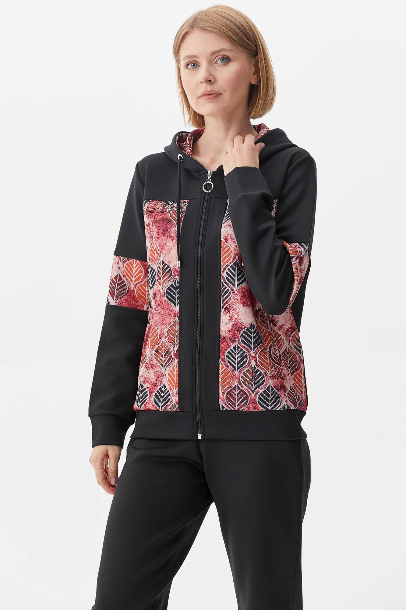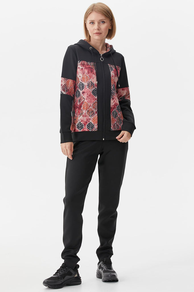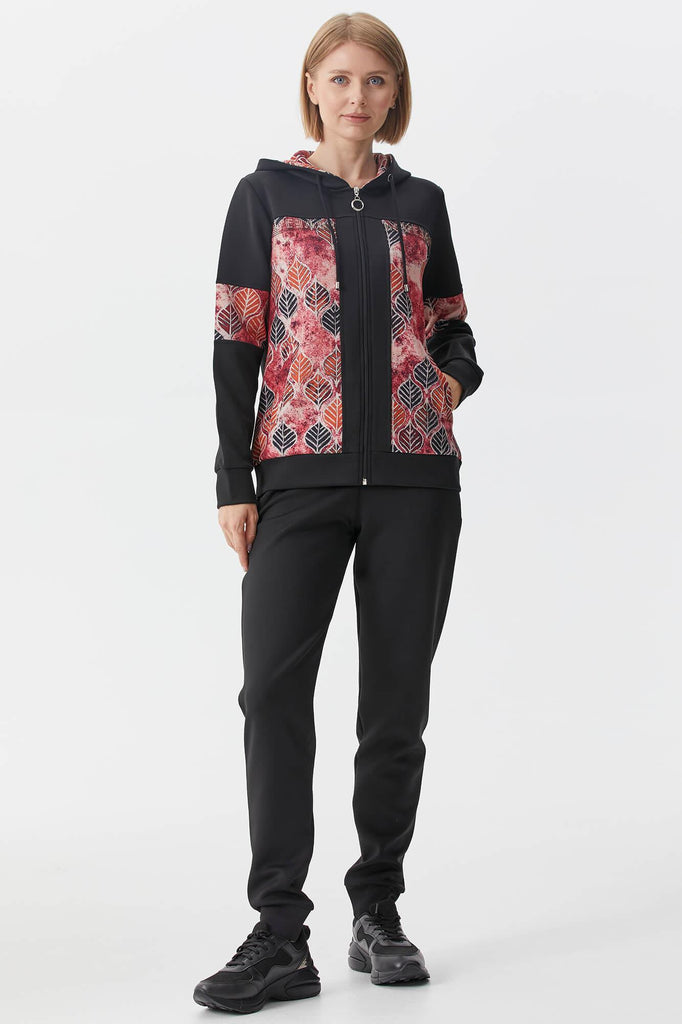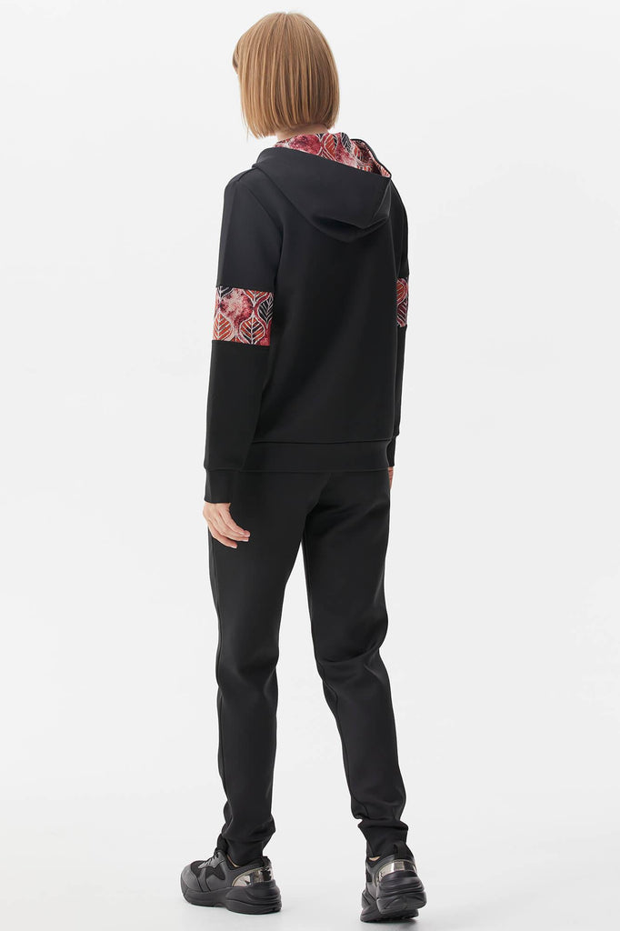 Kapüşonlu, uzun kollu, önü fermuar kapatmalı, cep detayı bulunan desenli sweatshirt ve beli lastikli, jogger eşofman altından oluşan takım.