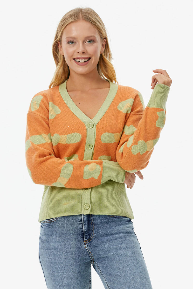 Renkli Desenli Düğmeli Triko Hırka - Yeşil