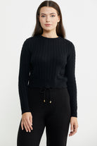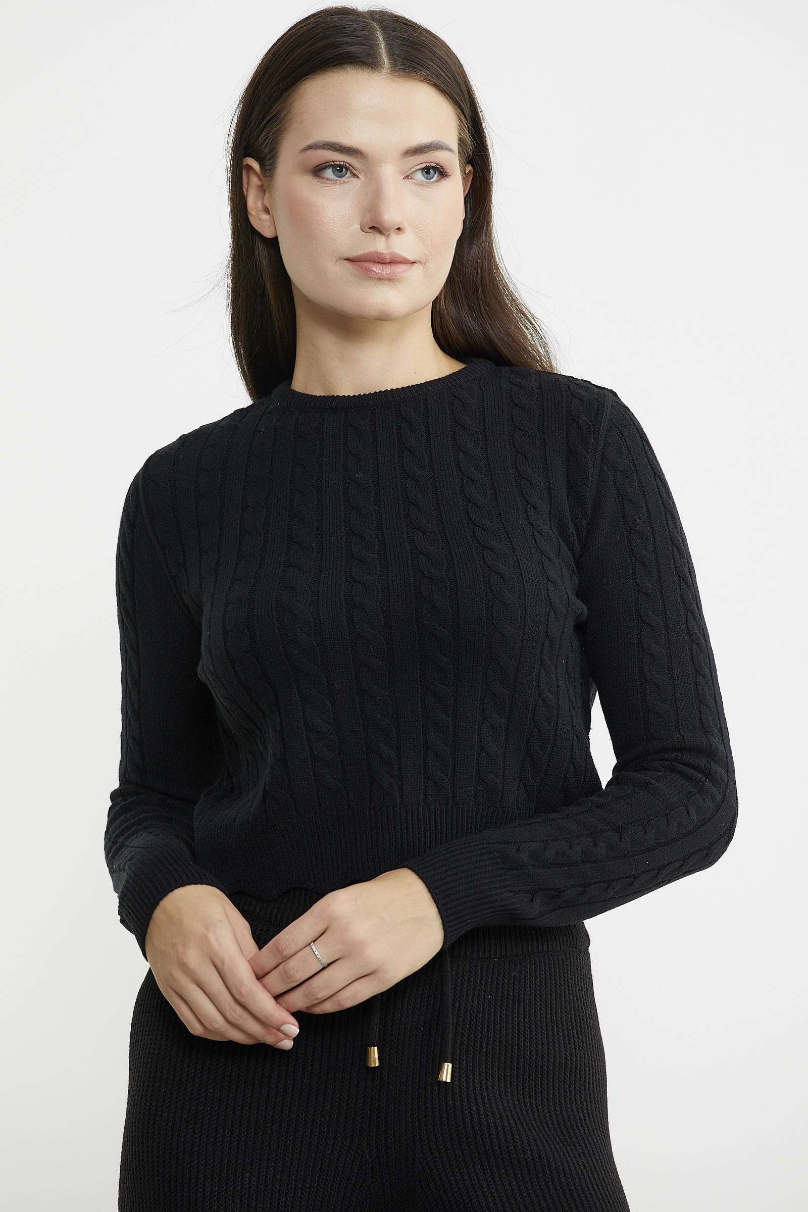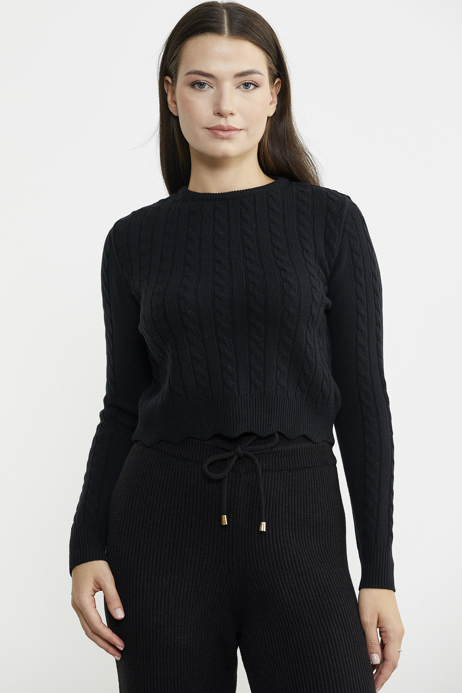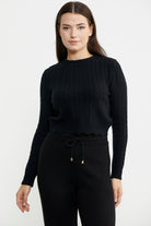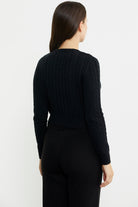 Saç Örgü Dilimli Crop Triko Kazak - Siyah