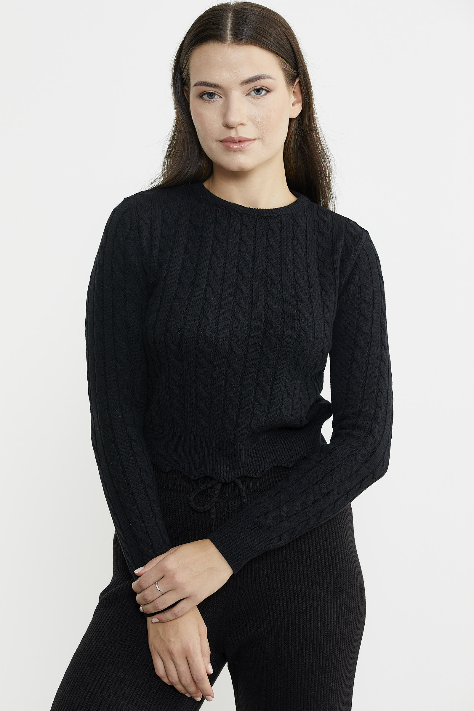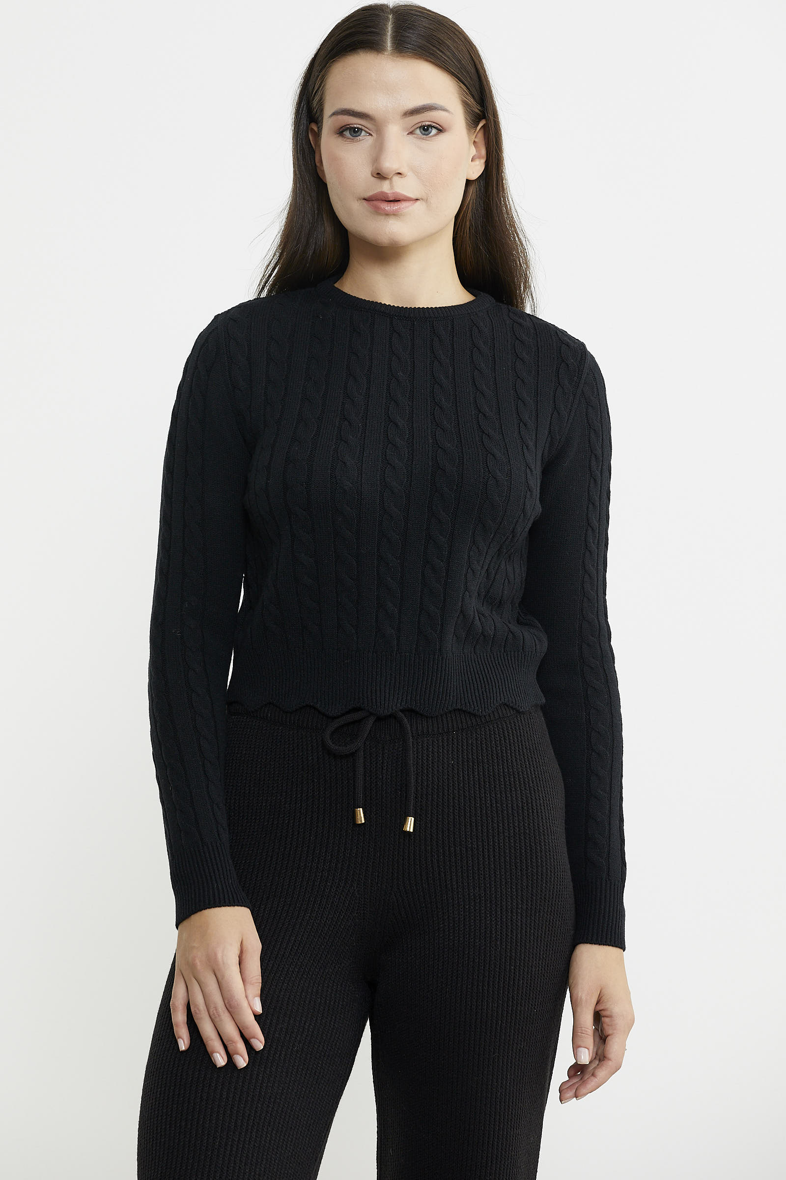 Etek ucundaki dilimli detayıyla öne çıkan kısa triko kazak, saç örgü motifleriyle tüm kombinlerinizin tamamlayıcısı olacak.