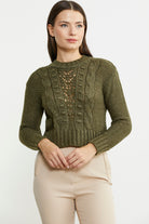 Saç Örgü Motifli Crop Yünlü Triko Kazak - Haki