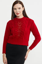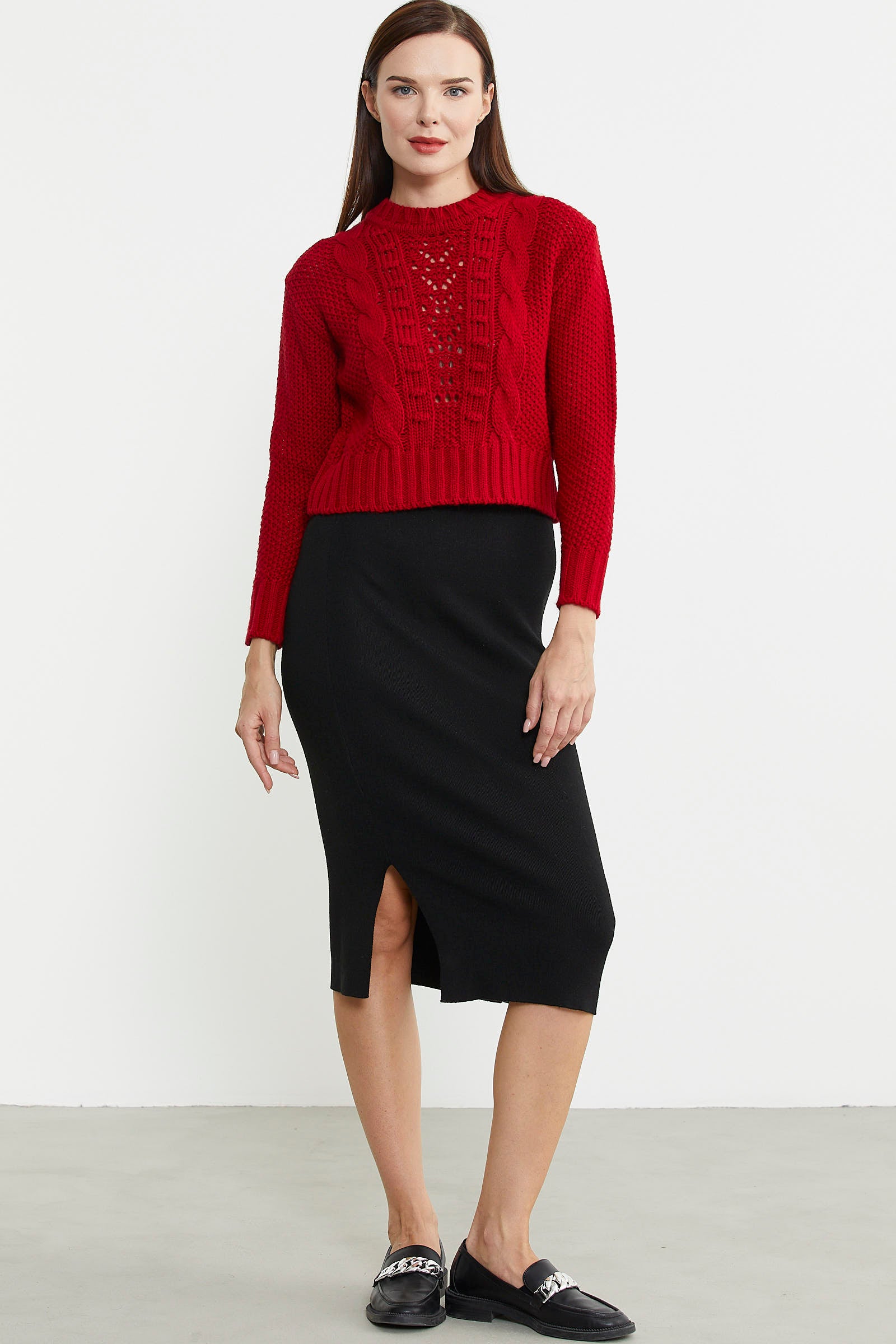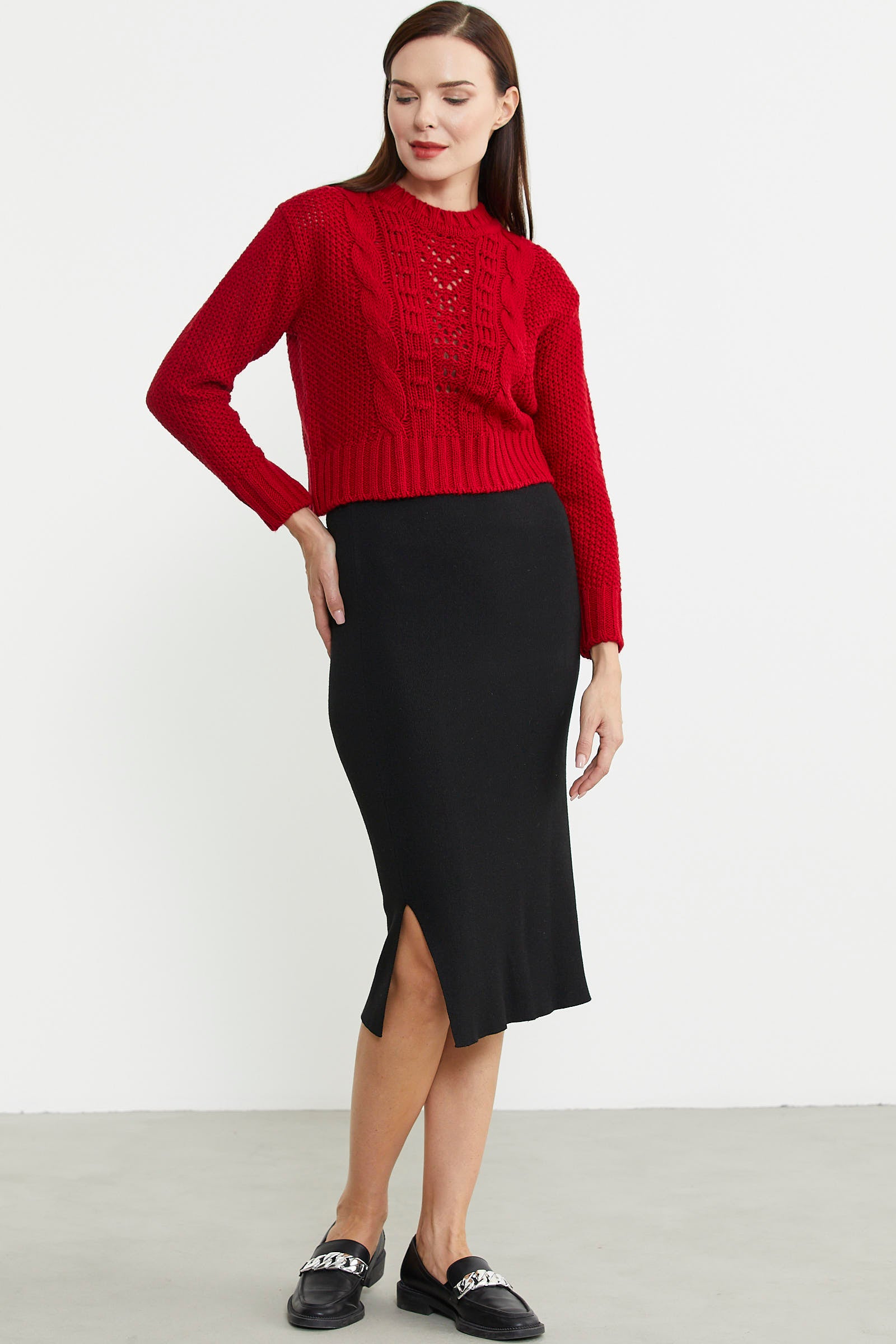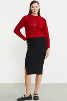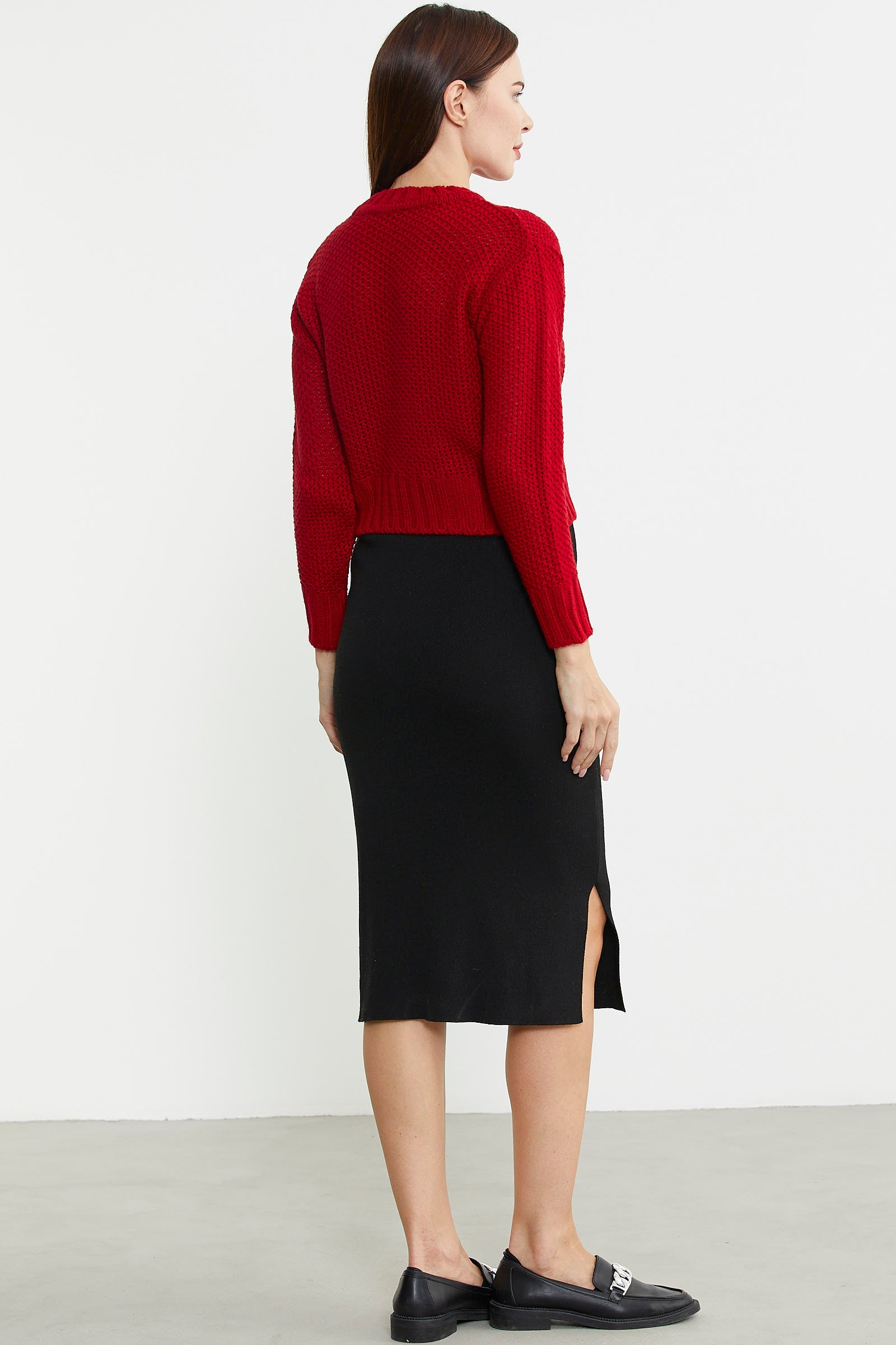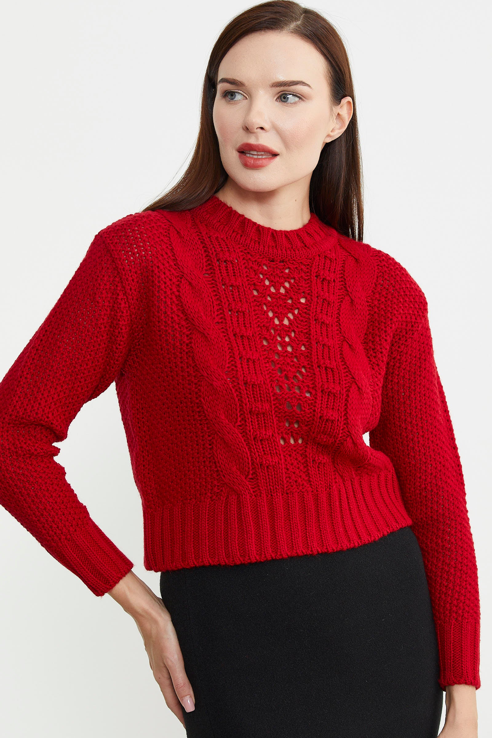 Saç Örgü Motifli Crop Yünlü Triko Kazak - Kırmızı