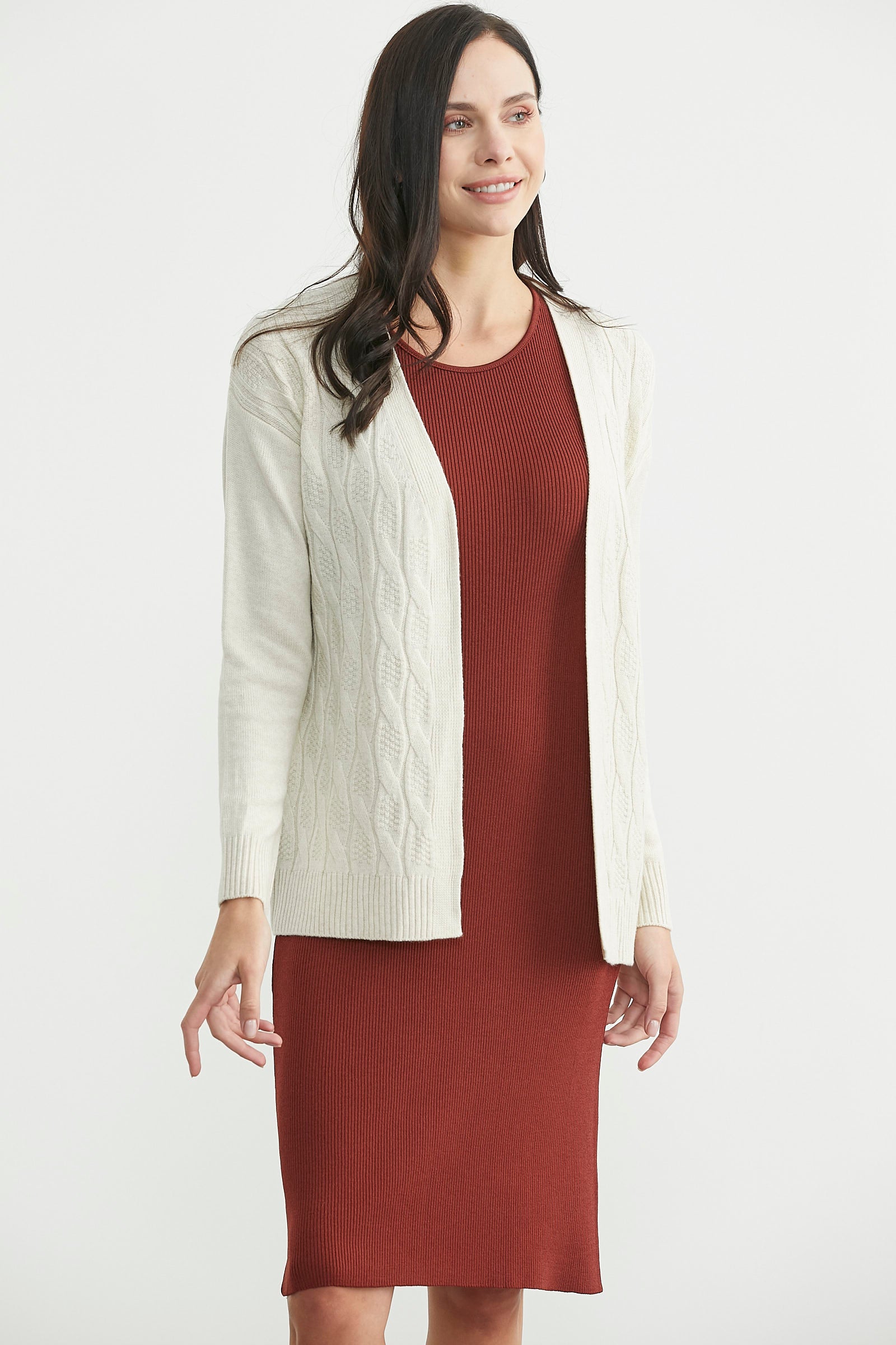 İnce, mevsimlik triko hırka. Ara boy, desenli, rahat kalıp.