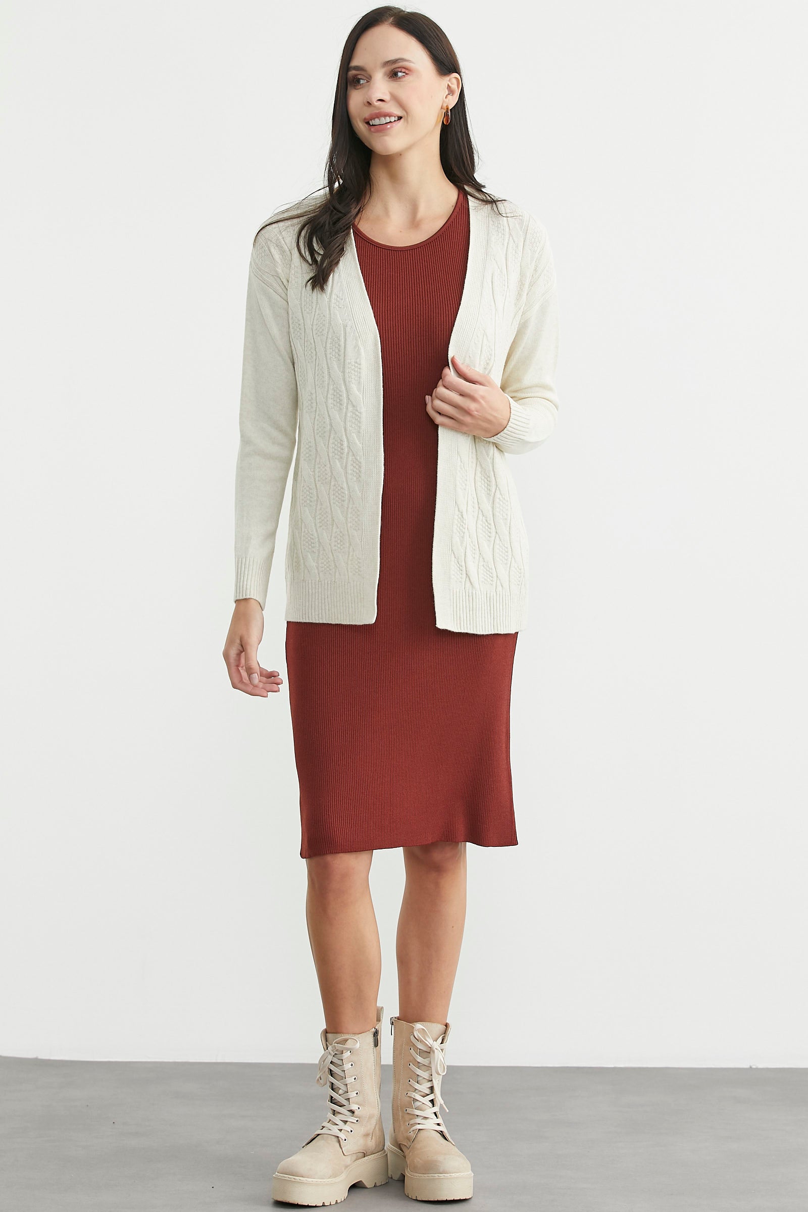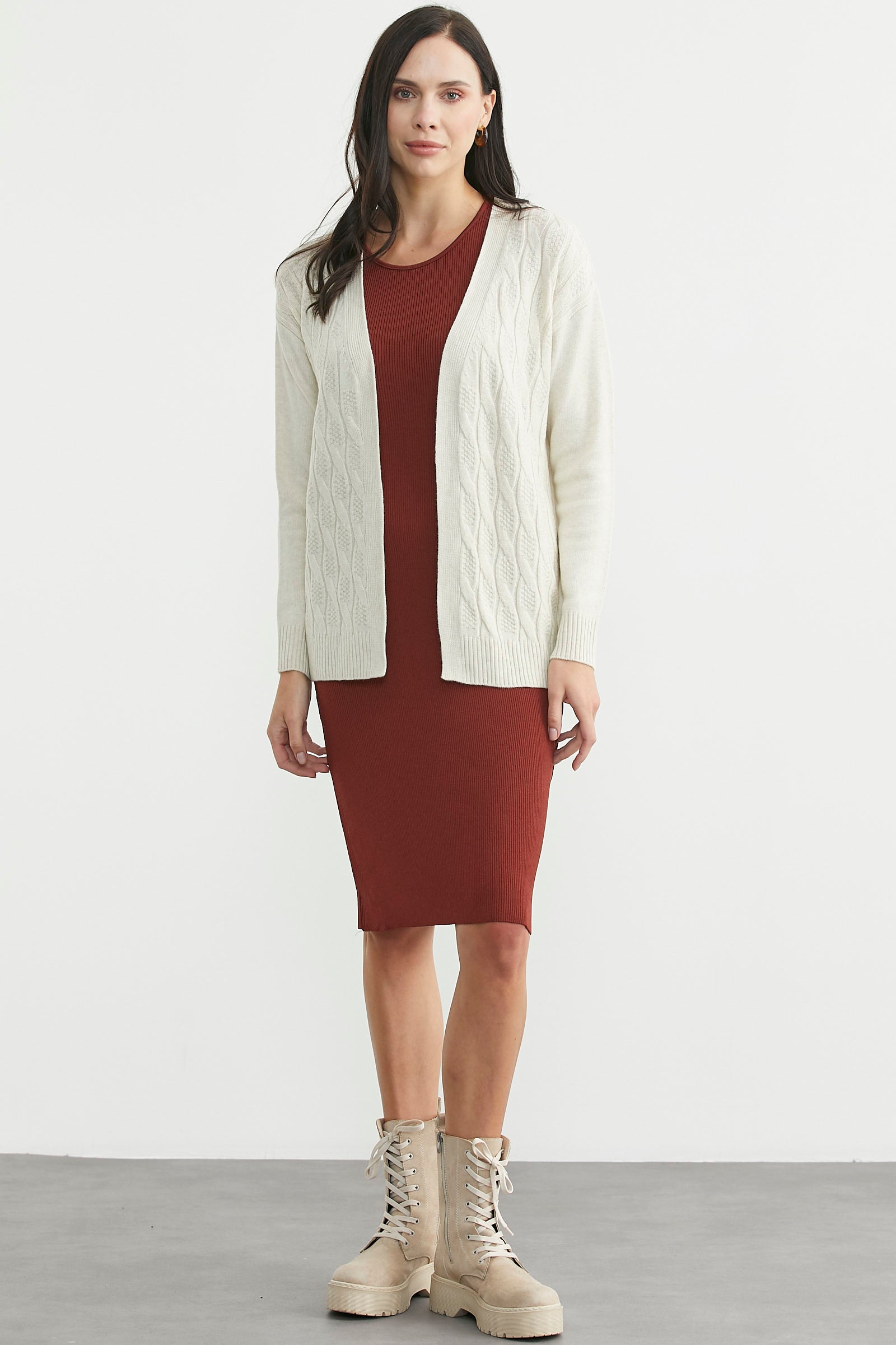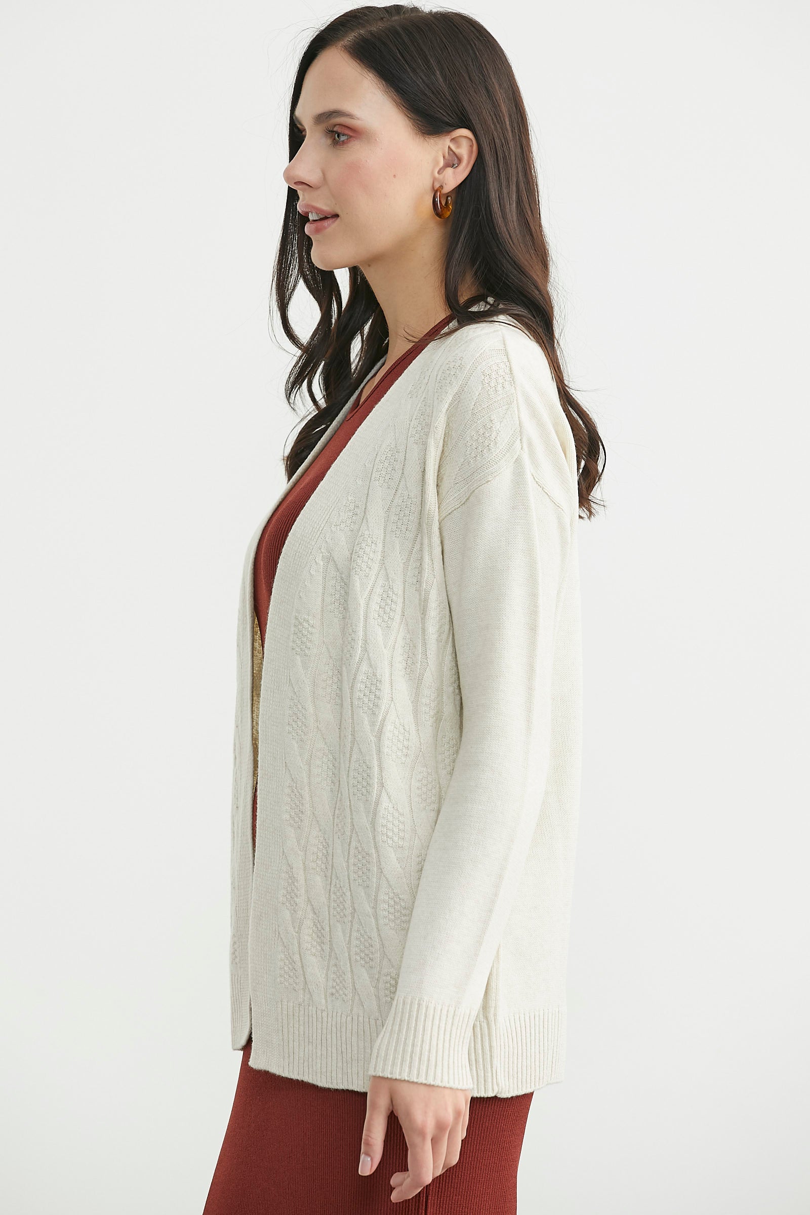 Saç Örgülü Rahat Kalıp Triko Hırka - Taş