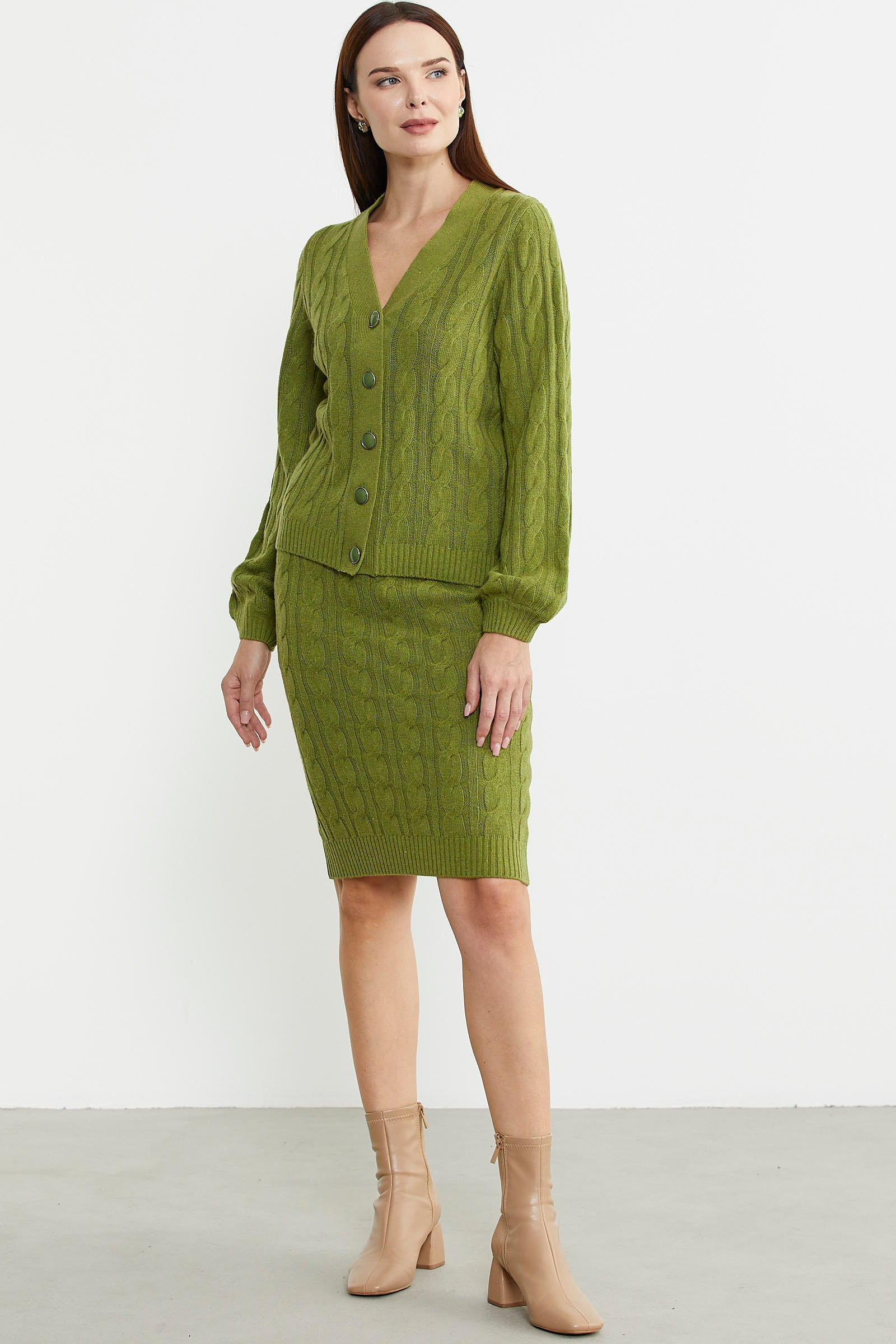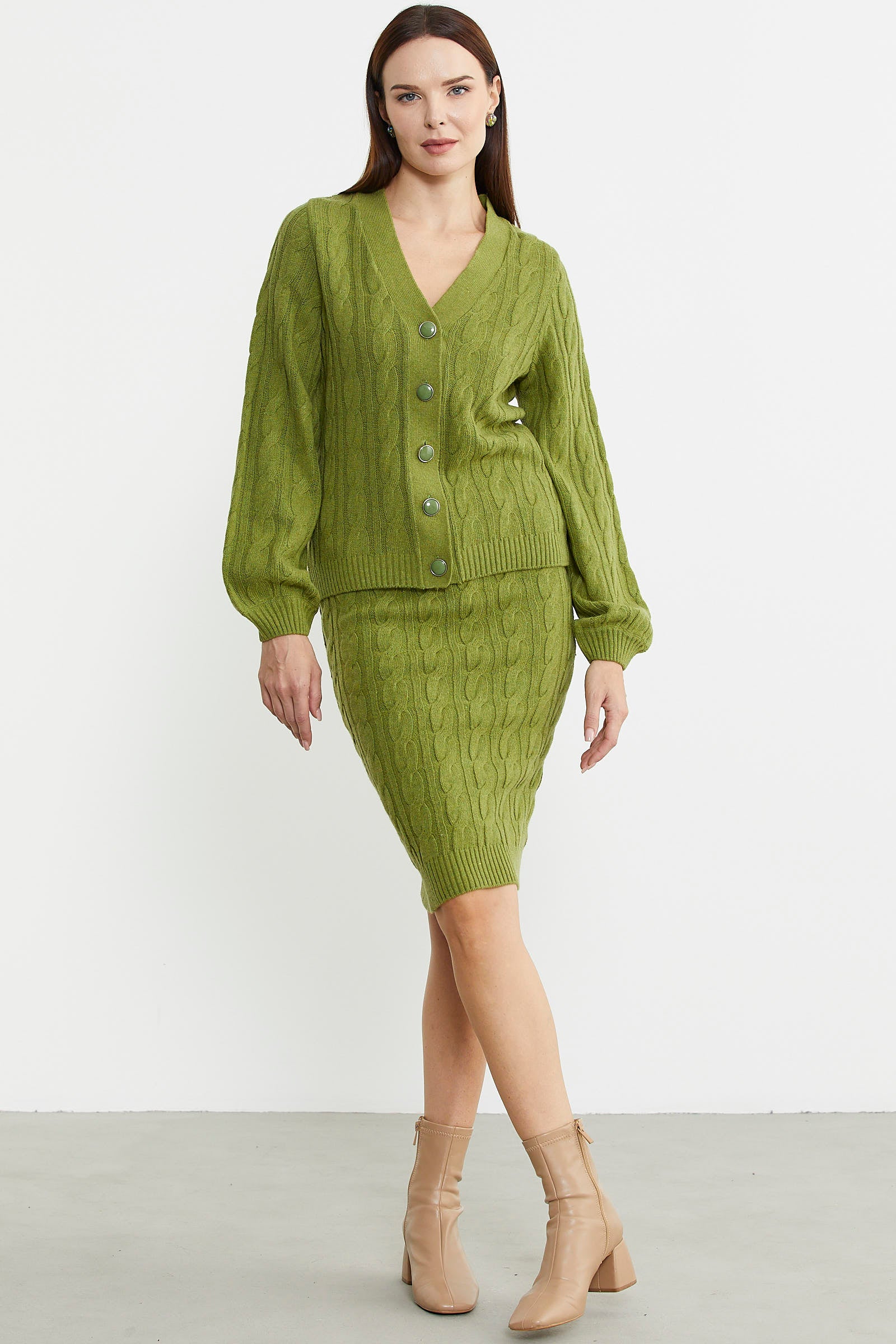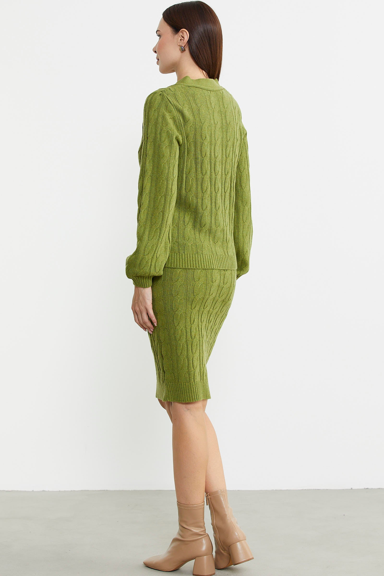Saç Örgüsü Motifli Etekli Yünlü Triko Takım - Yeşil