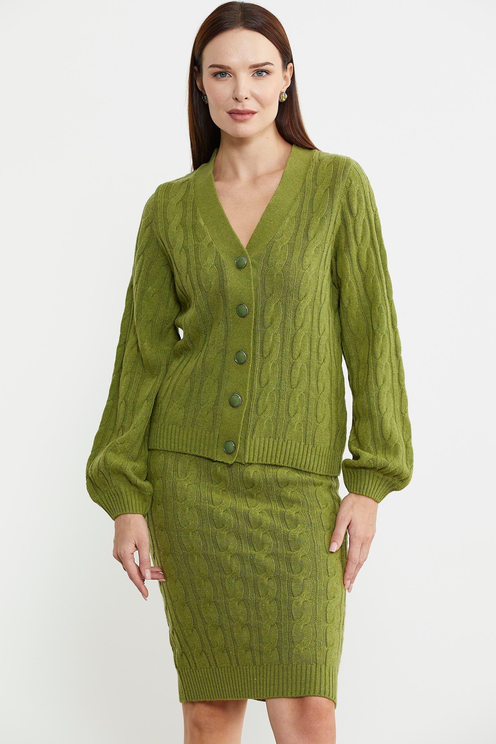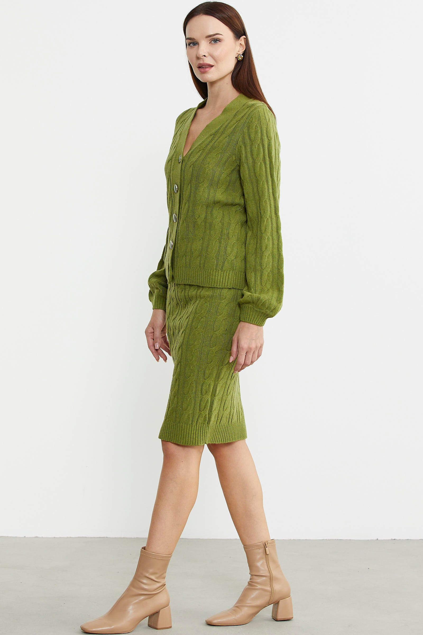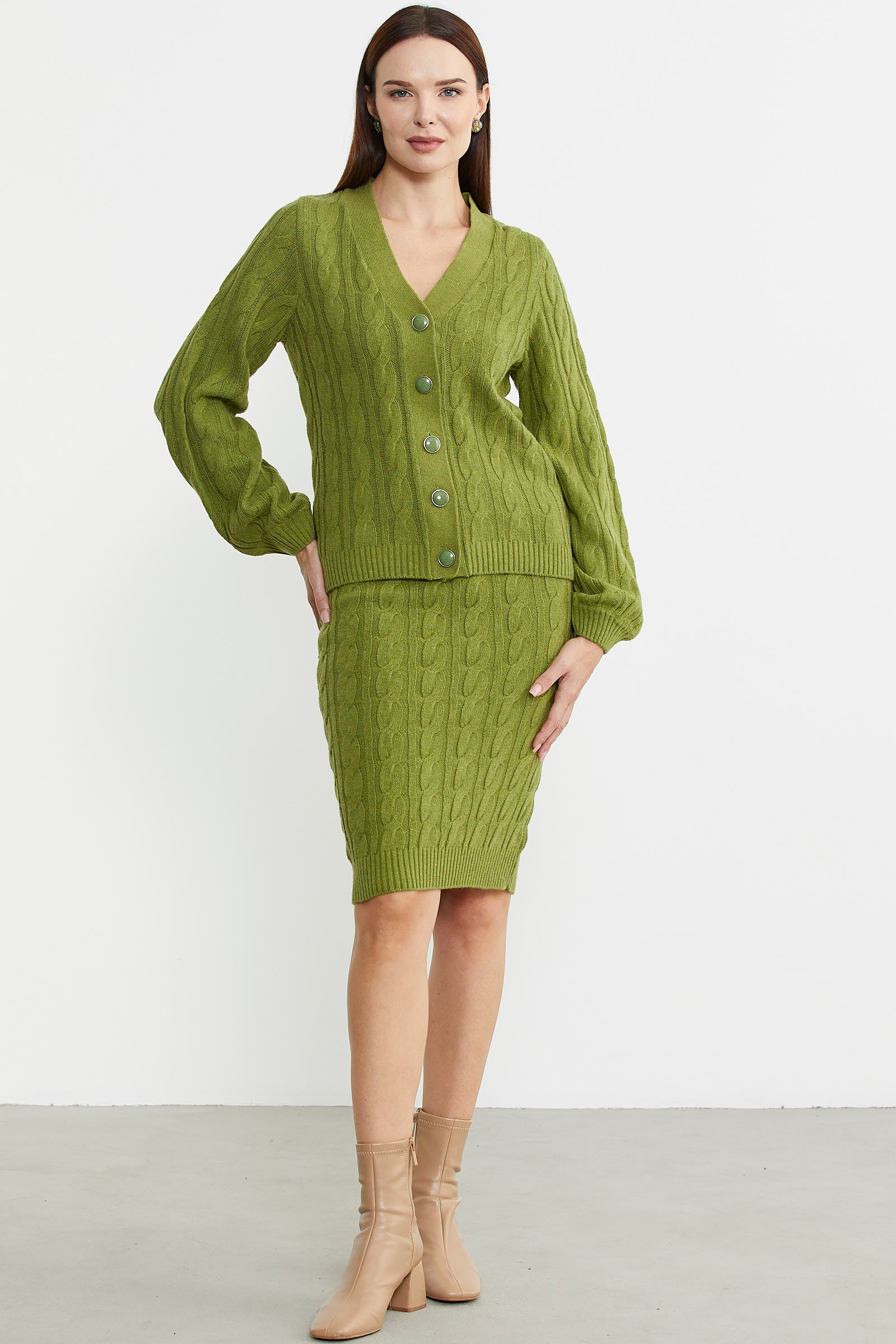 Saç Örgüsü Motifli Etekli Yünlü Triko Takım - Yeşil