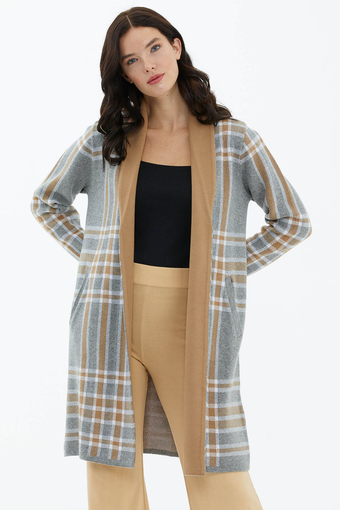 Şal Yaka Ekose Desenli Triko Hırka - Gri