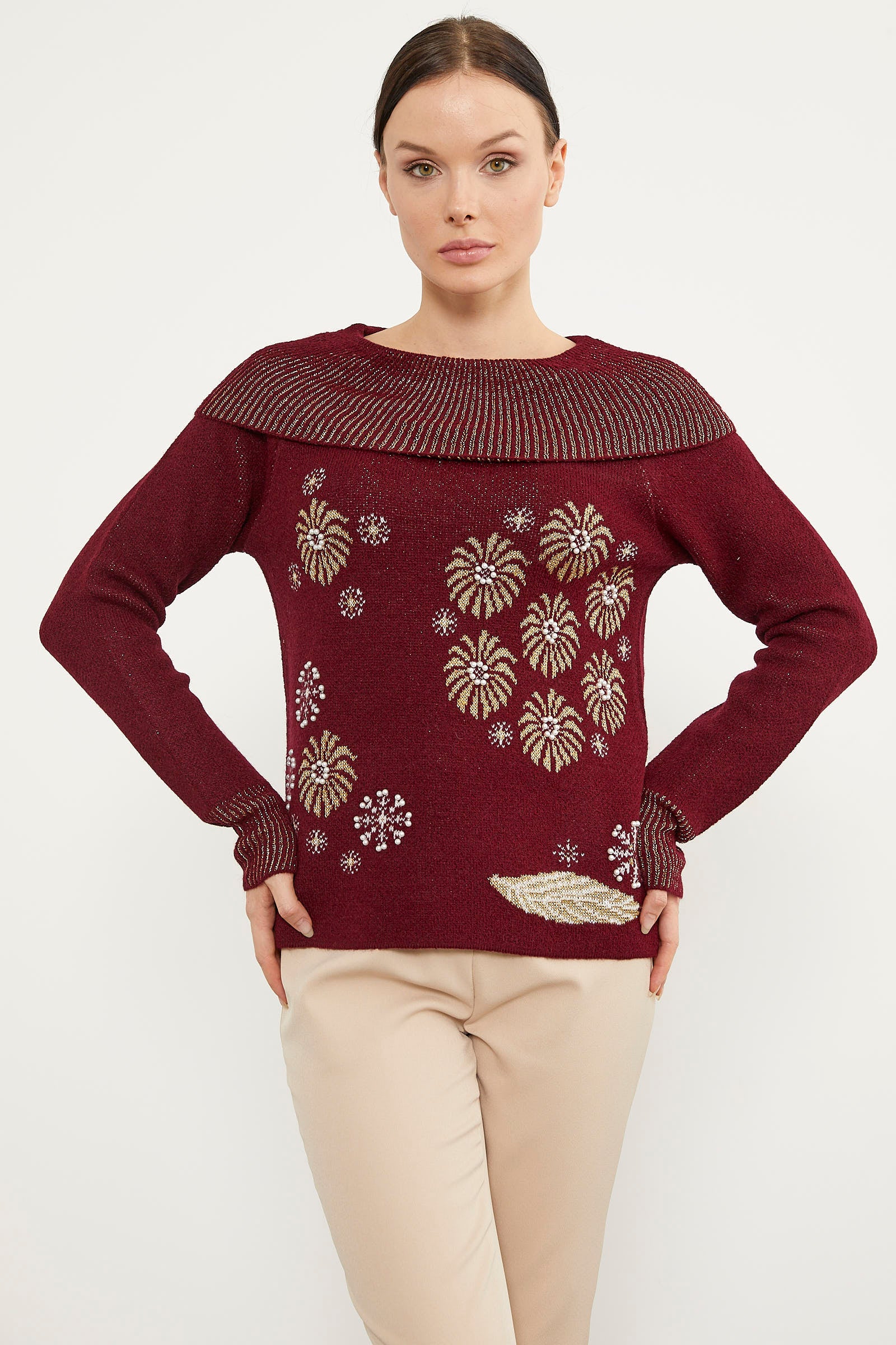 Şal Yaka İnci Zımbalı Triko Kazak - Bordo
