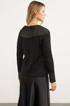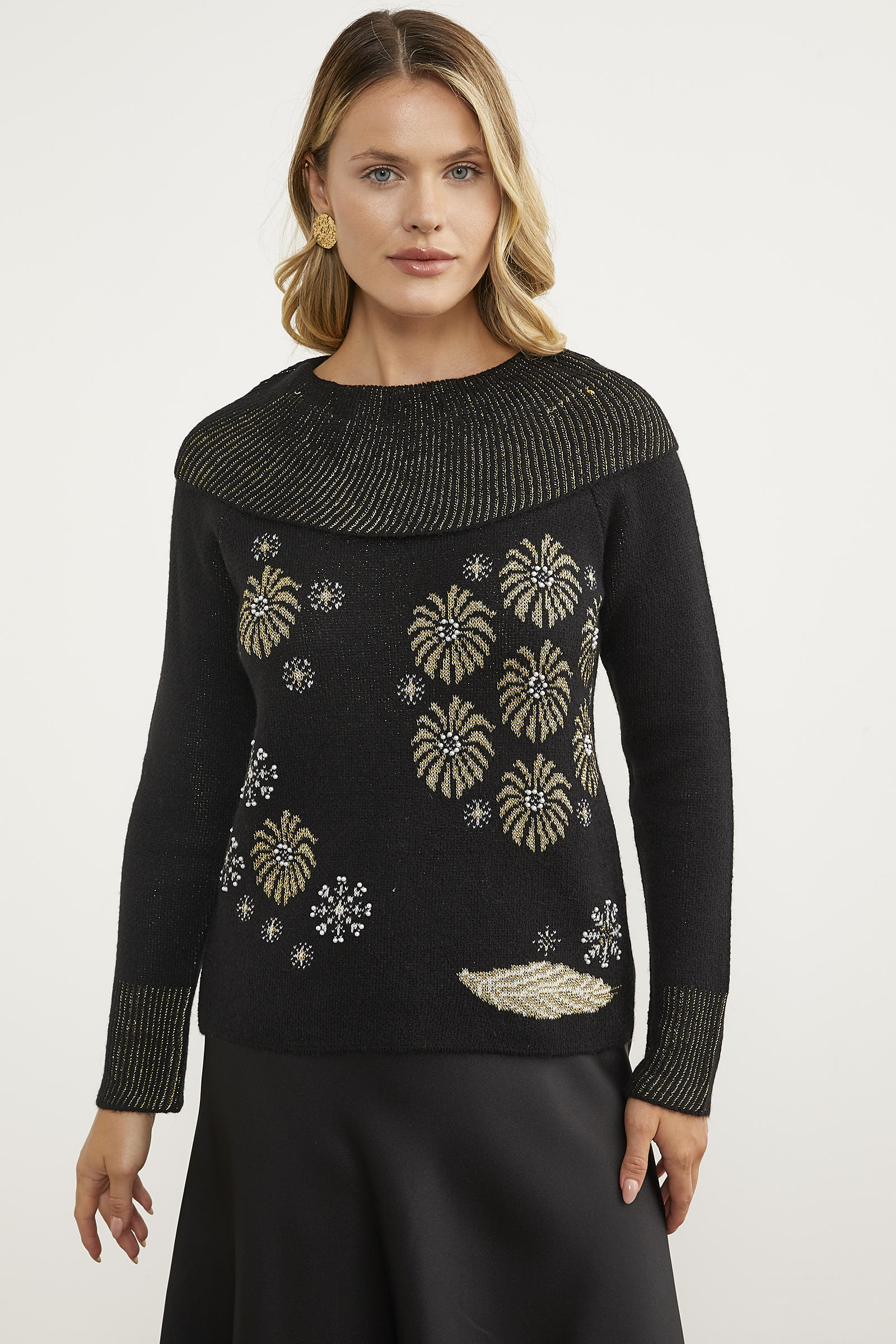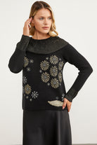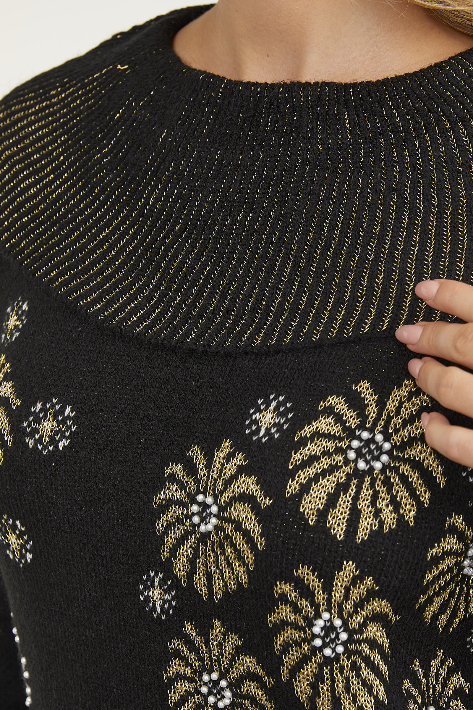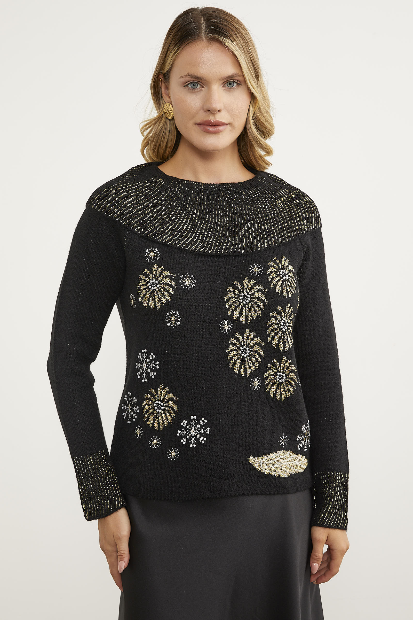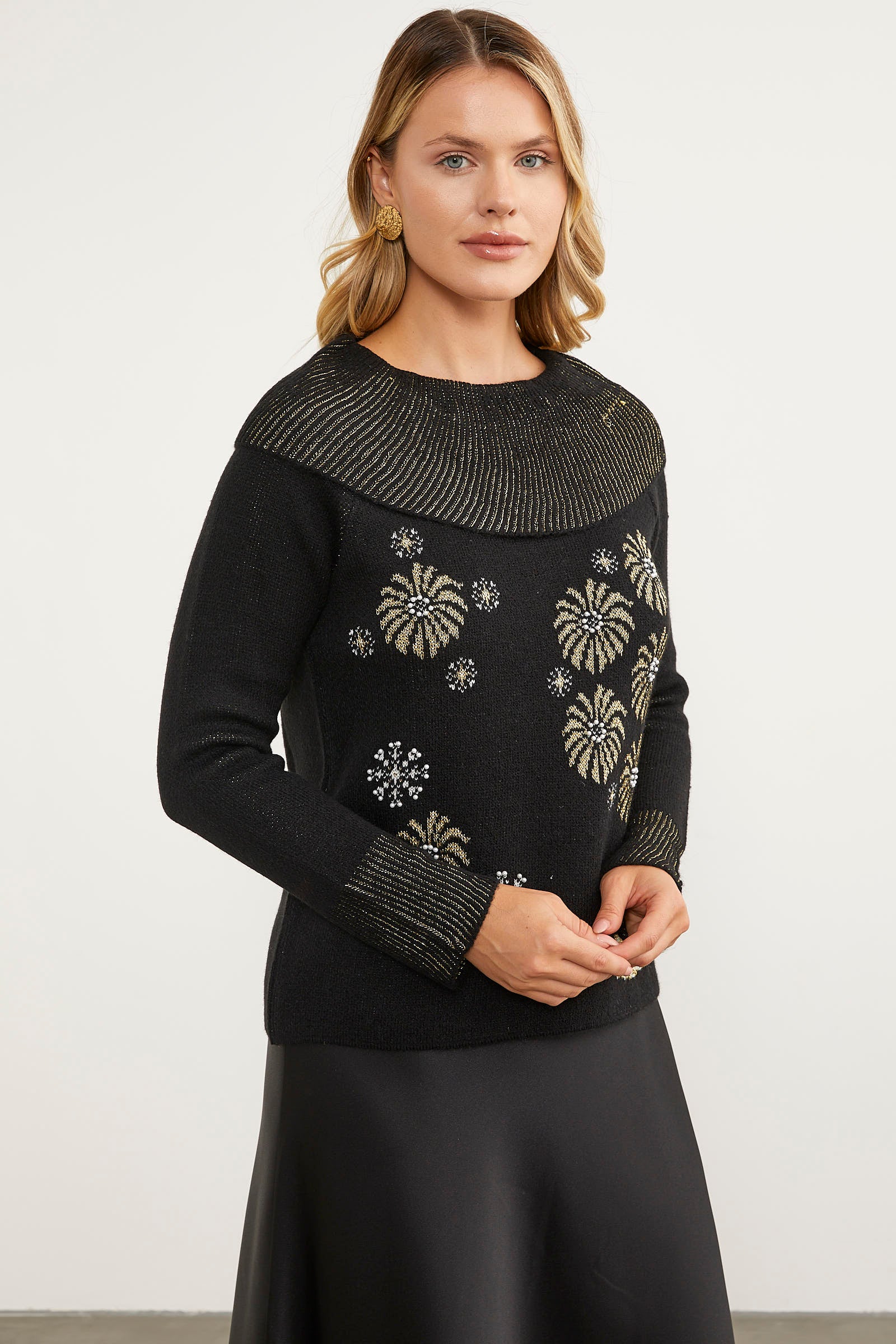 Şal Yaka İnci Zımbalı Triko Kazak - Siyah