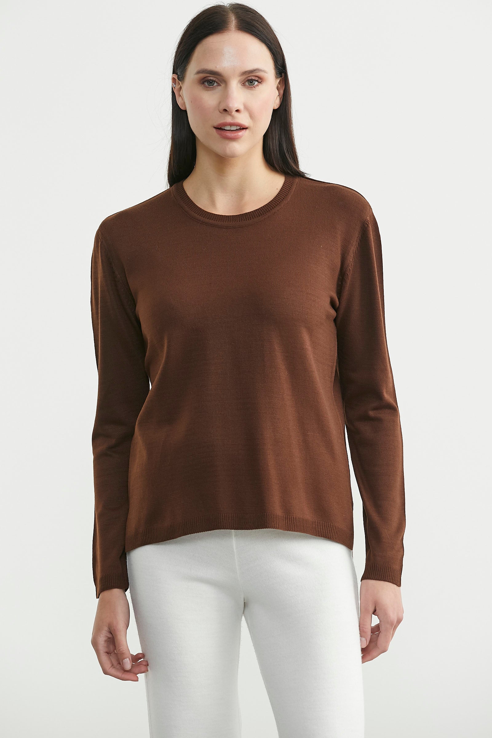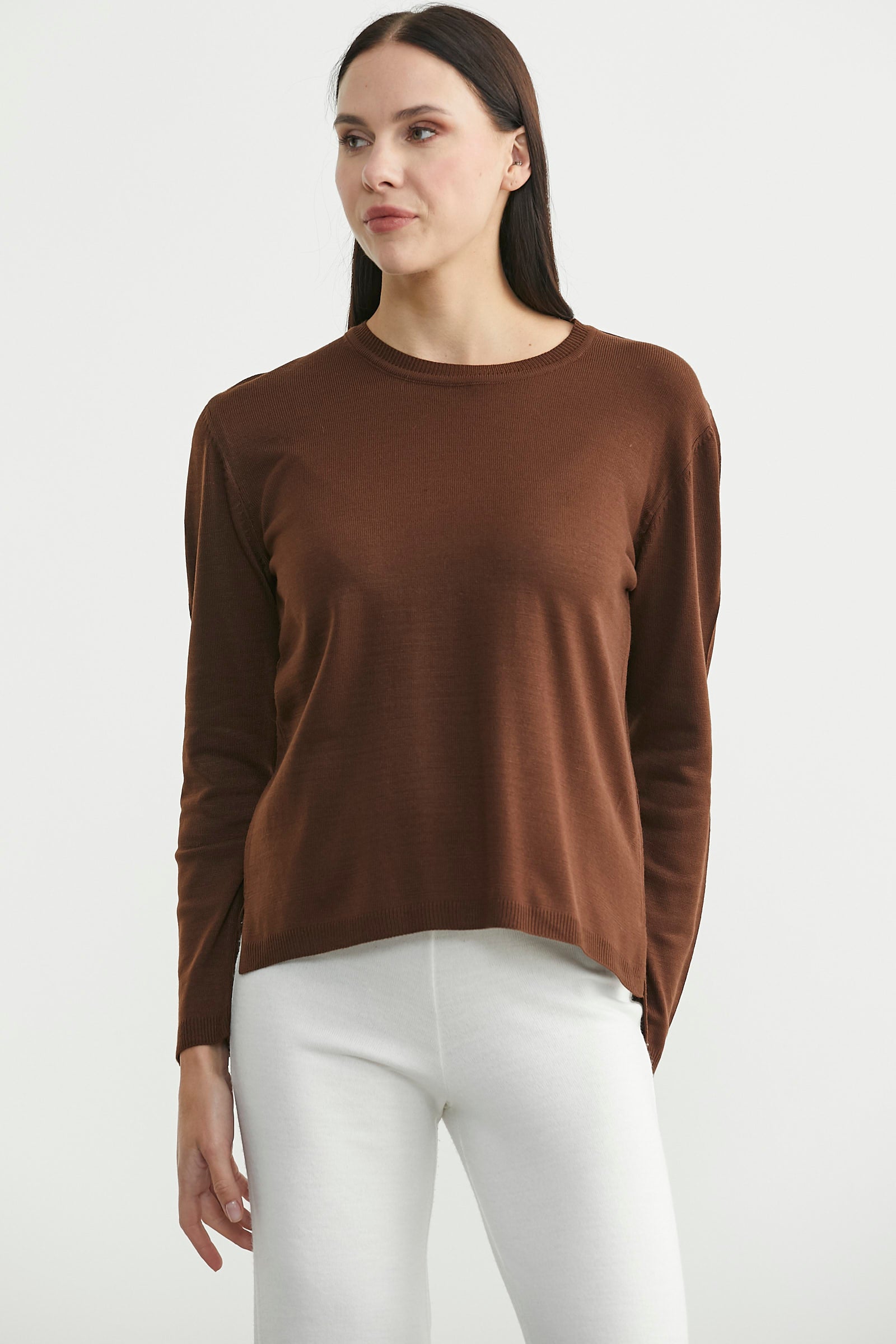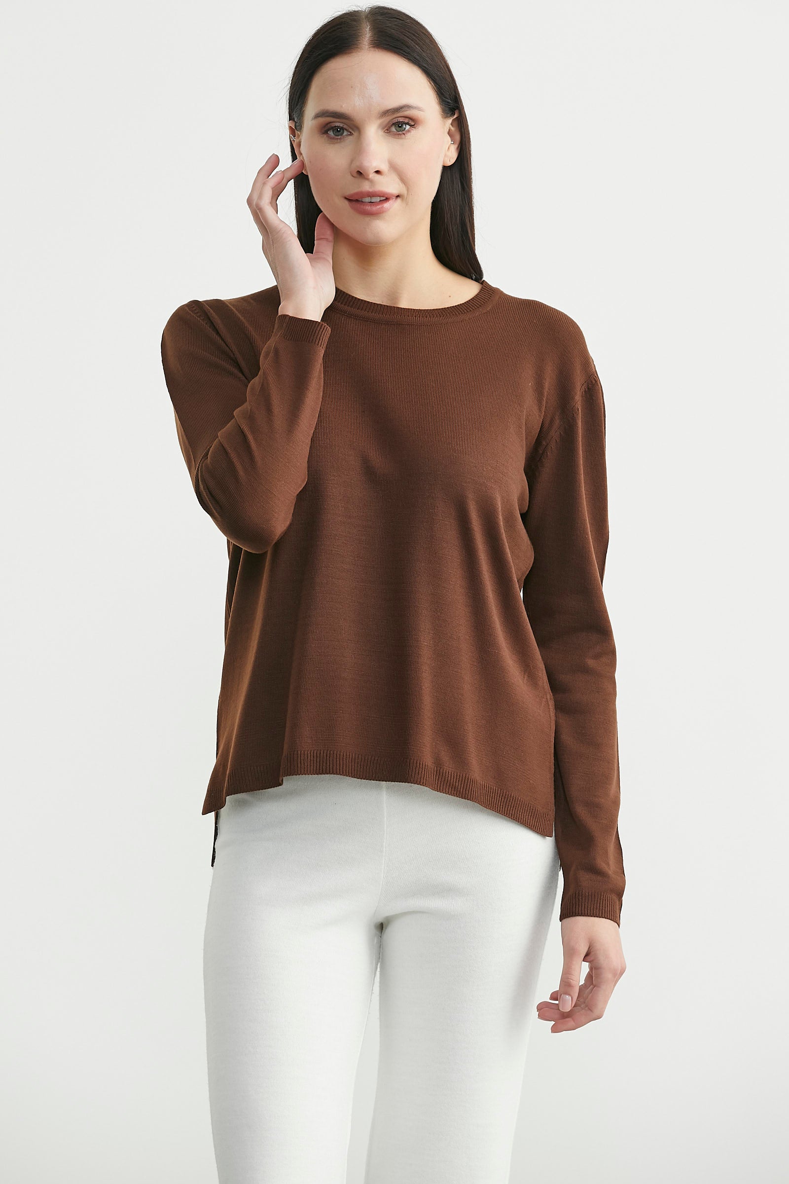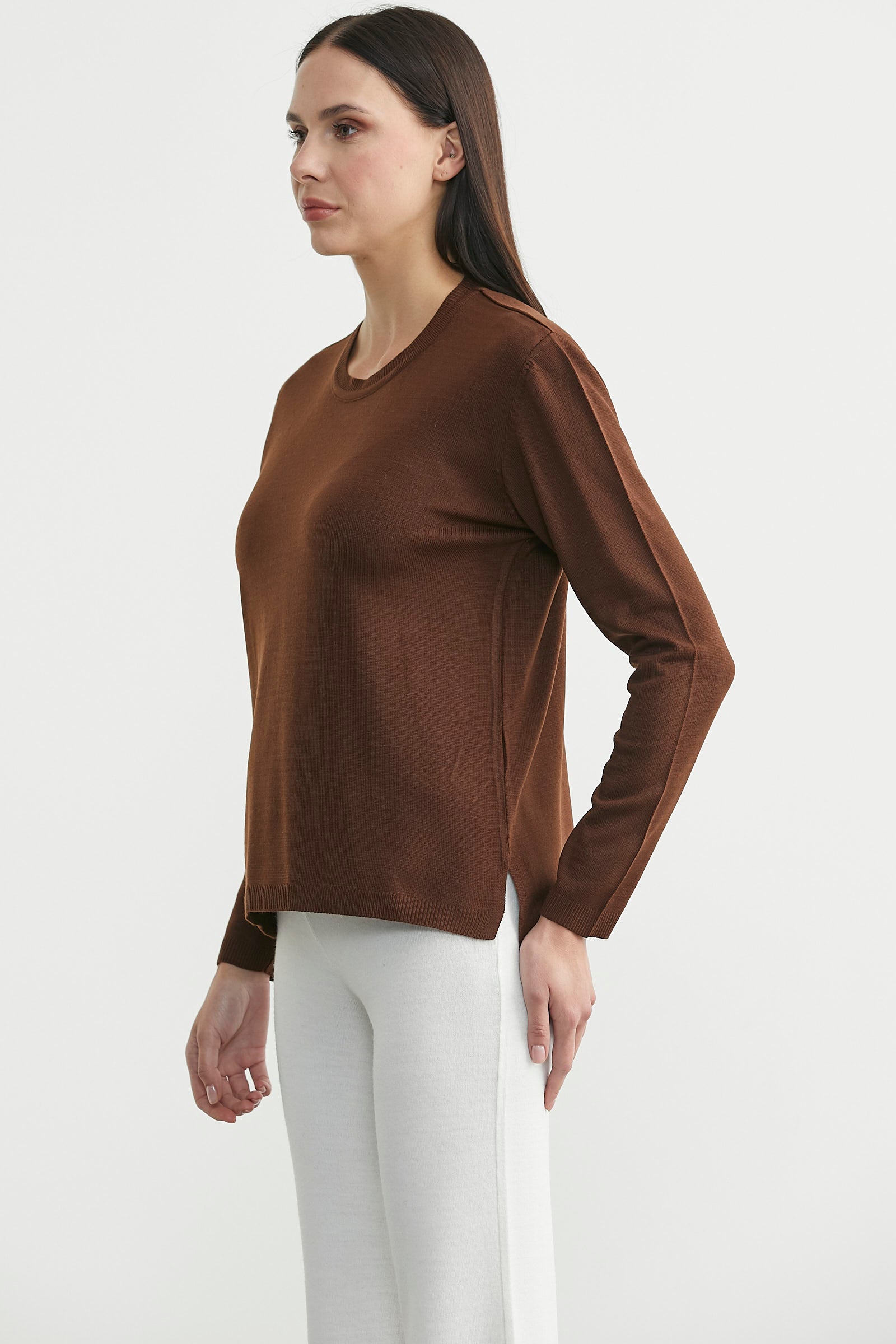 Yuvarlak yaka, arkası uzun, yanı yırtmaçlı, basic triko kazak.