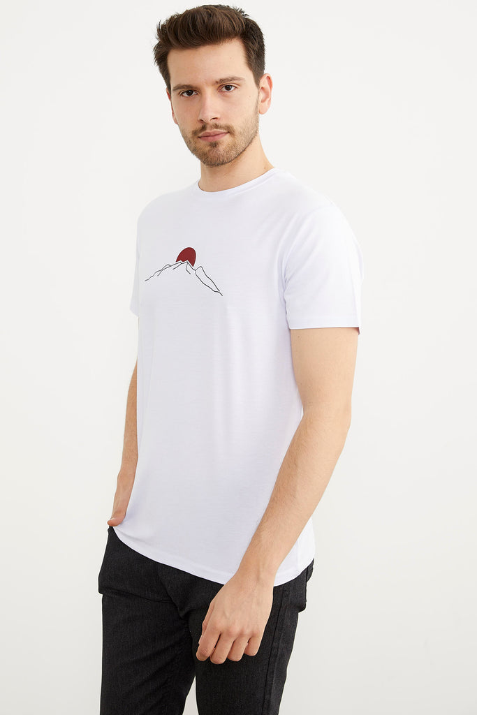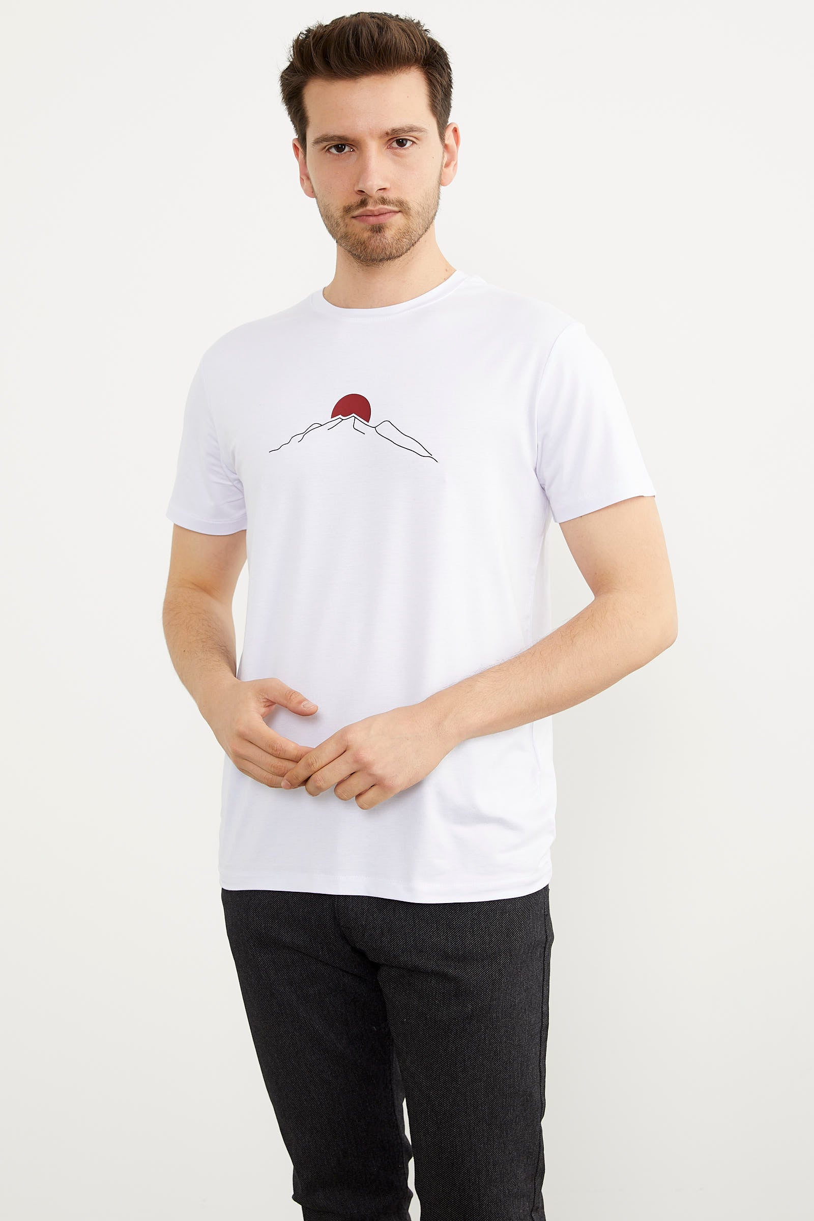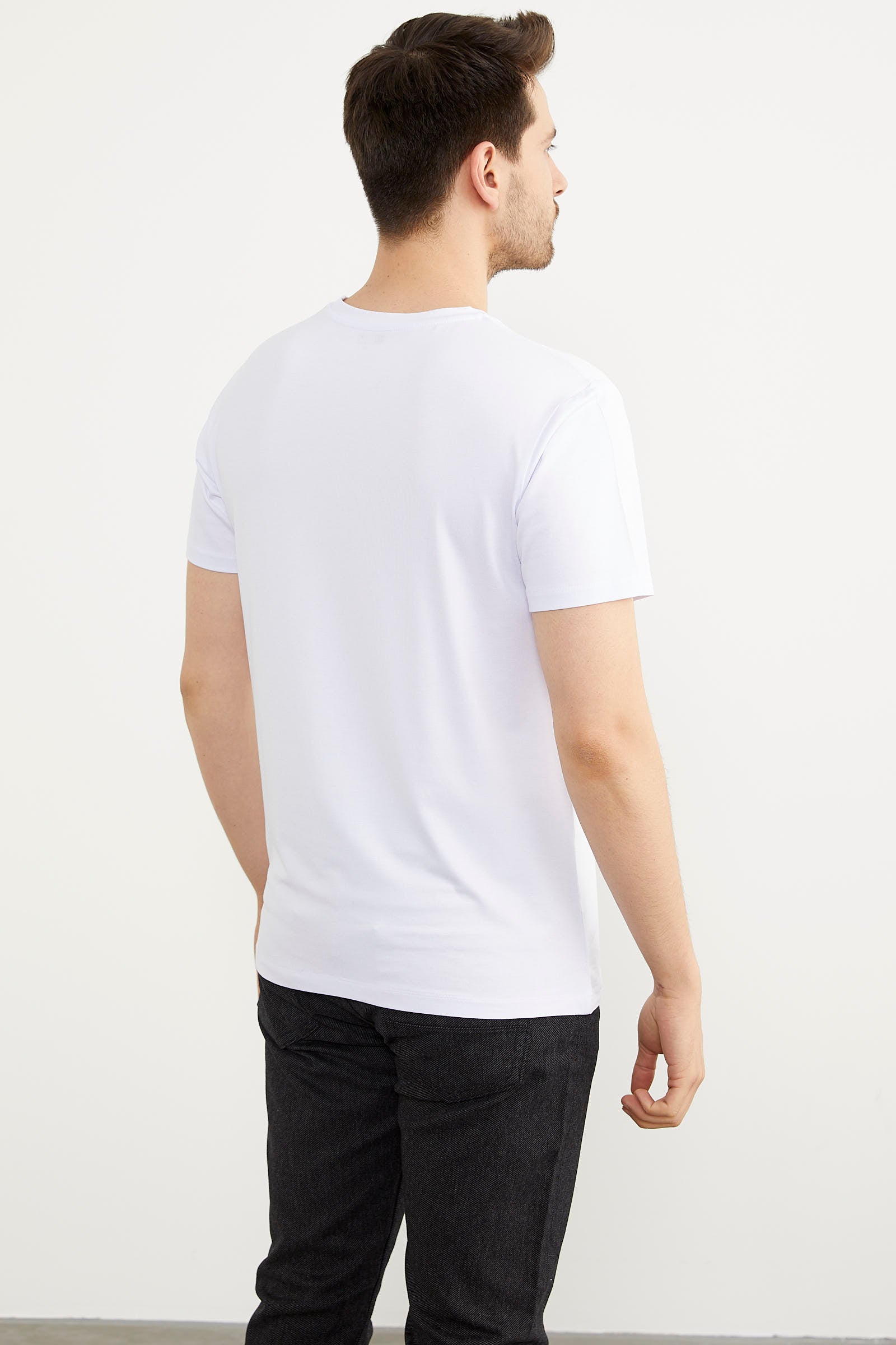 Sıfır Yaka Baskılı Kısa Kol Tişört - Beyaz