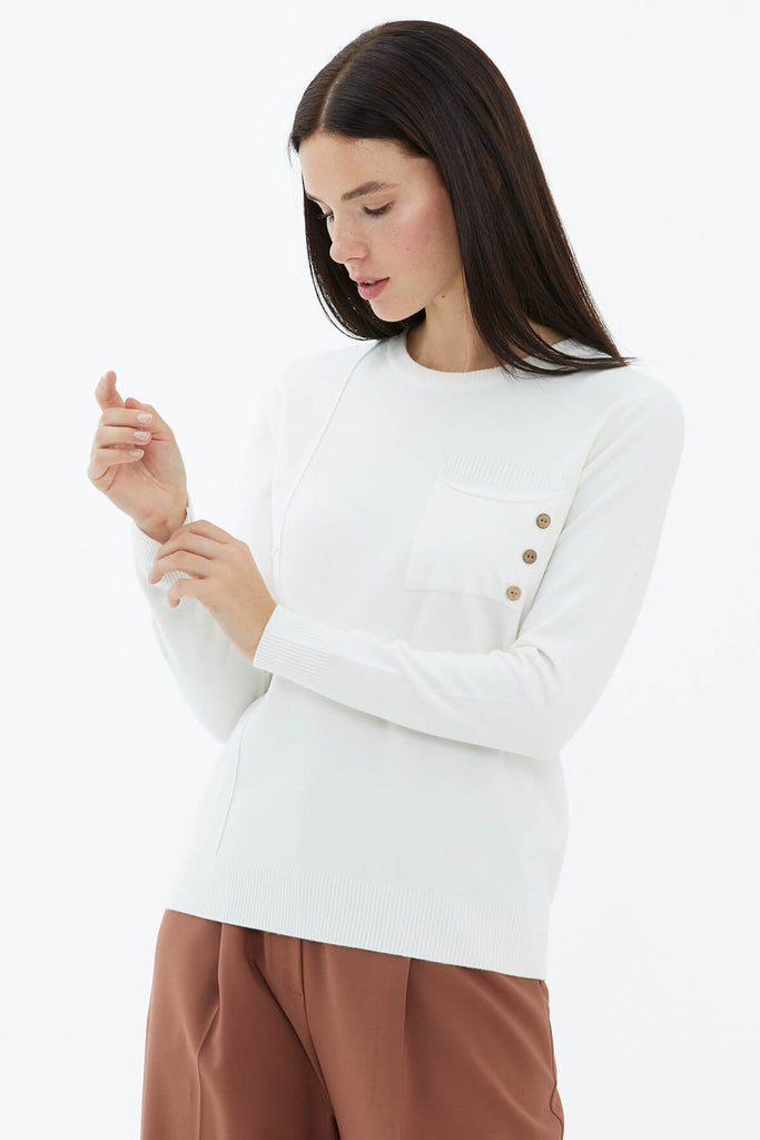 Sıfır Yaka Cepli Düğmeli Triko Kazak - Beyaz