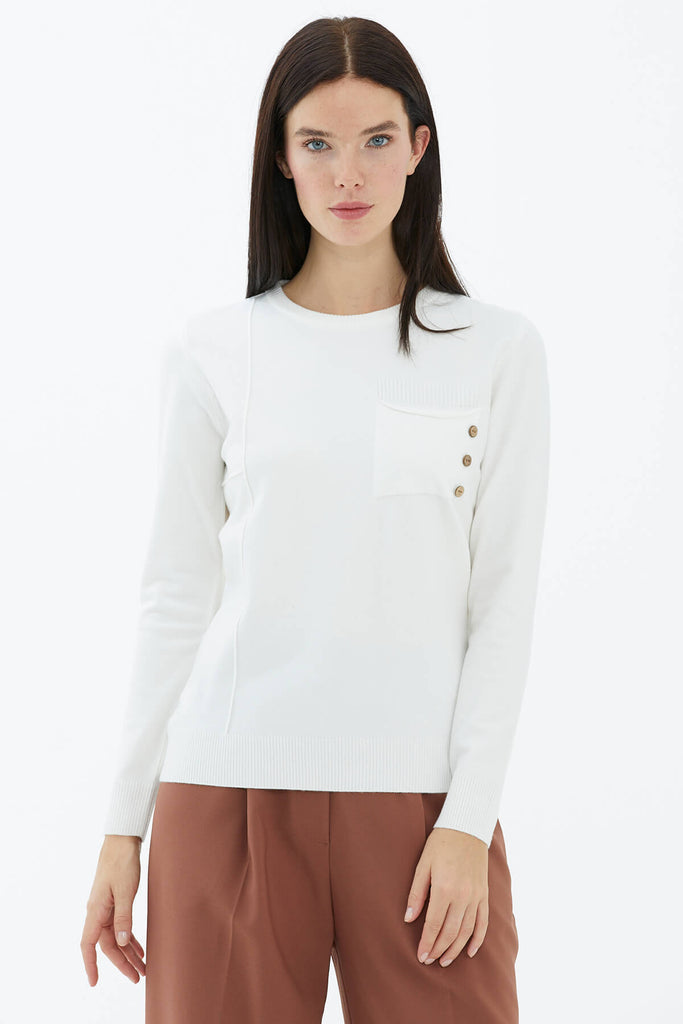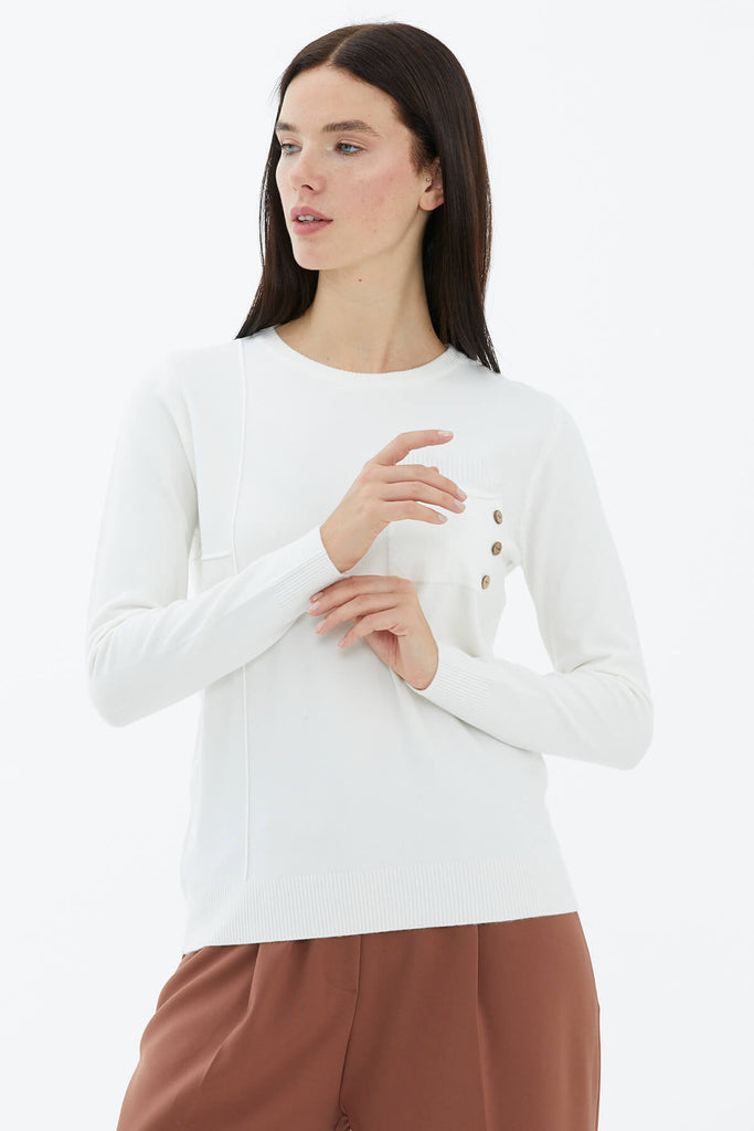 Sıfır yaka, uzun kollu basic triko kazak. Göğüs cebi üzerinde ahşap düğme aksesuarı yer almaktadır.