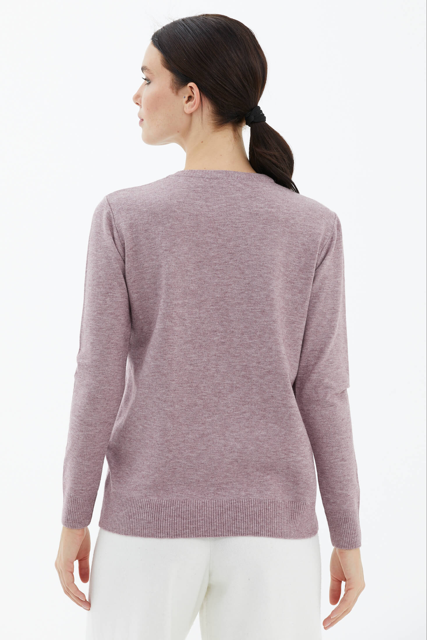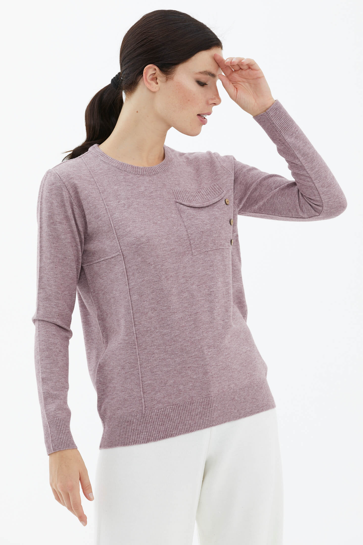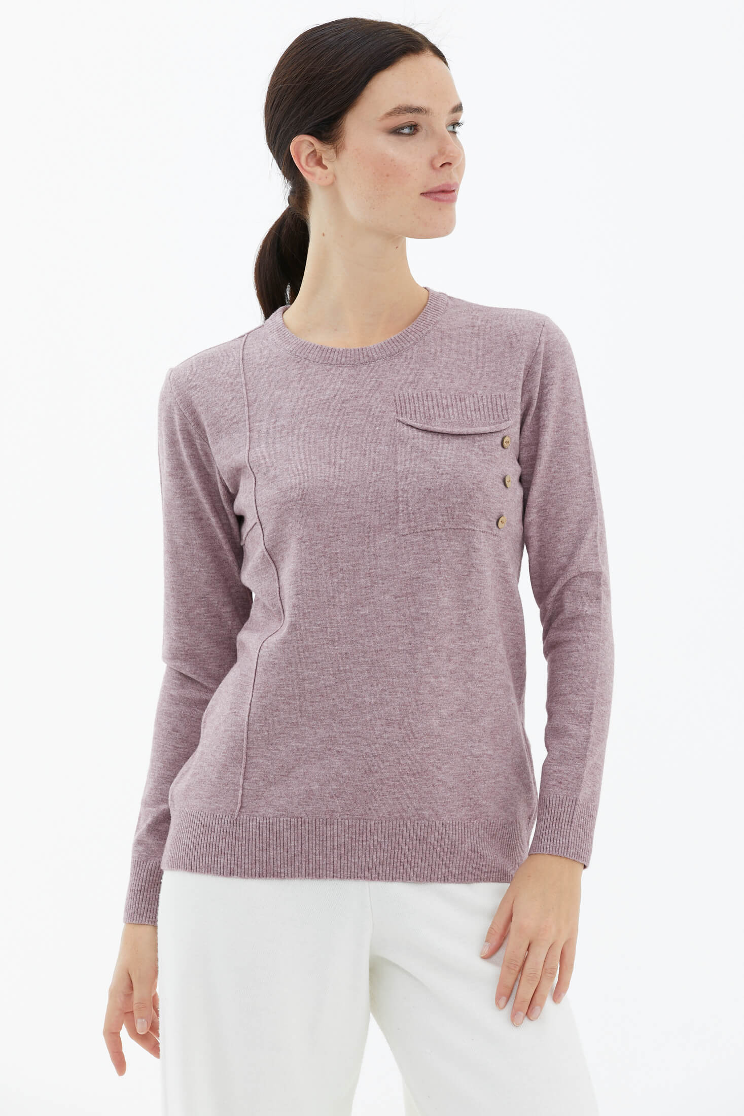 Sıfır yaka, uzun kollu basic triko kazak. Göğüs cebi üzerinde ahşap düğme aksesuarı yer almaktadır.