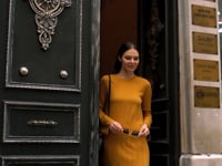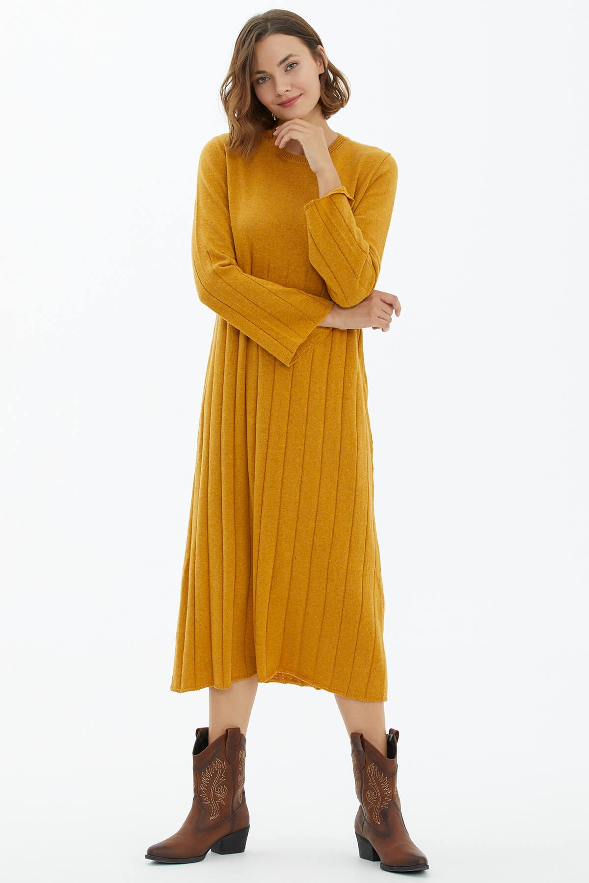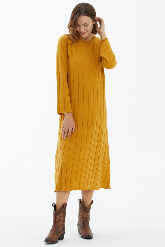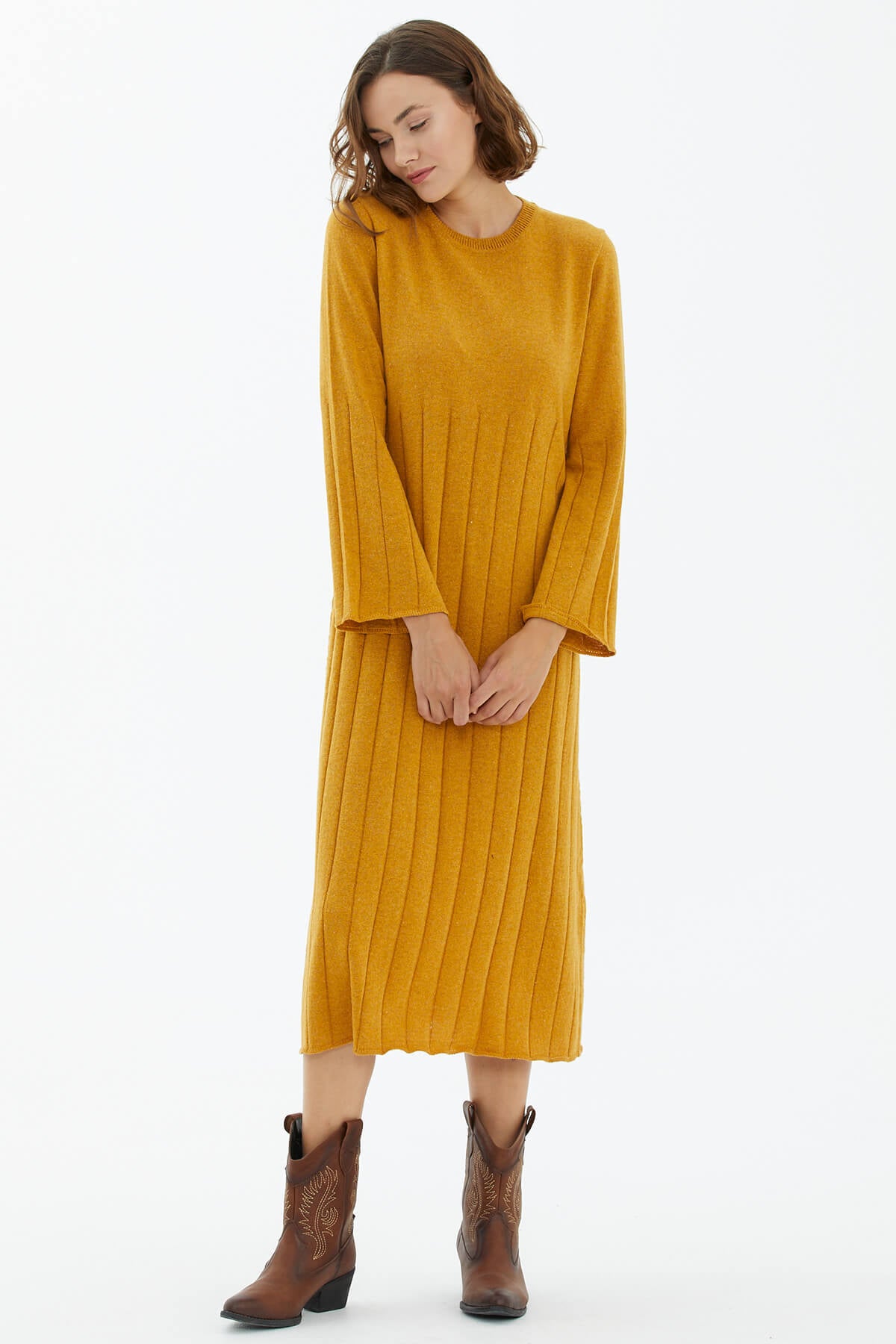Yün karışımlı iplikten üretilen, yumuşak lastik örgülü diz altı elbise. Rahat kesimli, sıfır yakalı, uzun çan kollu triko elbise ile şıklık ve konforu yakalayın.