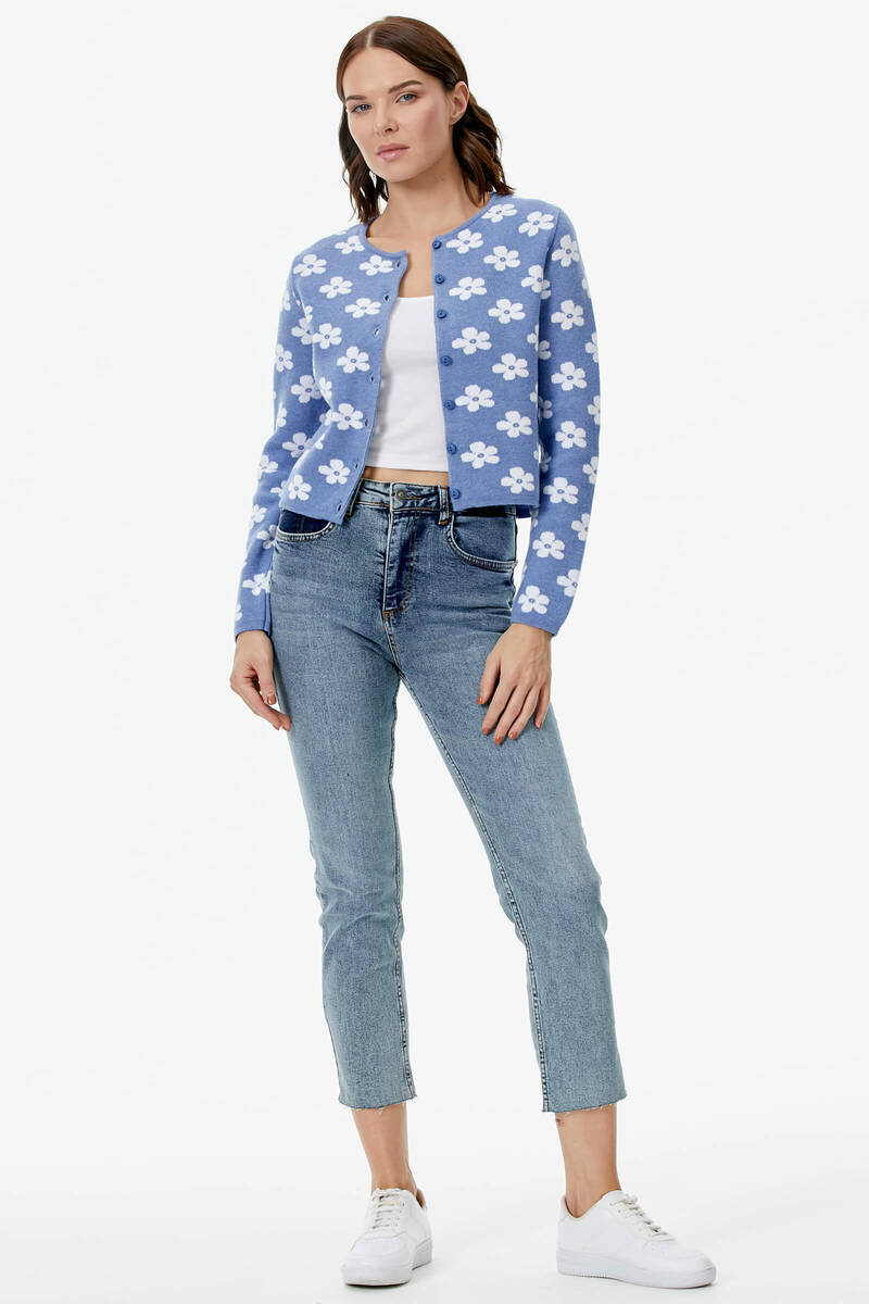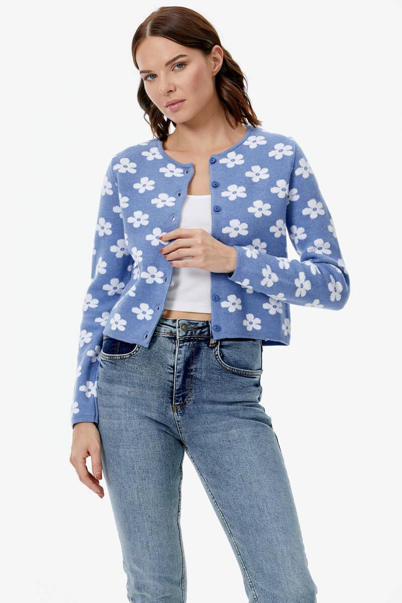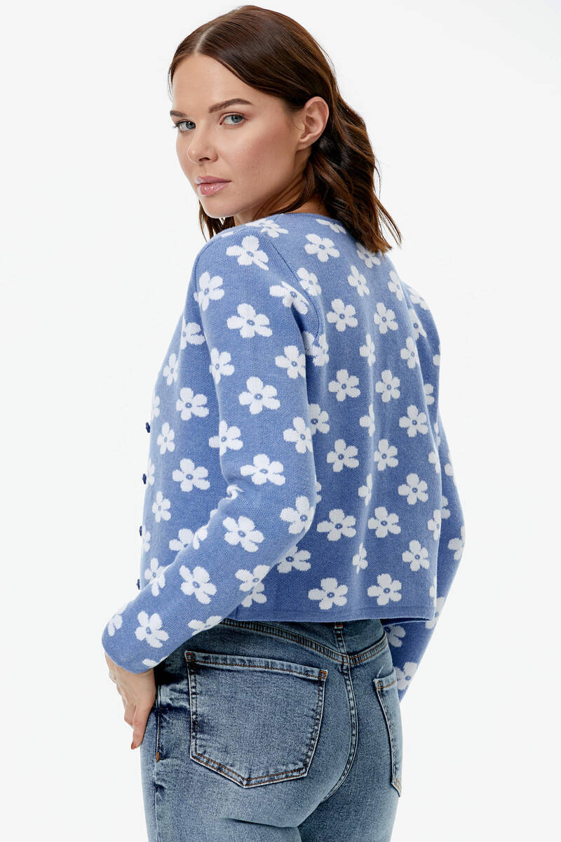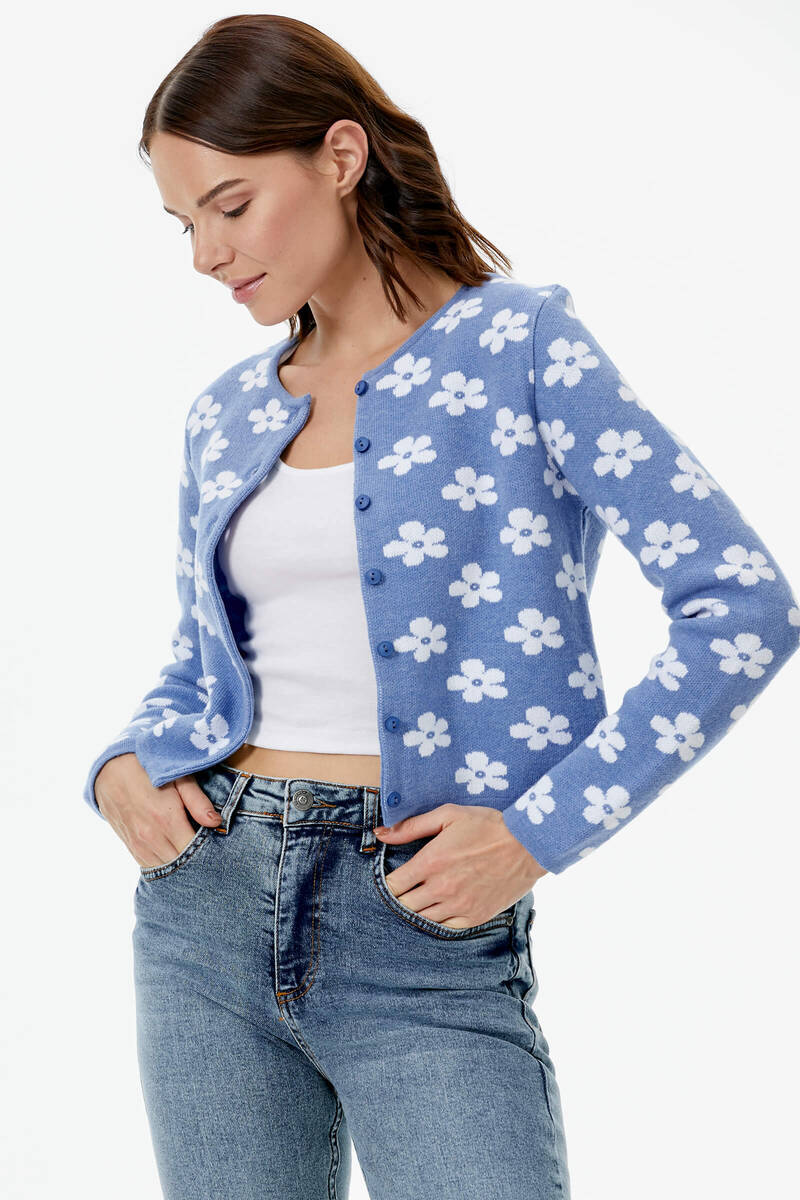 Sıfır Yaka Düğmeli Çiçek Desenli Triko Hırka - Mavi