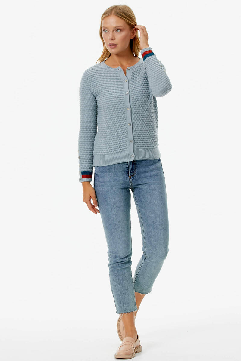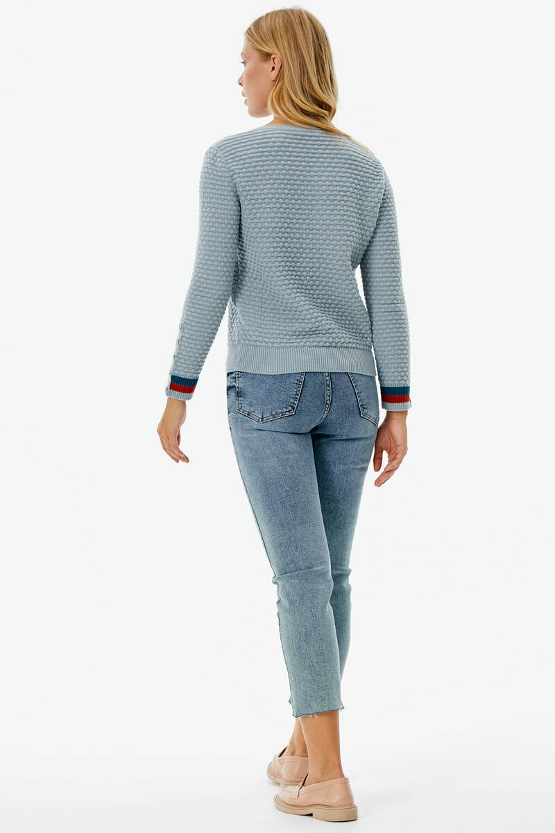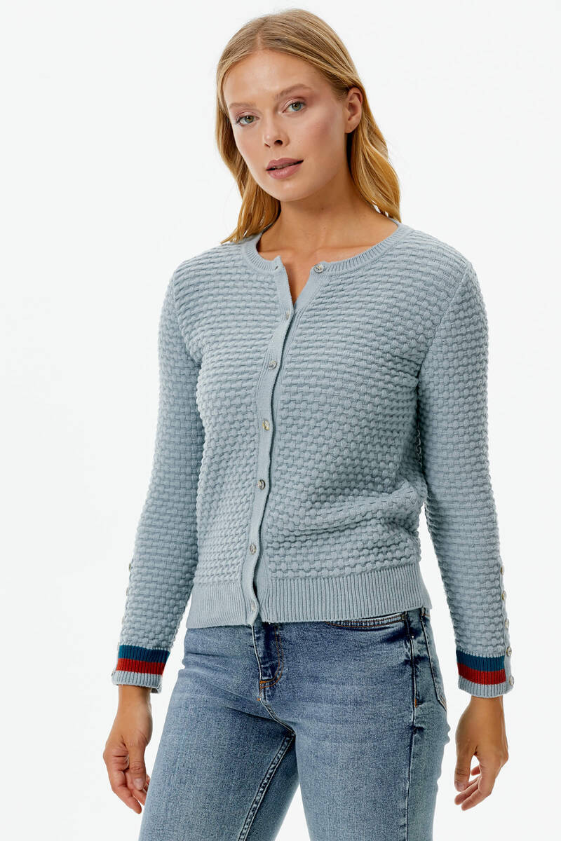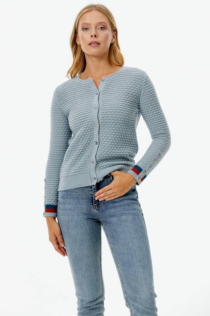 Sıfır Yaka Düğmeli Petek Desenli Triko Hırka - Mavi