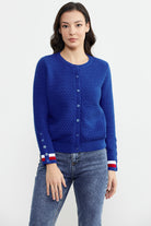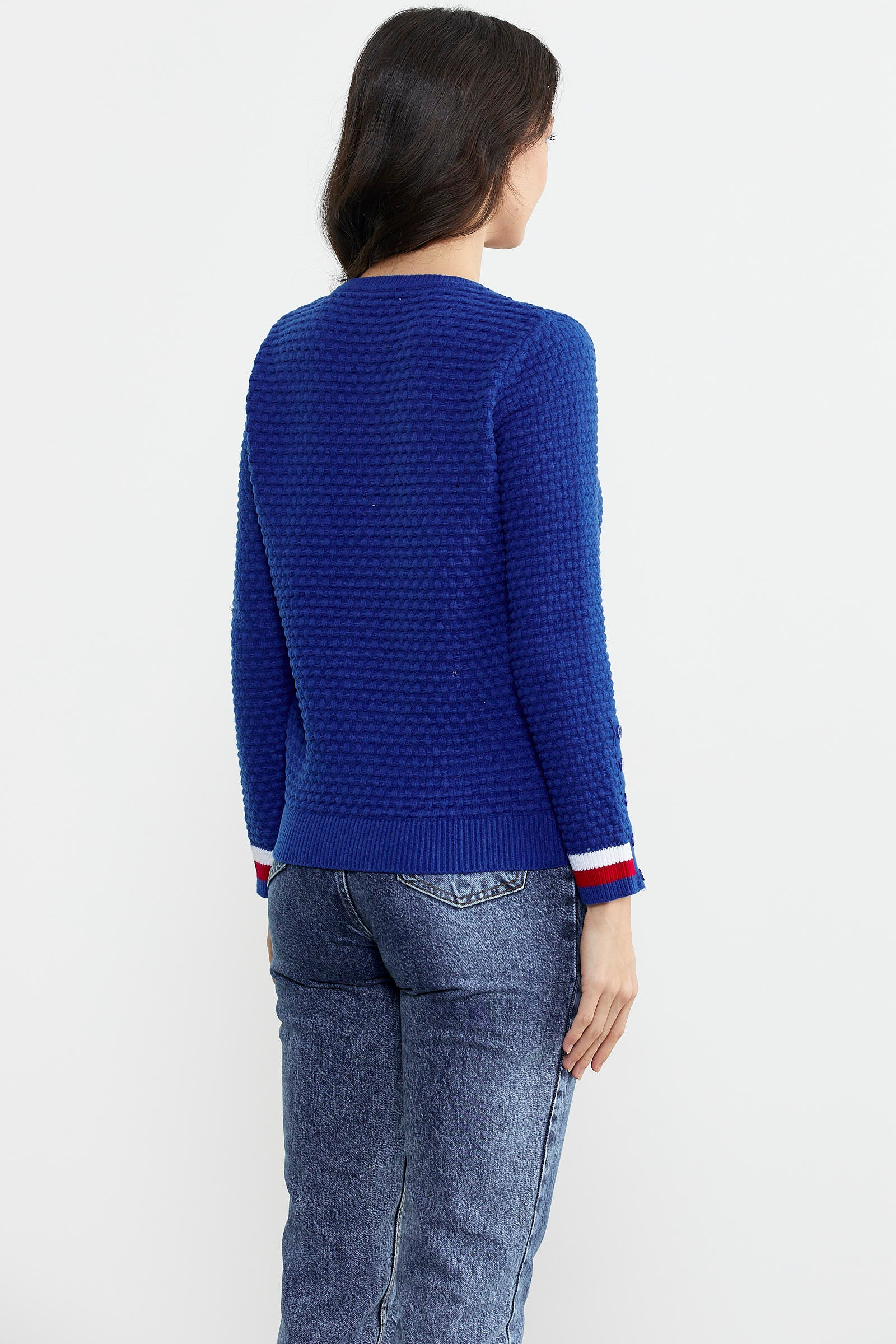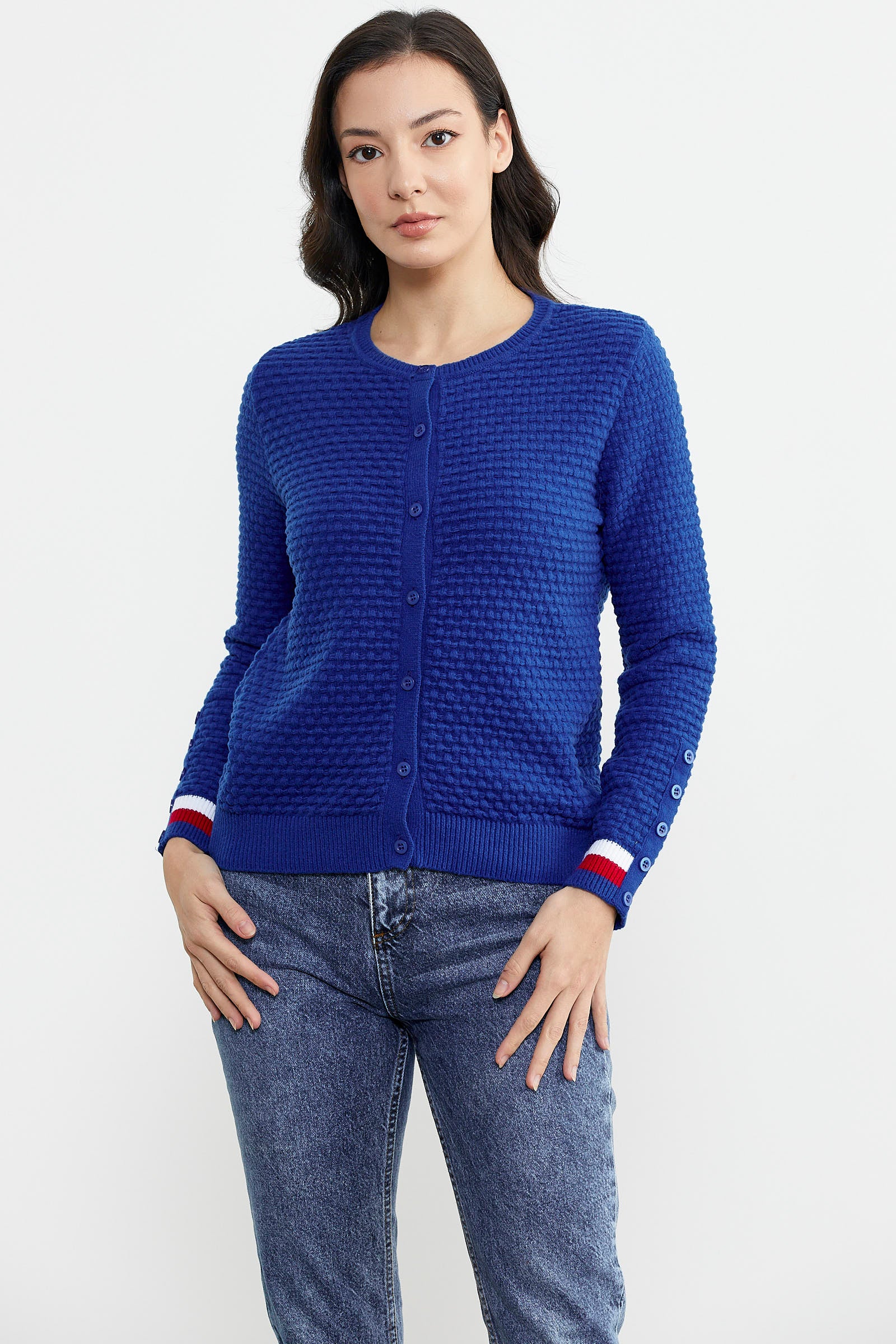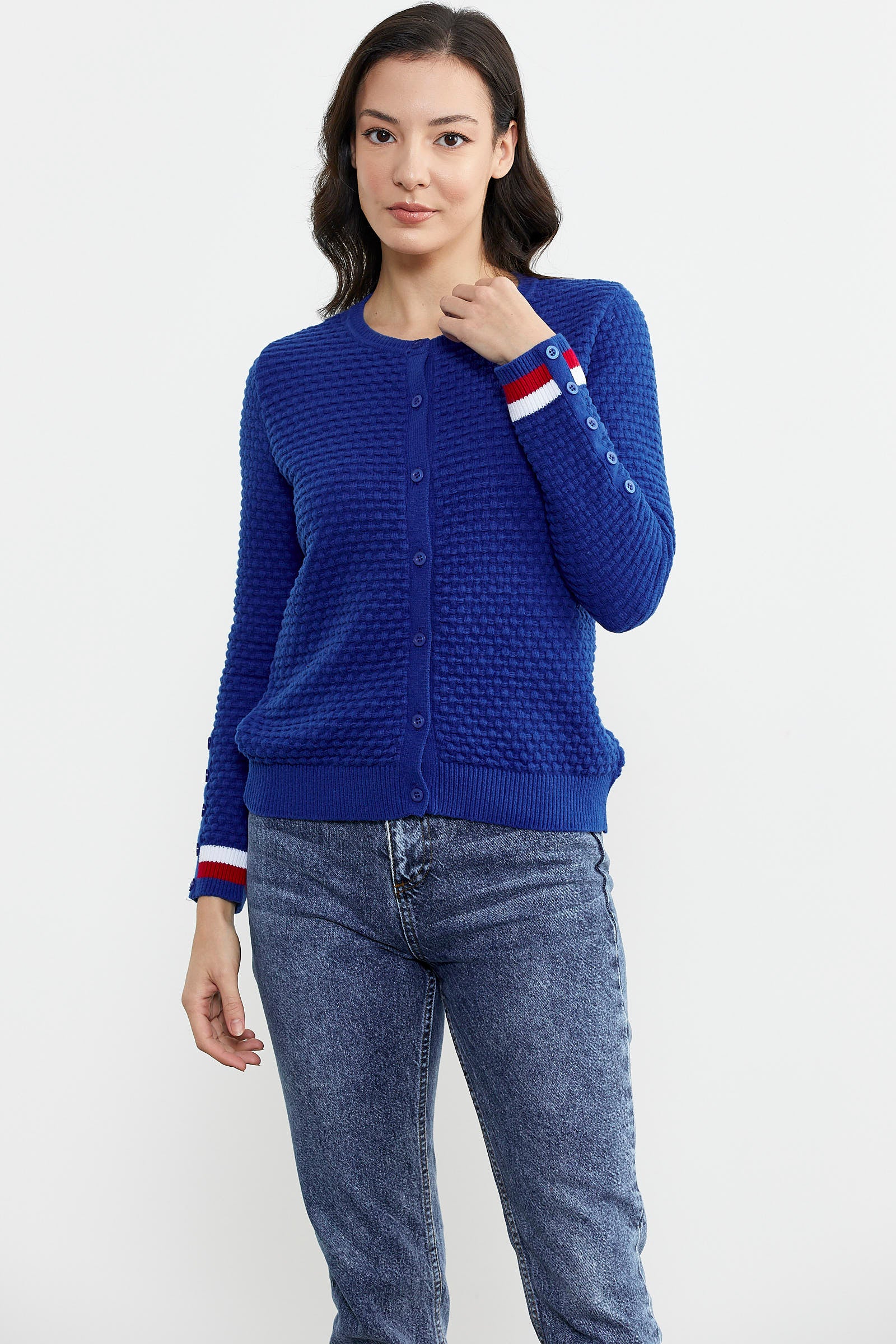 Sıfır Yaka Düğmeli Petek Desenli Triko Hırka - Saks