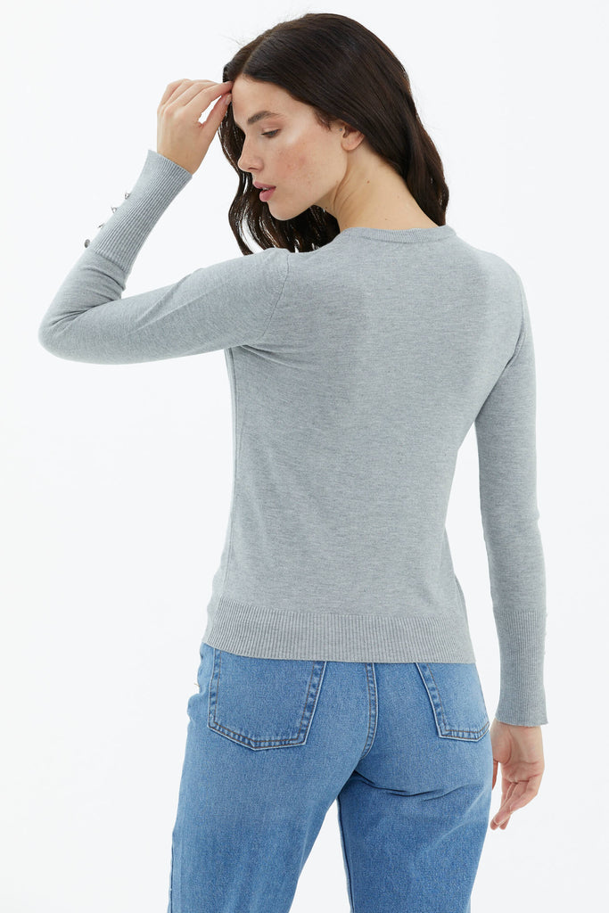 Sıfır Yaka Kolu Düğmeli Triko Kazak - Gri
