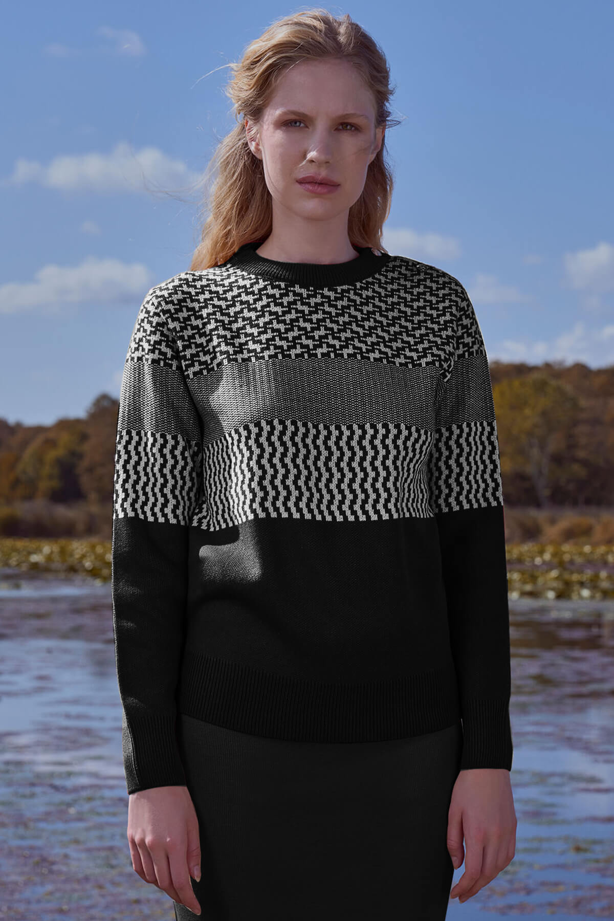 Yumuşak dokusuyla soğuk havalarda içinizi ısıtacak, sıfır yaka, omuzu düğme kapamalı, yaka, manşet ve etek ucu lastik örgülü, desenli kazak ile kış stilinizi güçlendirin.