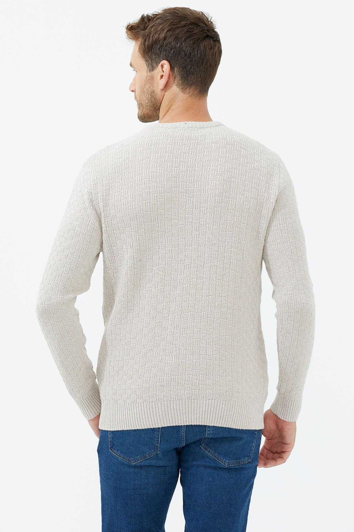 Yün karışımlı iplikten üretilmiş yumuşak dokusu ile gün boyu konforlu hissetmeni sağlayan uzun kollu, sıfır yakalı triko kazak.