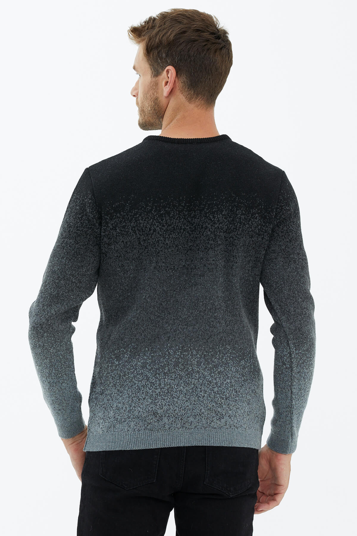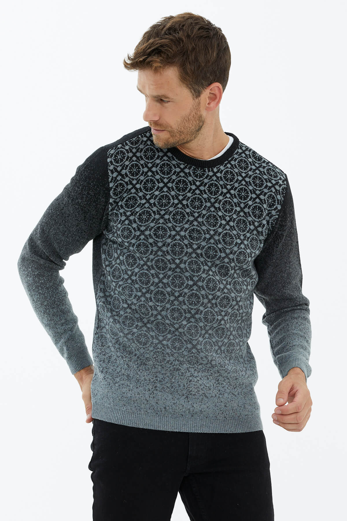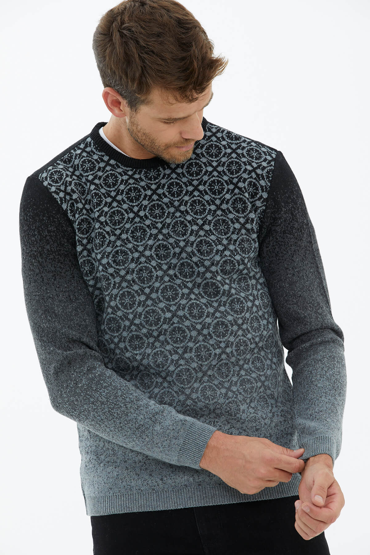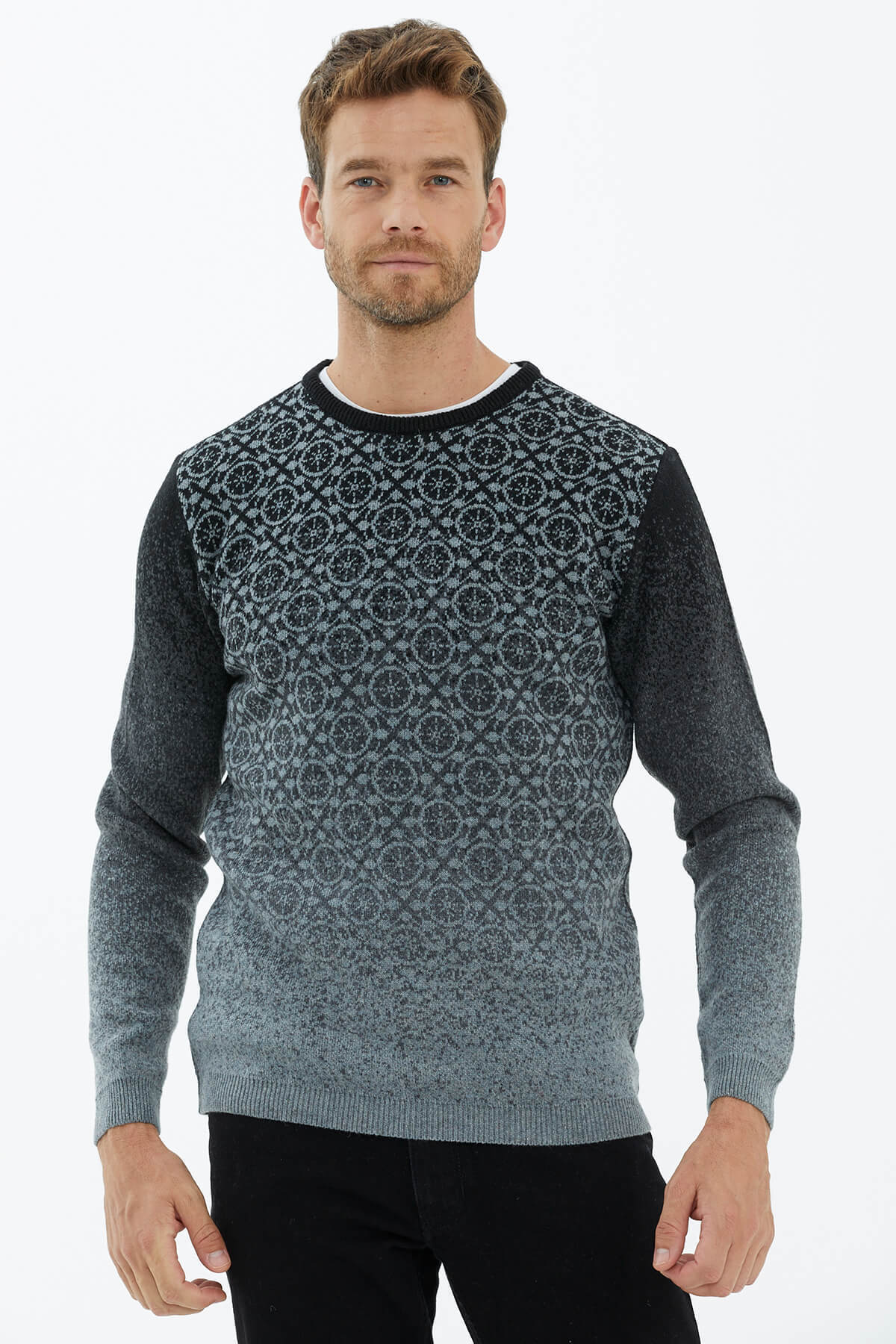 Yün karışımlı iplikten üretilen, uzun kollu, yakası, manşetleri ve etek ucu lastik örgülü, desenli triko kazak.