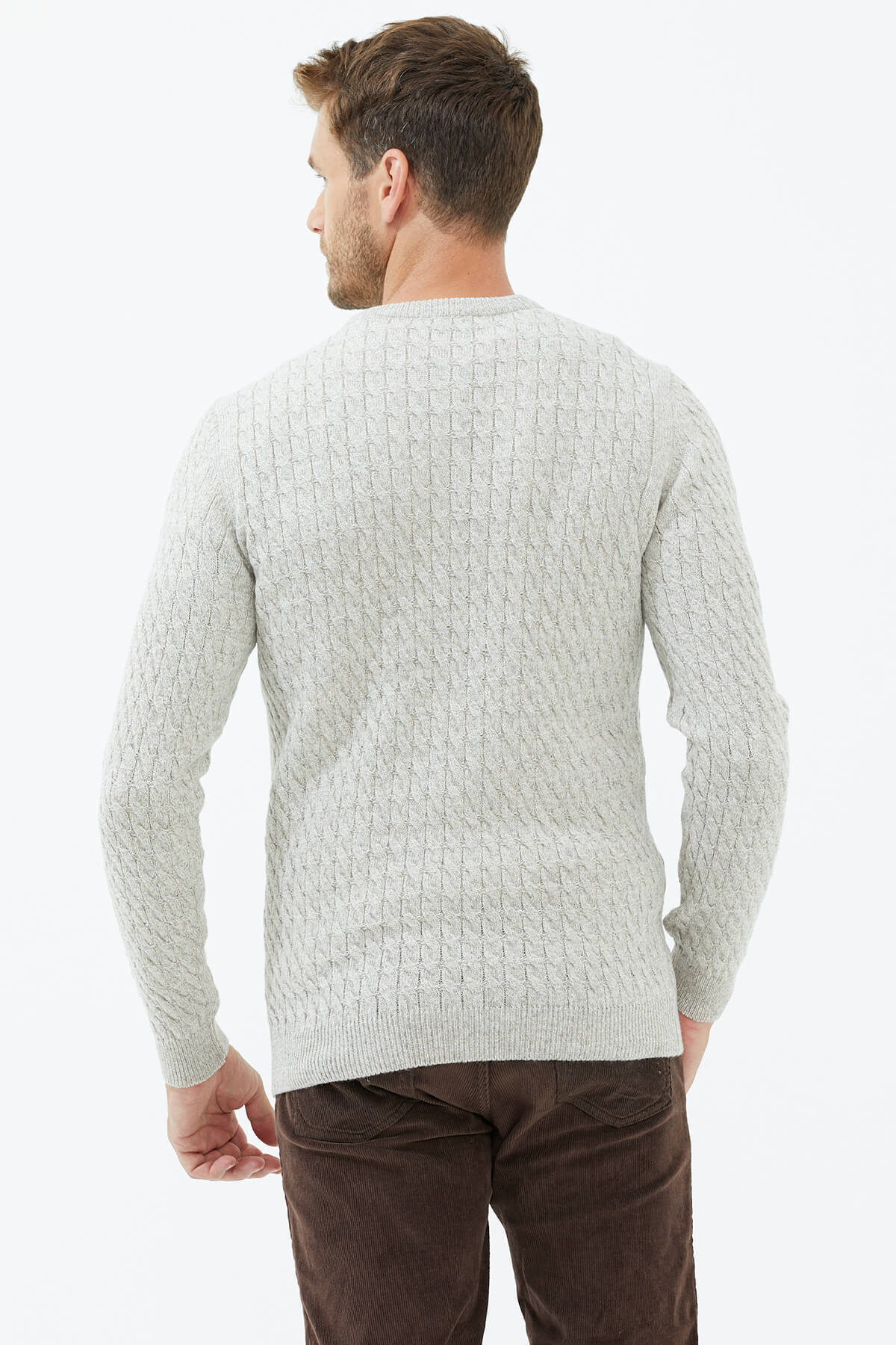 Yumuşak yün karışımlı iplikten üretilen, sıfır yaka, uzun kollu, saç örgülü triko kazak.