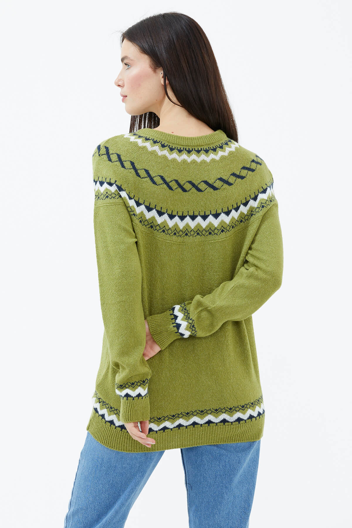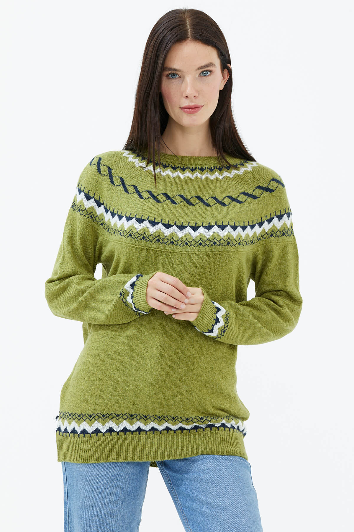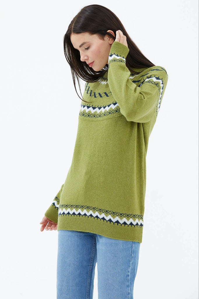 Etnik desenli, sıfır yaka, uzun kollu, düşük omuzlu, yakası, manşetleri ve etek ucu lastik örgülü yumuşak triko kazak.