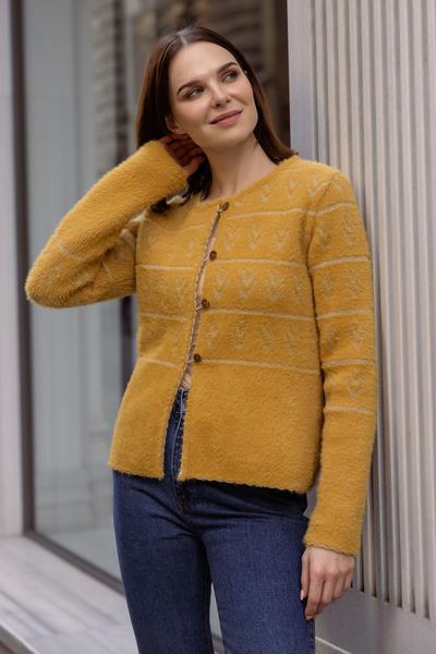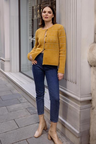 Sim Desenli Yumoş Triko Hırka - Hardal