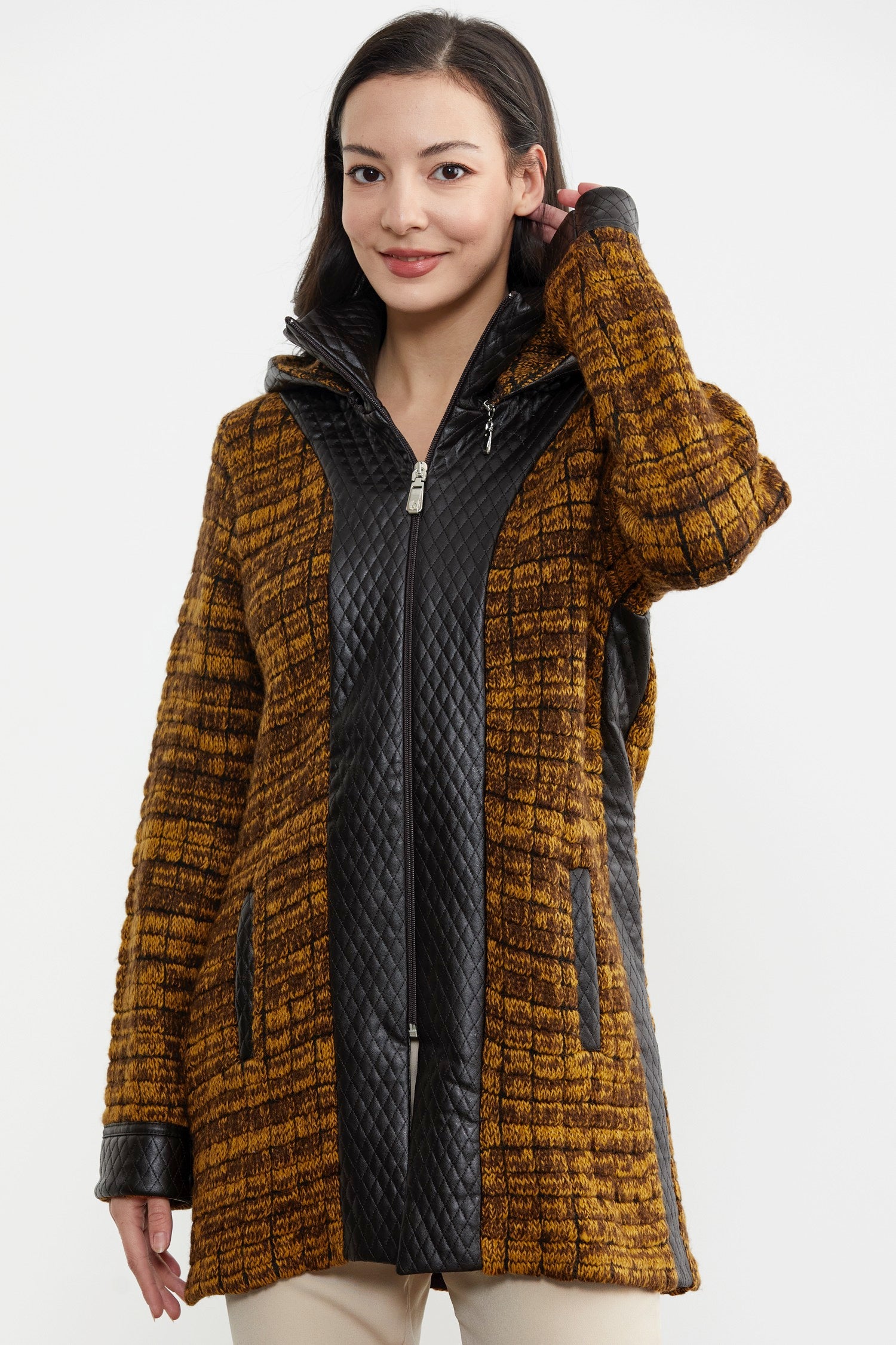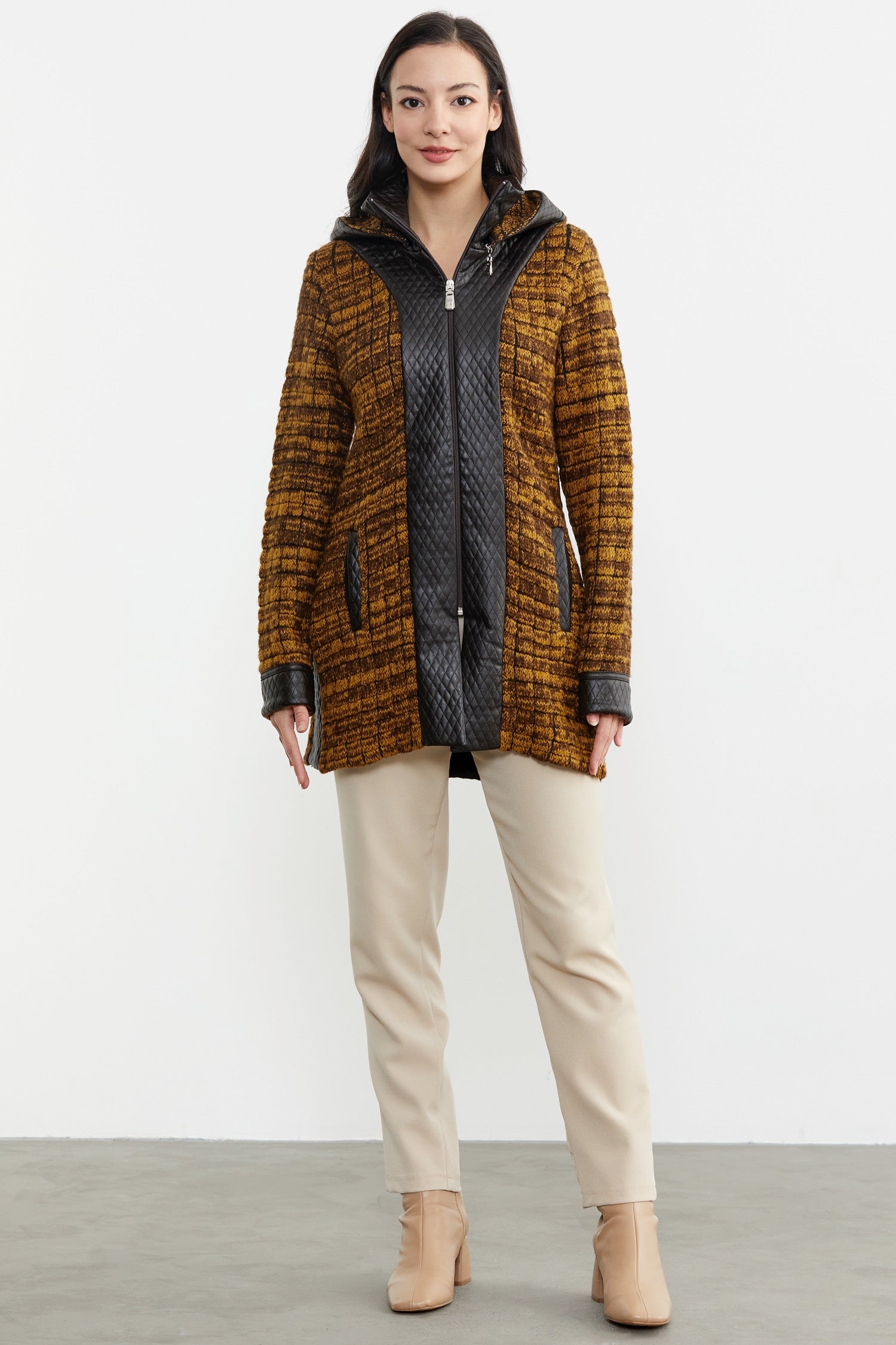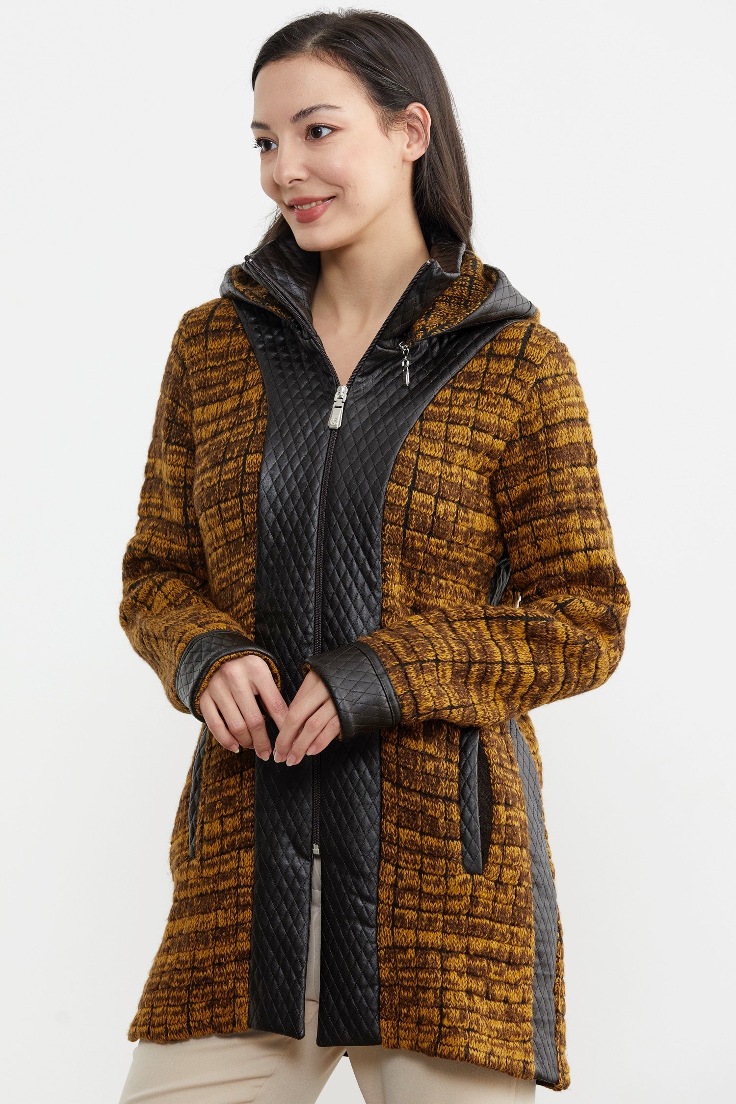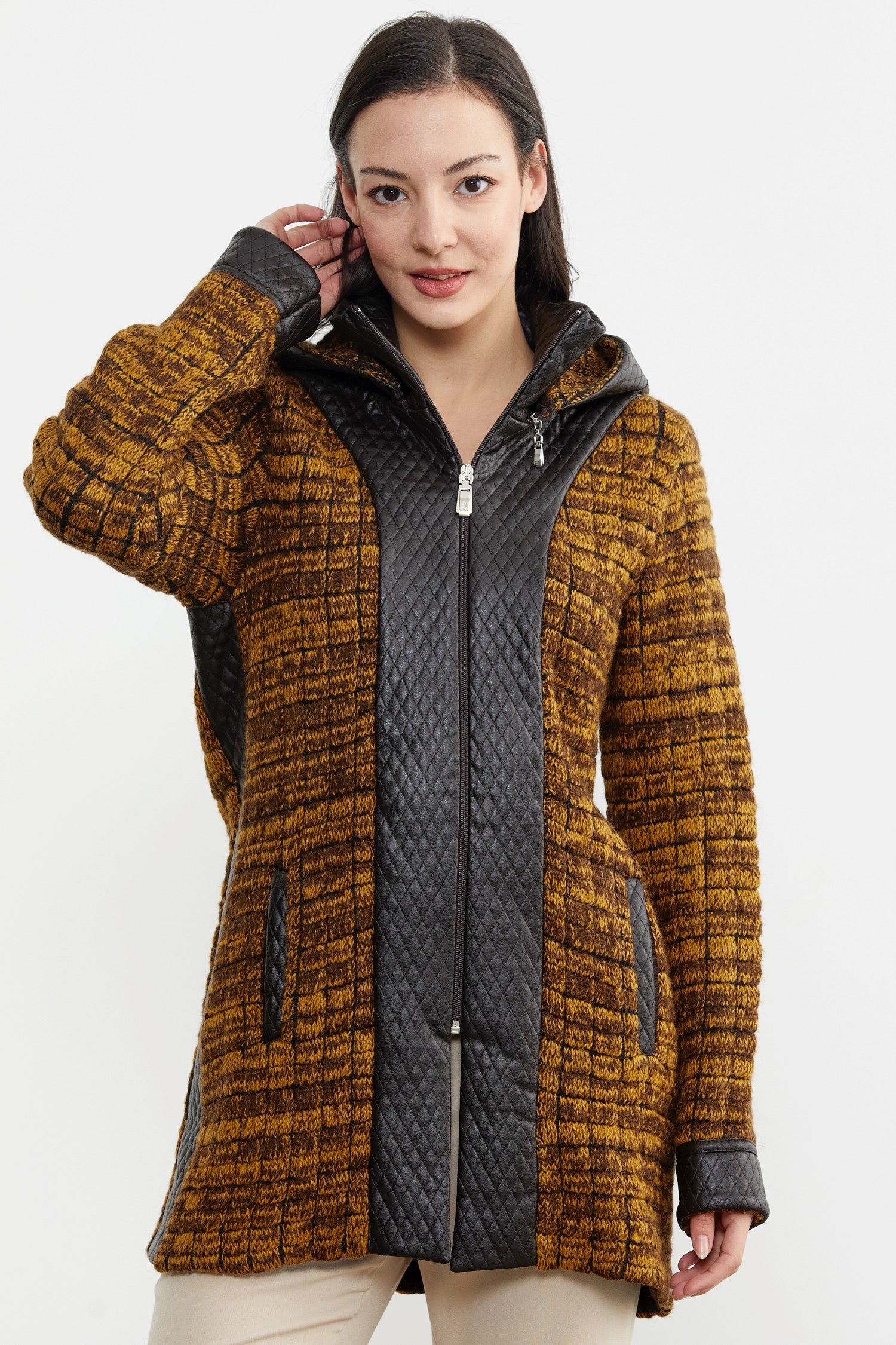 Kapüşon, kol ağzı, cep ve fermuar çevresinde suni deri detaylarına sahip çift renkli desenli uzun triko ceket ile kombinlerinizi rahatlıkla tamamlayabilirsiniz. İki yan cepleri ve çıkarılabilir kapüşonu ile kullanım kolaylığı sağlar. Renk seçeneklerine göz atmayı unutmayın.