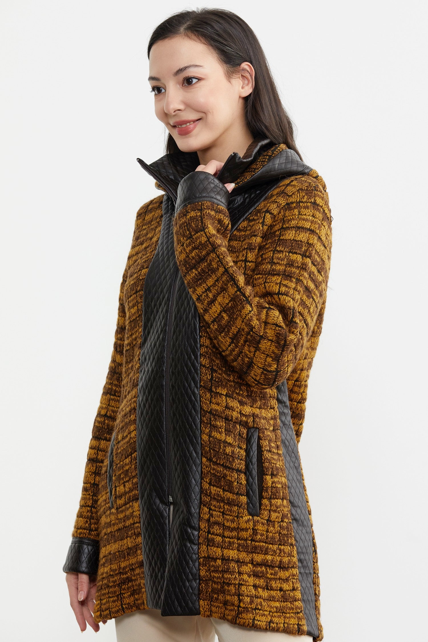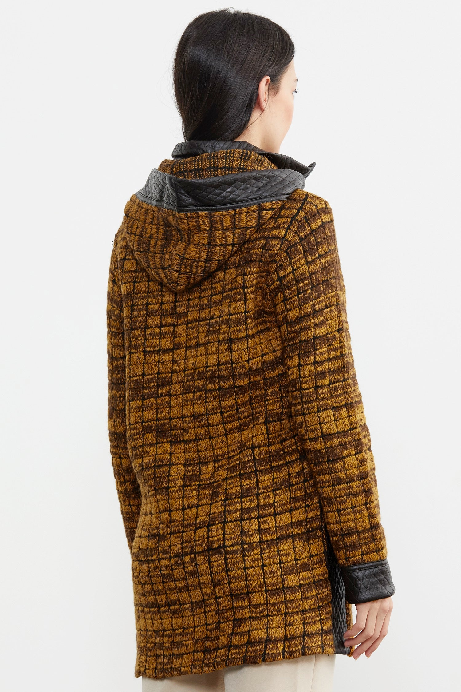 Suni Deri Detaylı Uzun Triko Ceket - Güneş - Kahverengi
