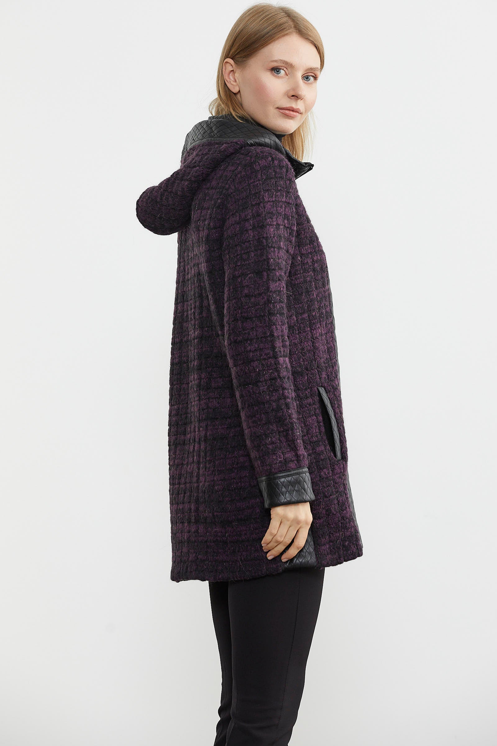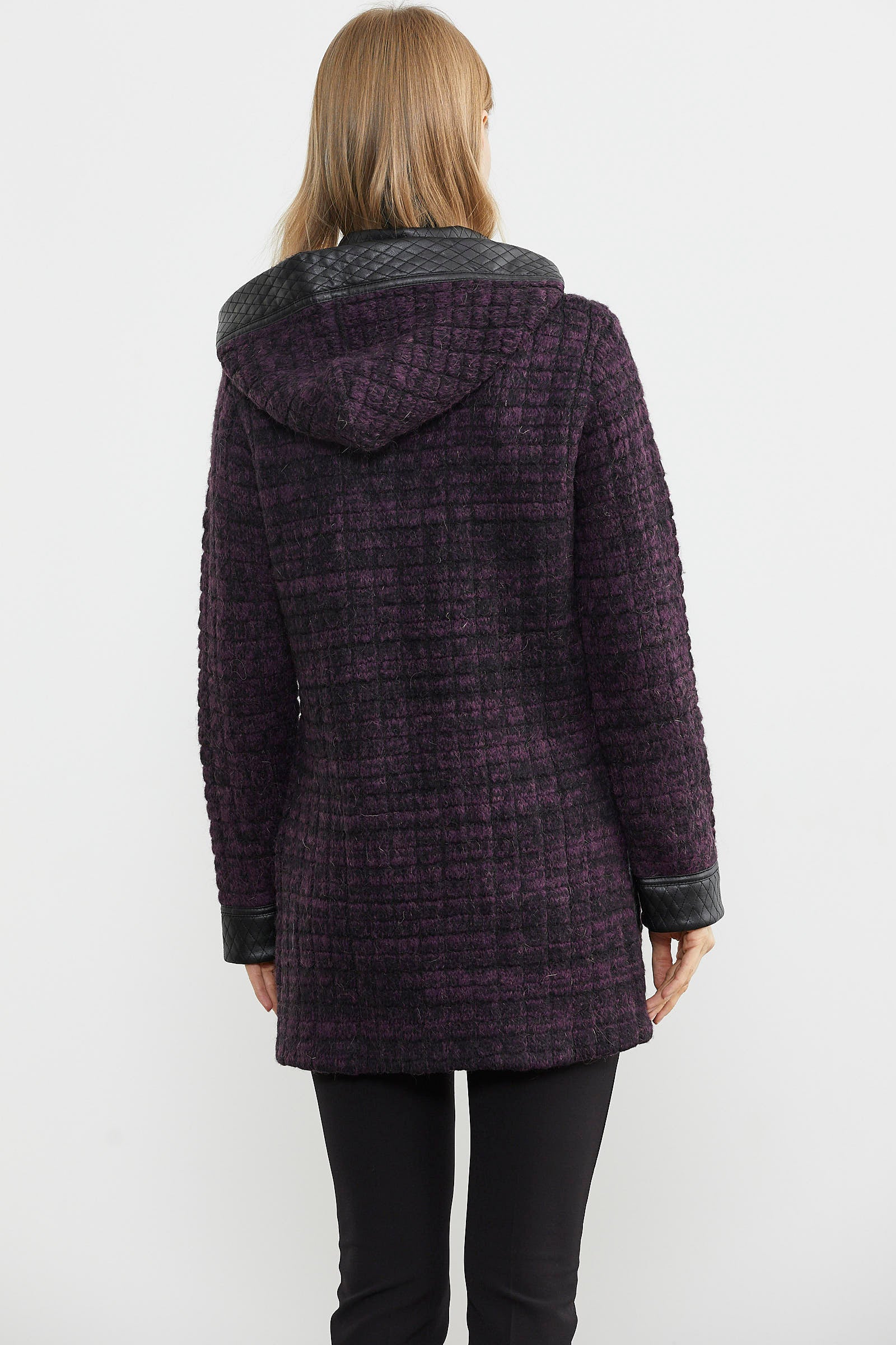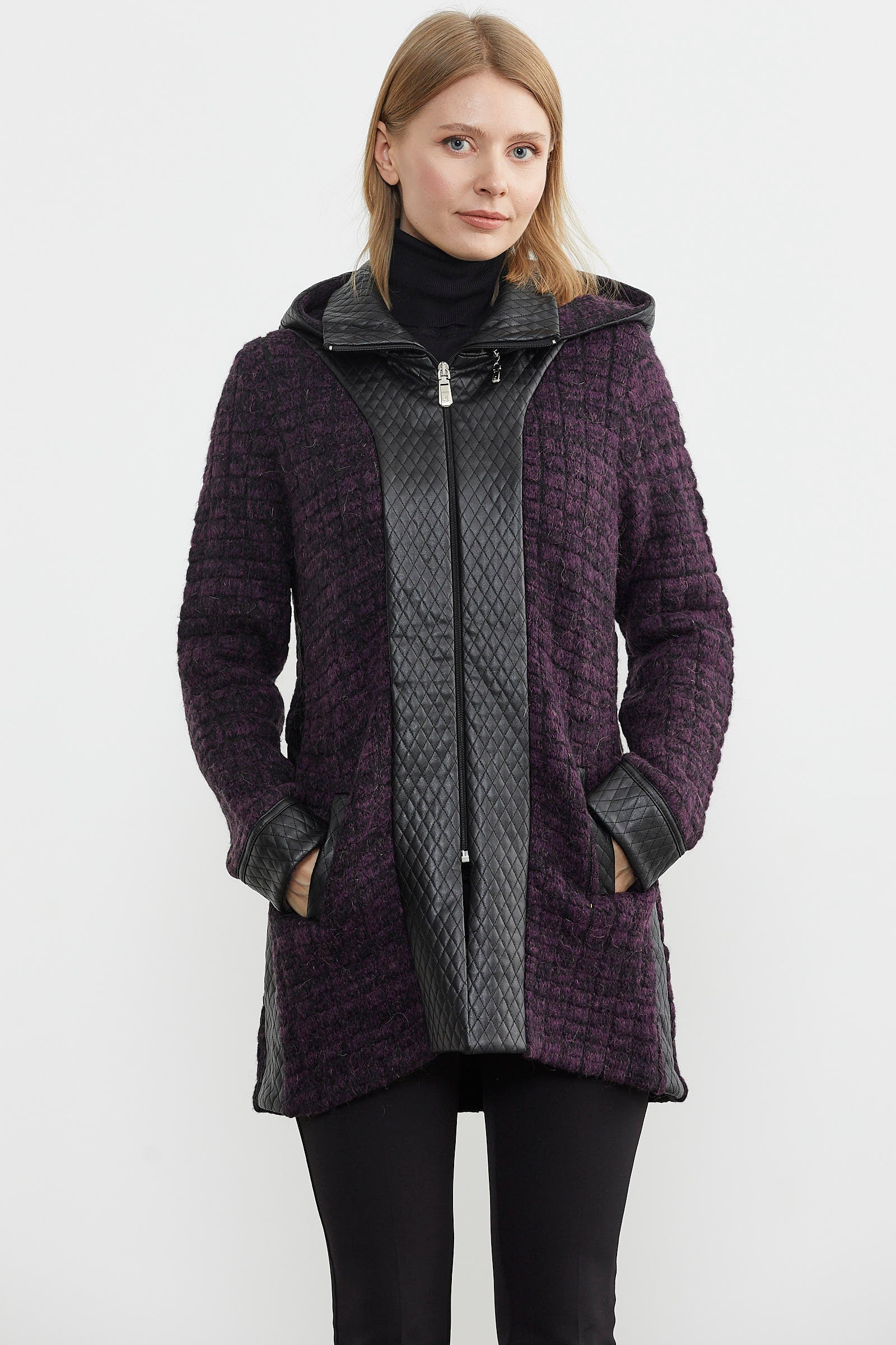 Suni Deri Detaylı Uzun Triko Ceket - Mor - Siyah