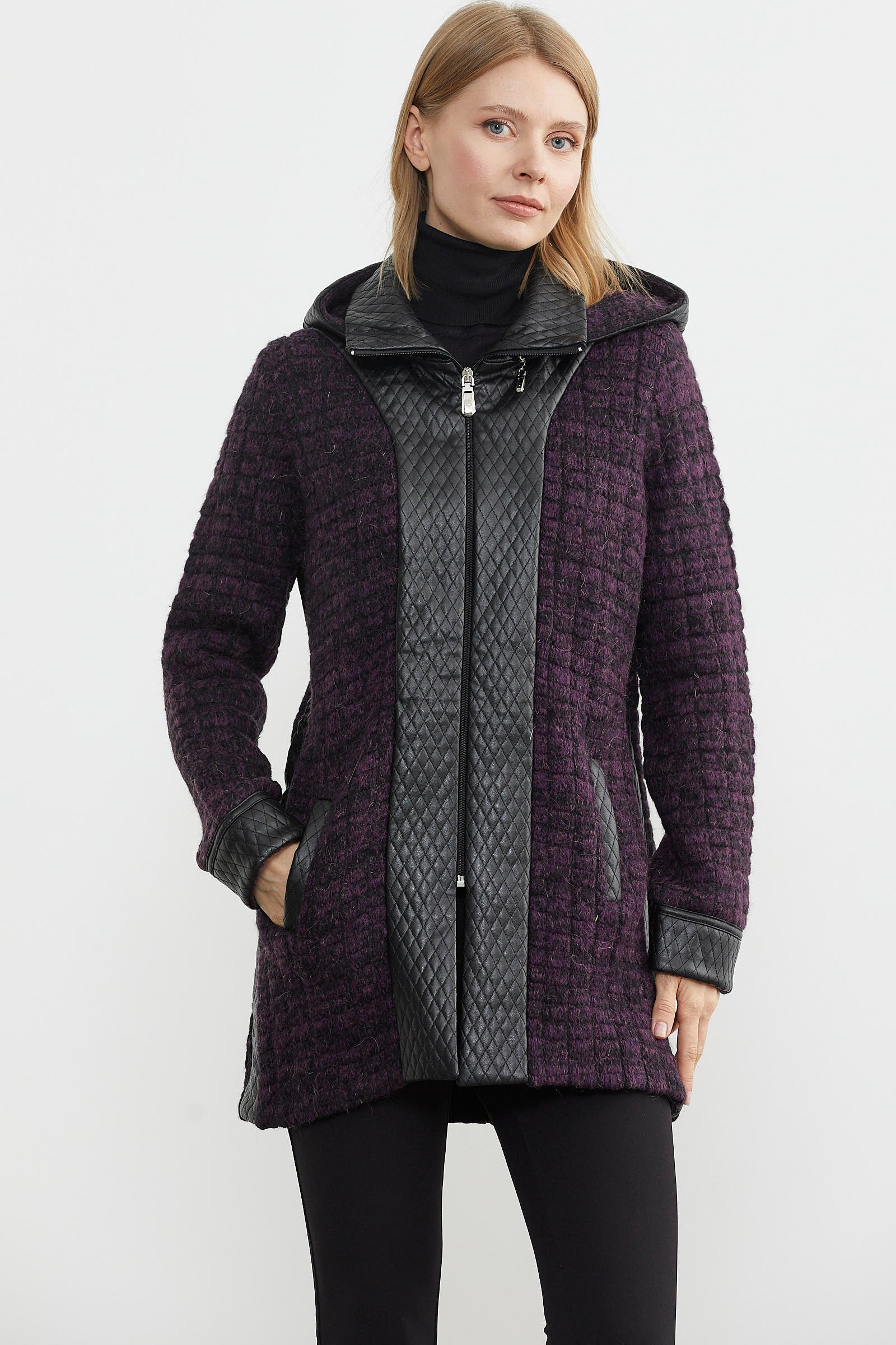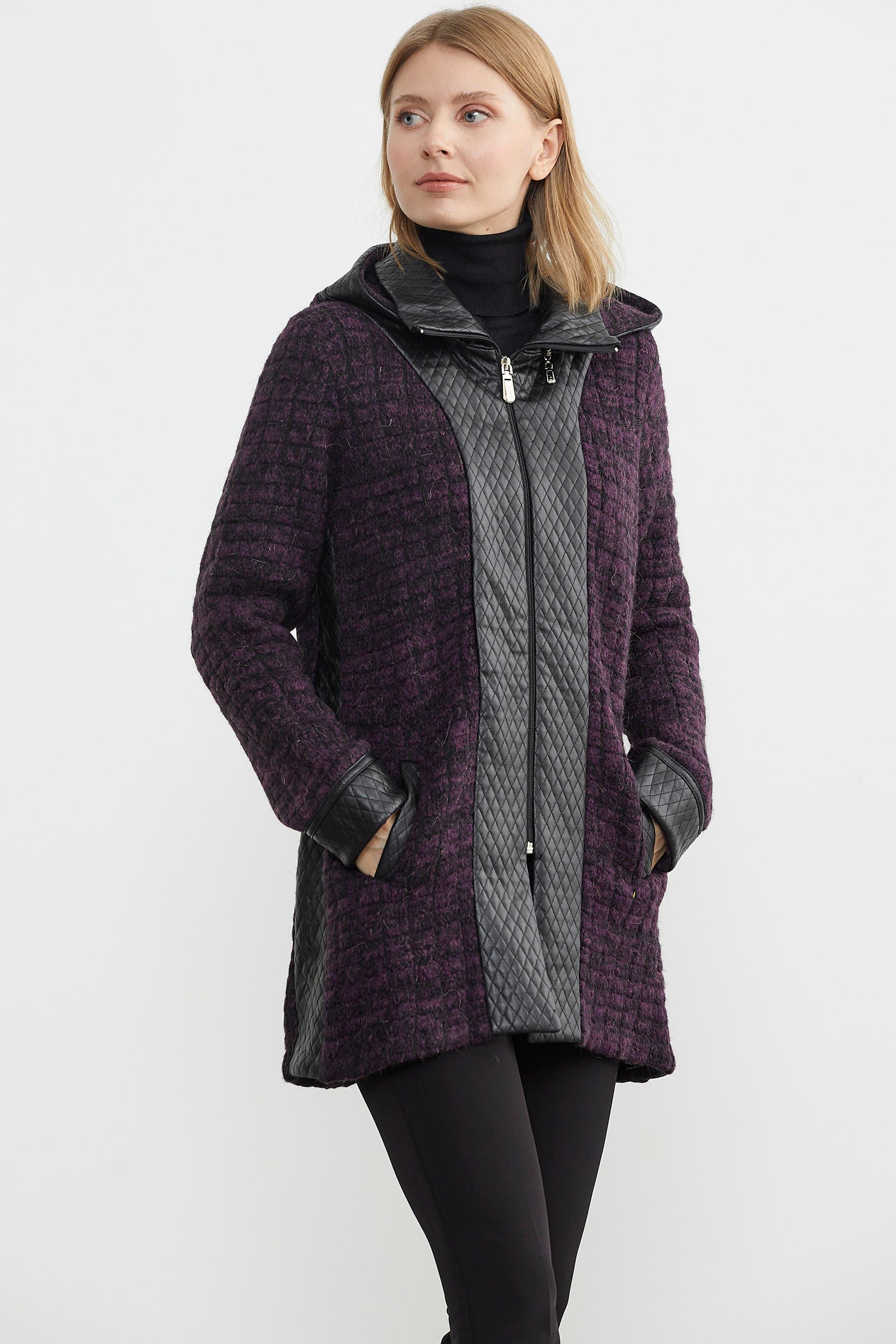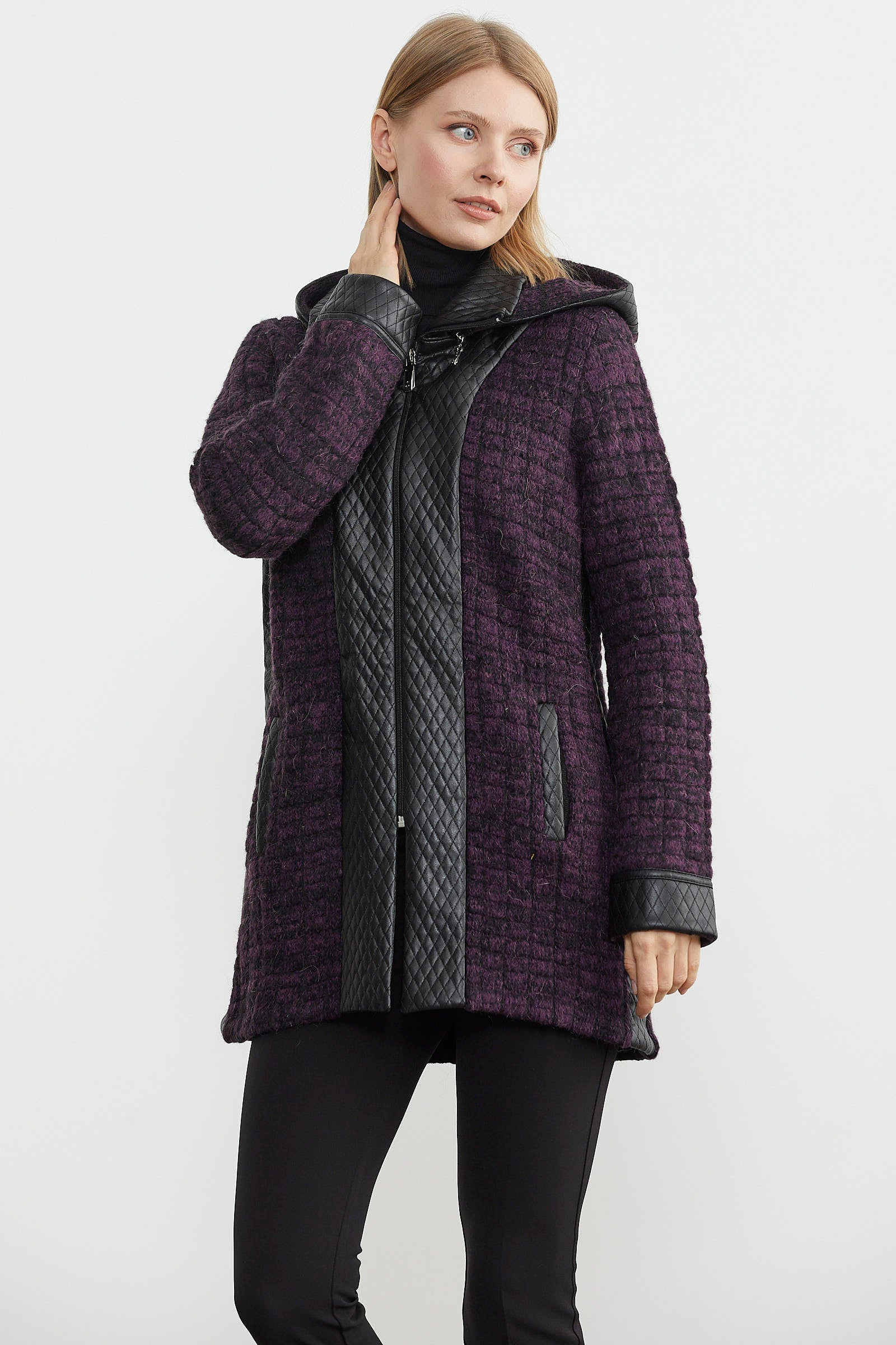 Suni Deri Detaylı Uzun Triko Ceket - Mor - Siyah