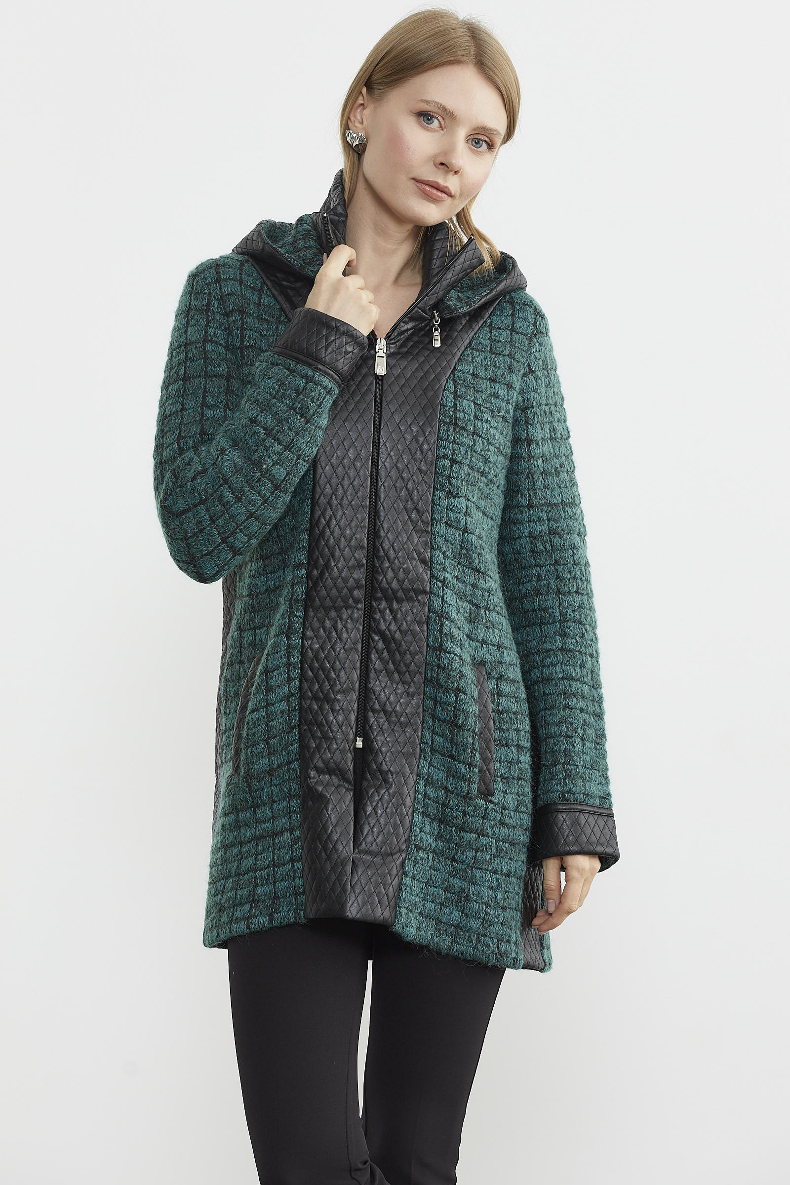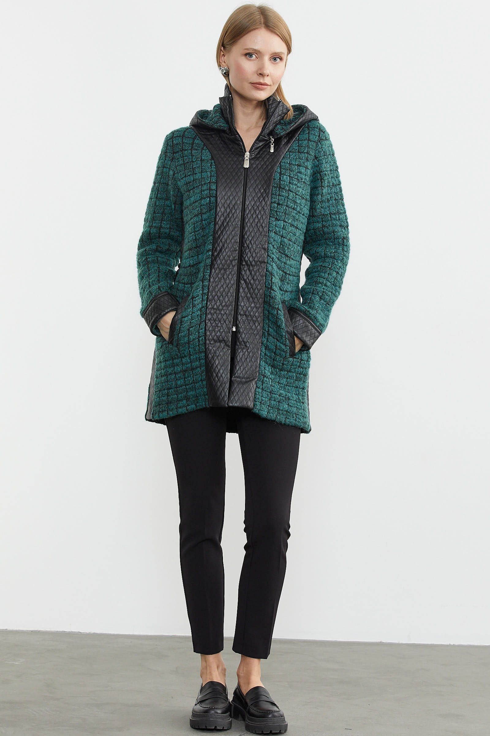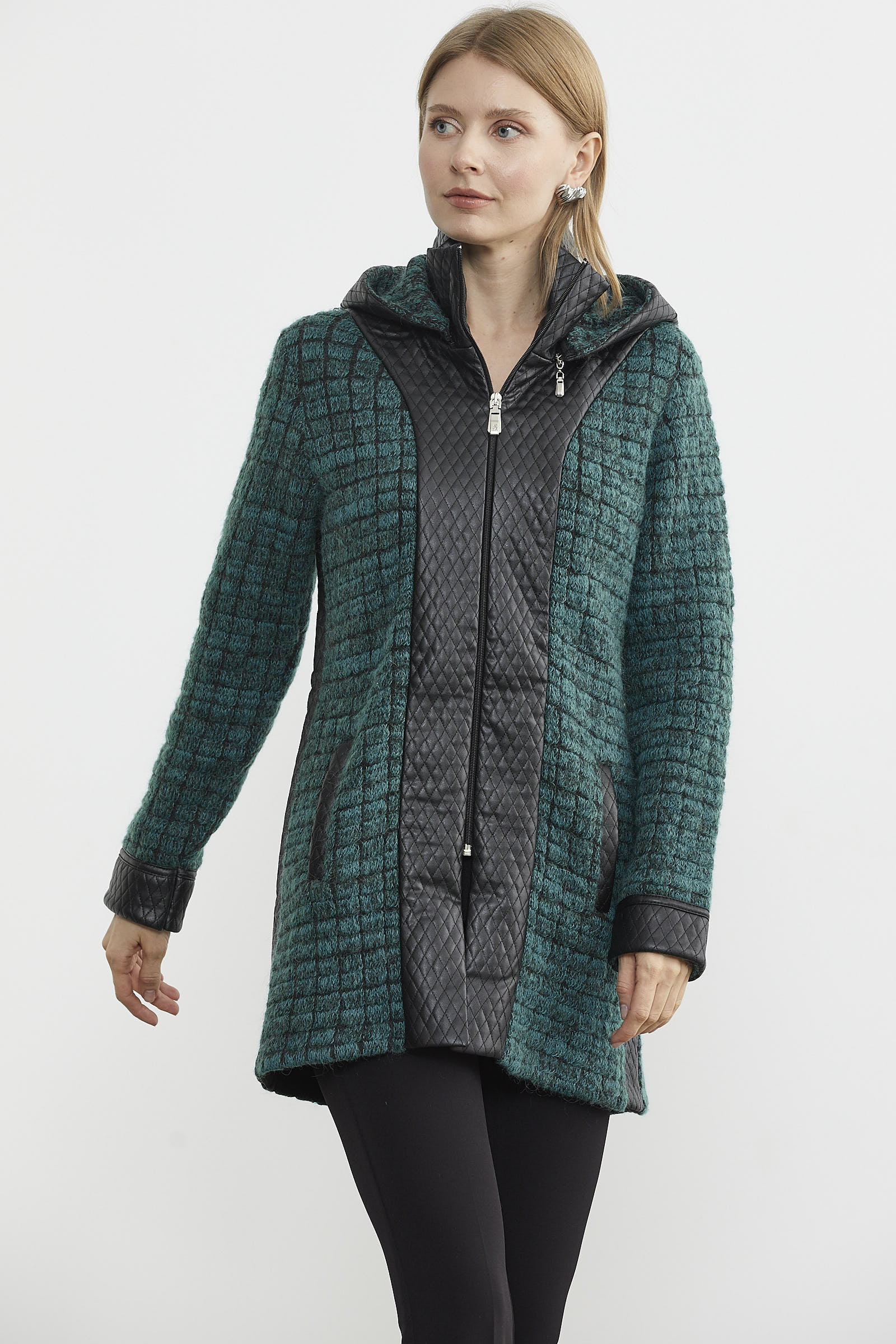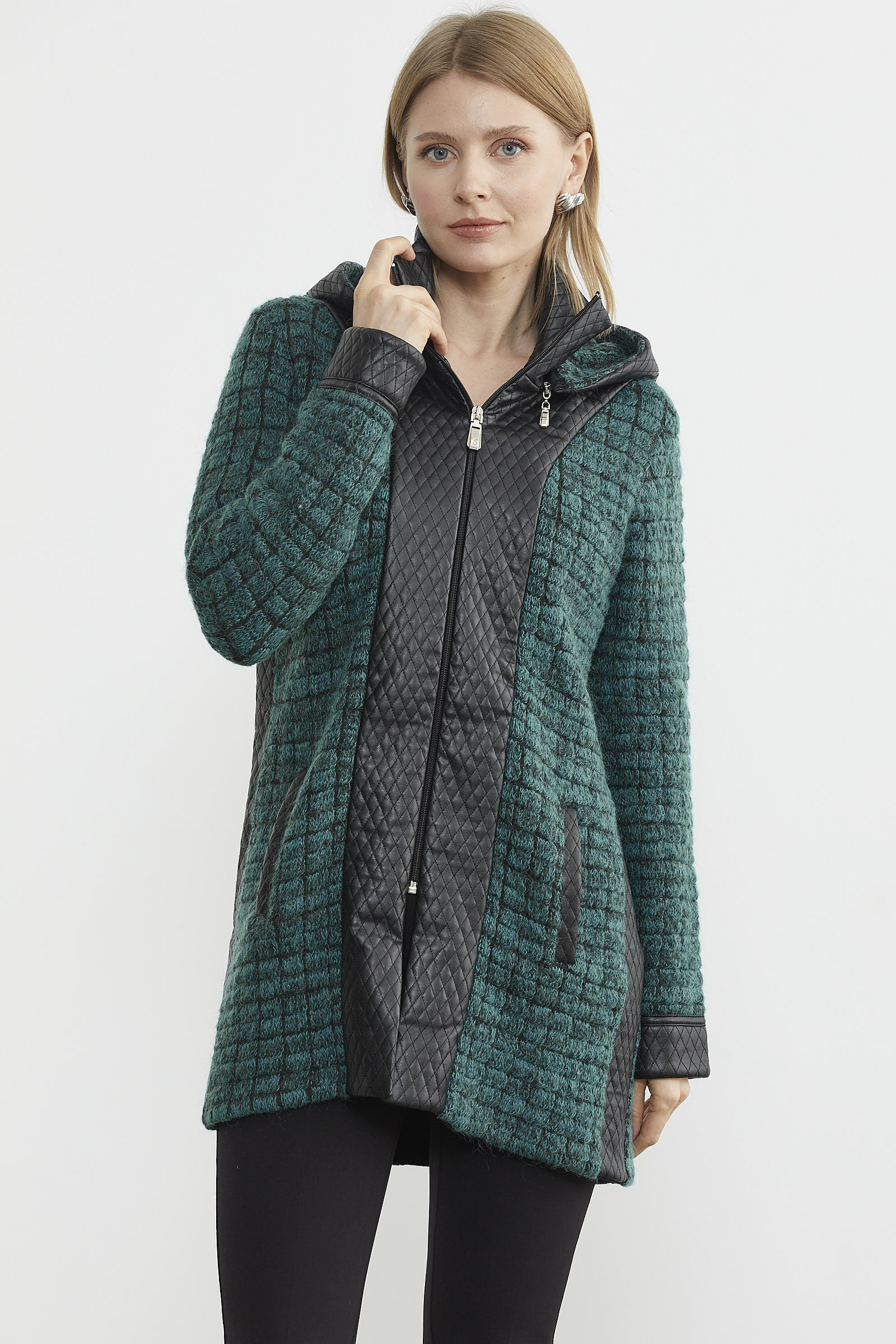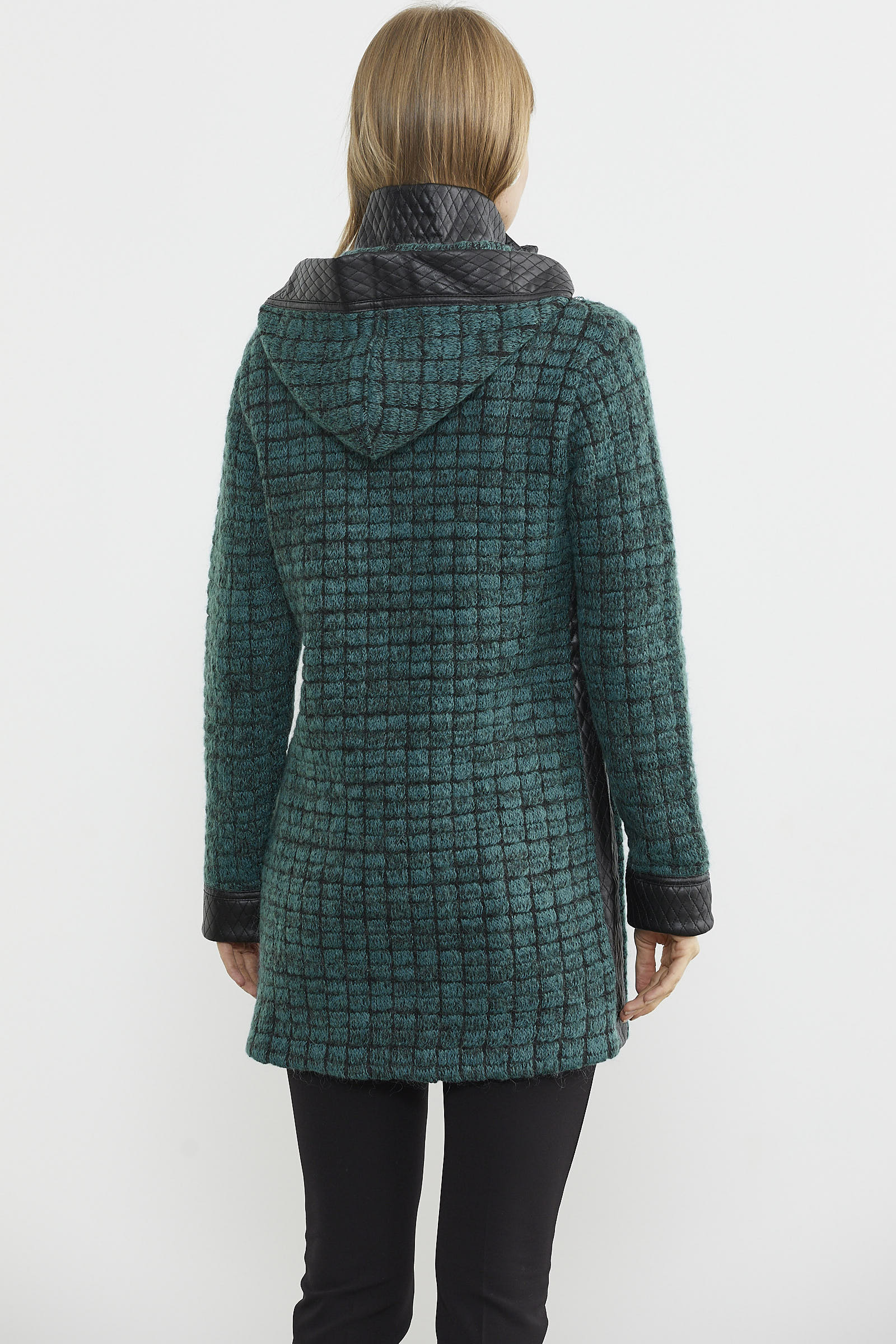 Suni Deri Detaylı Uzun Triko Ceket - Su Yeşili - Antrasit