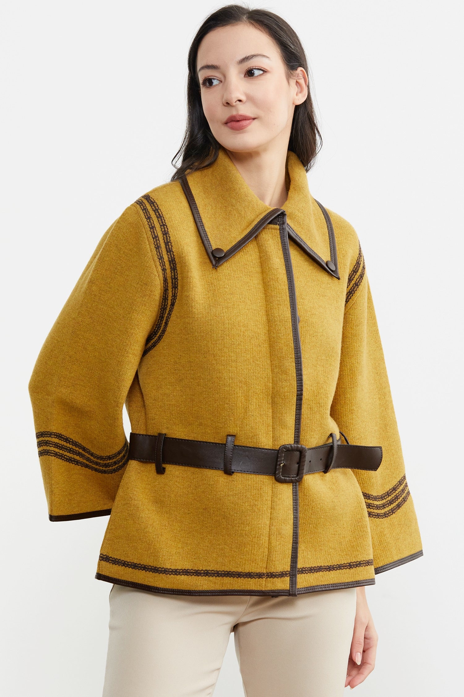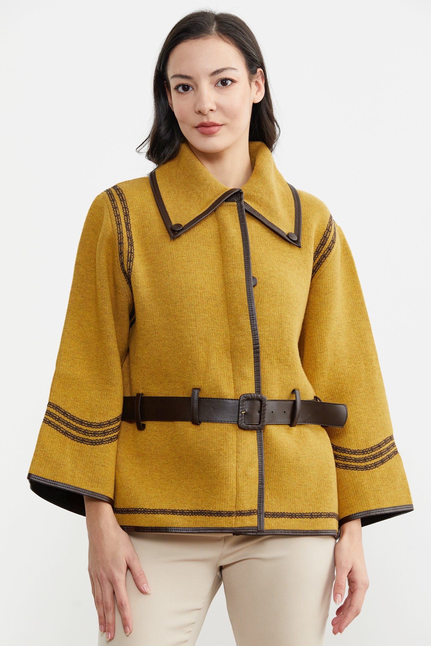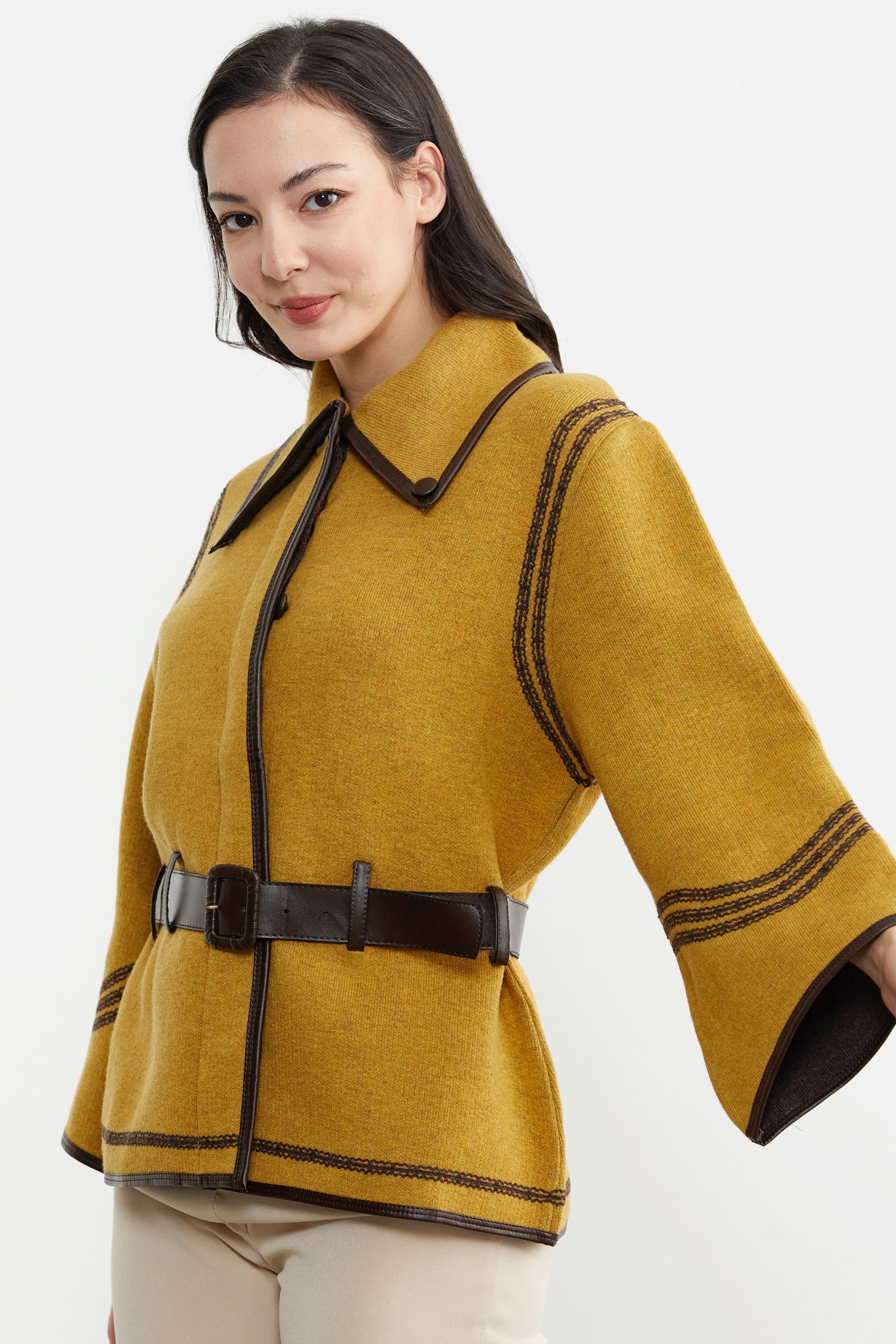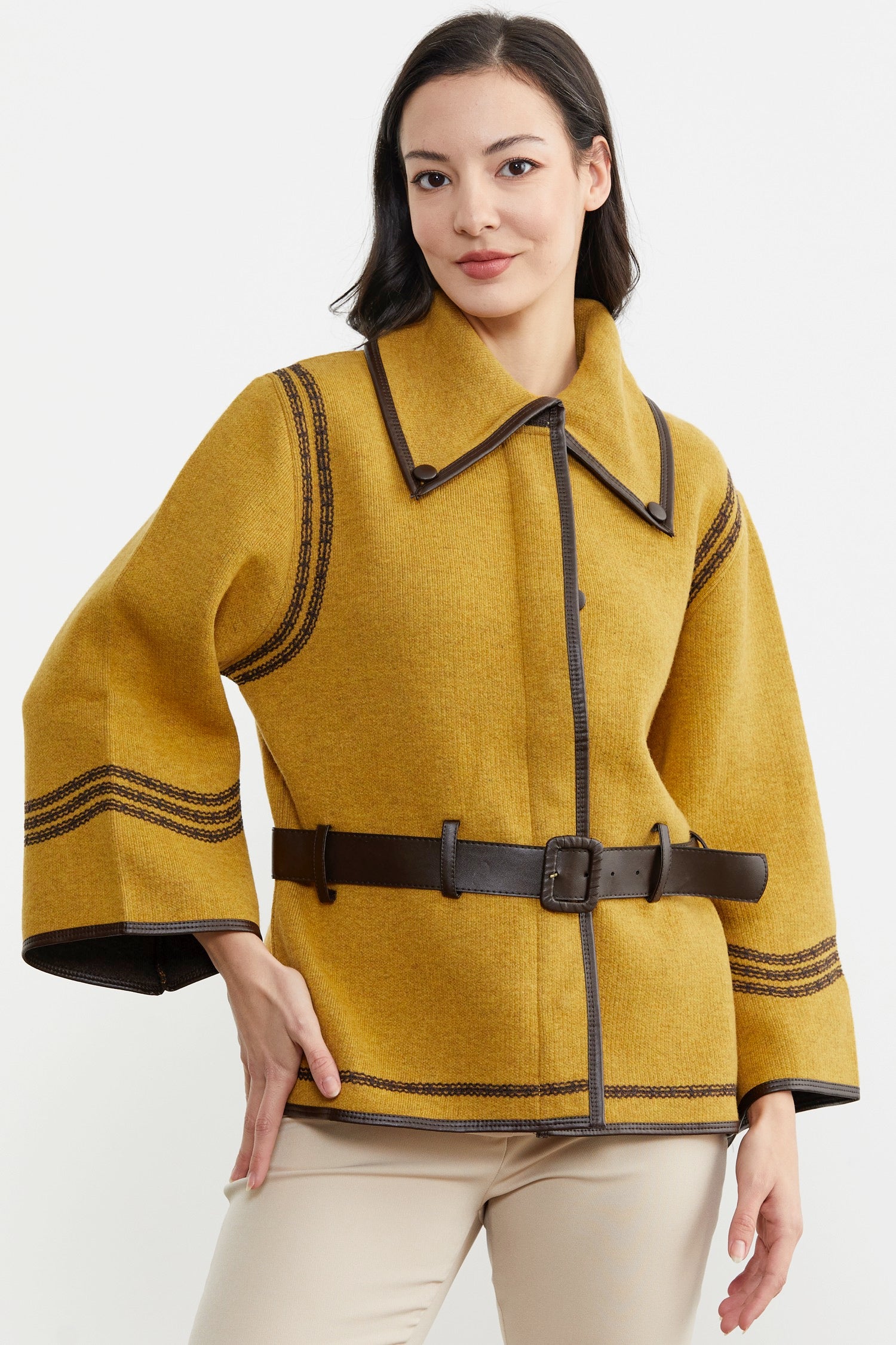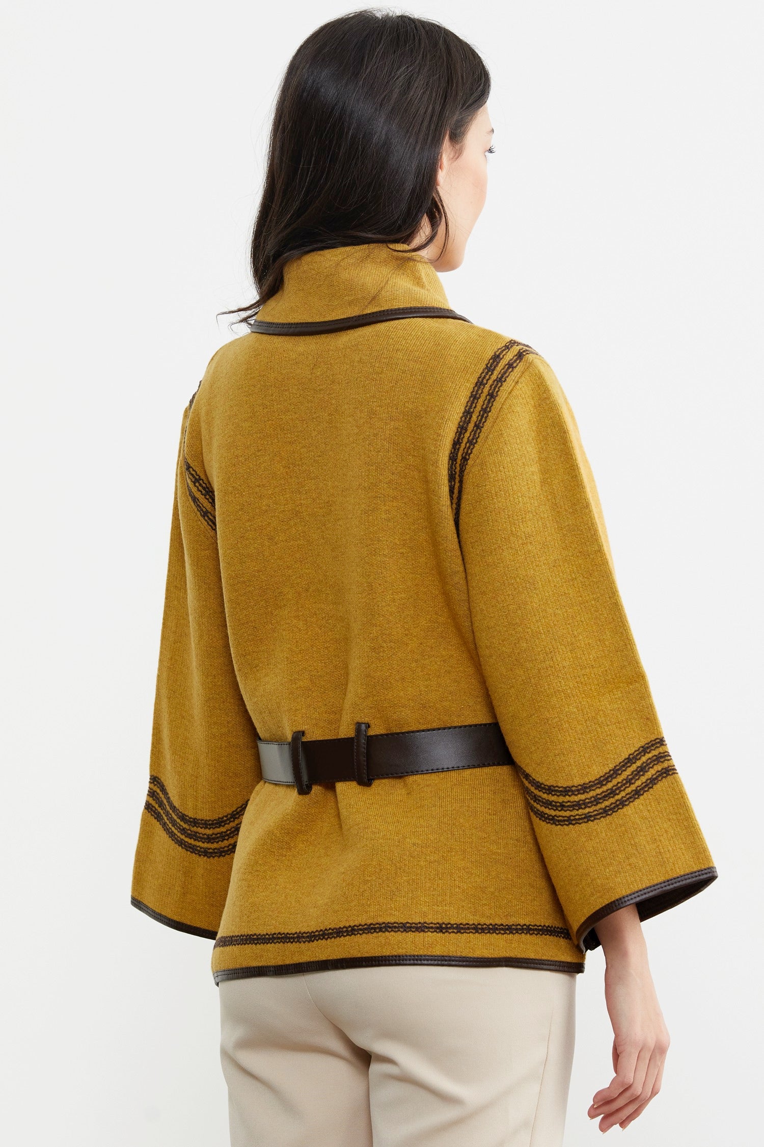 Suni Deri Kemer Detaylı Triko Ceket - Güneş - Kahverengi