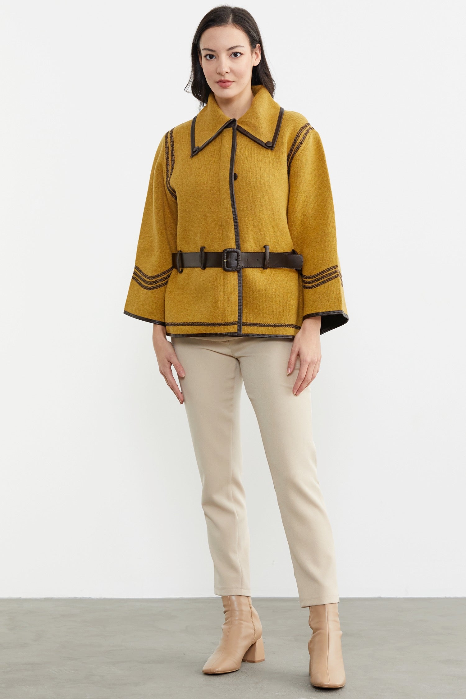 Özgün tasarım yakası ile ön plana çıkan suni deri şerit ve yaka düğme detaylı bel kemerli triko ceket ile marjinal ve yaratıcı kombinler yaparken sıcacık hissedebilirsiniz. Farklı renk seçeneklerine göz atmayı unutmayın.