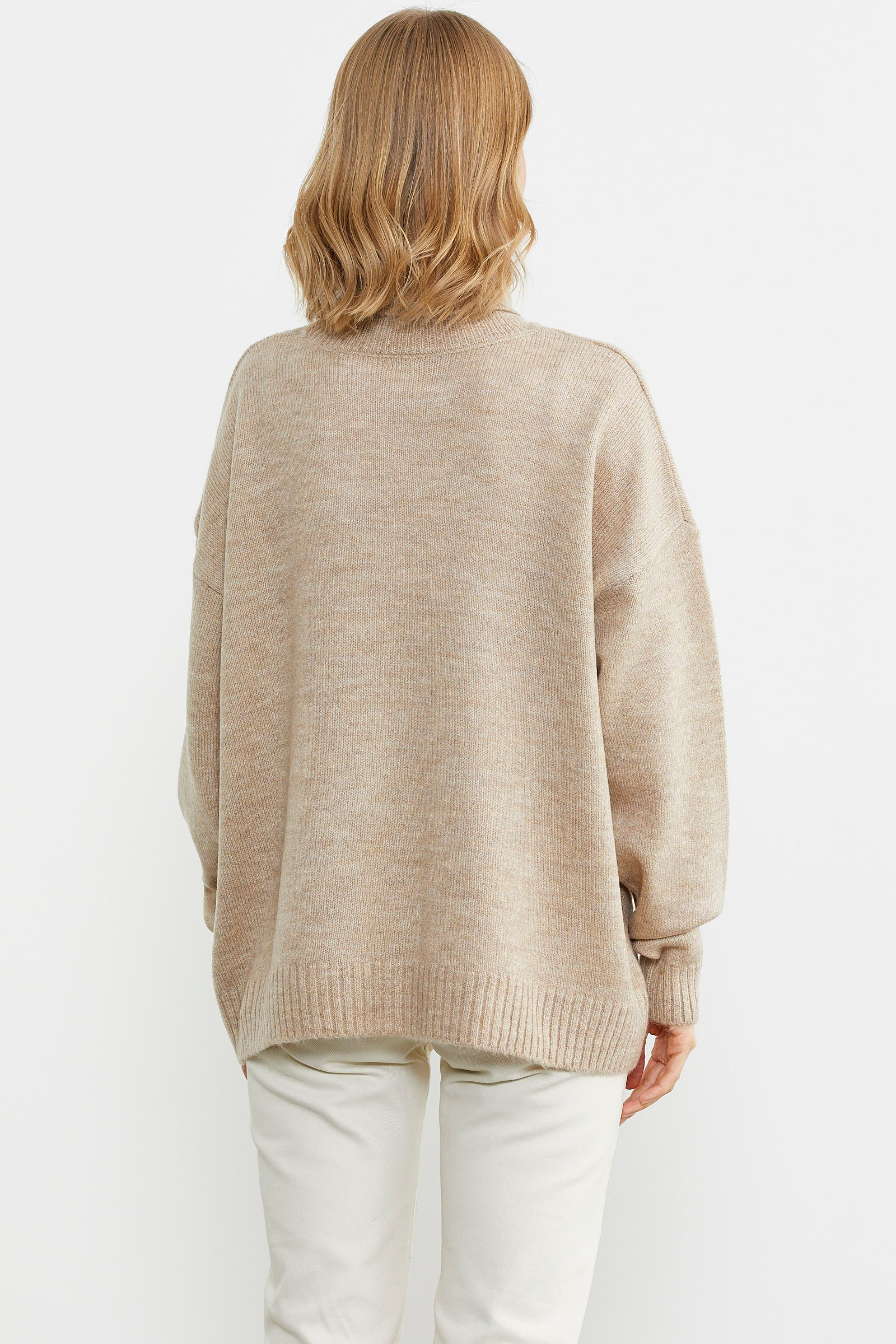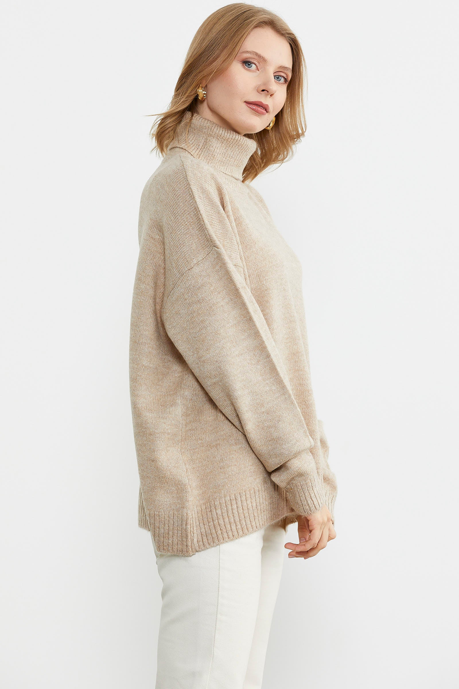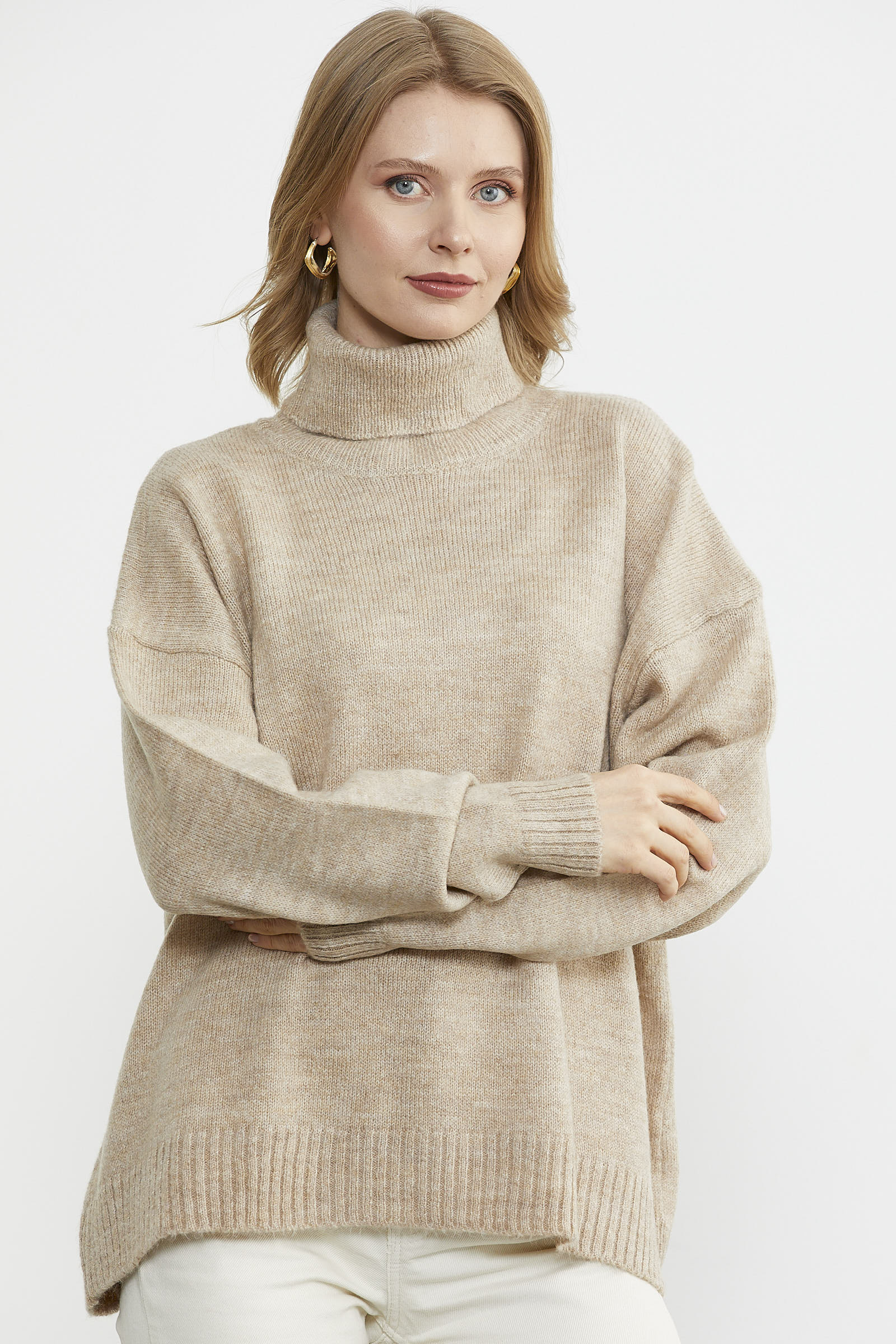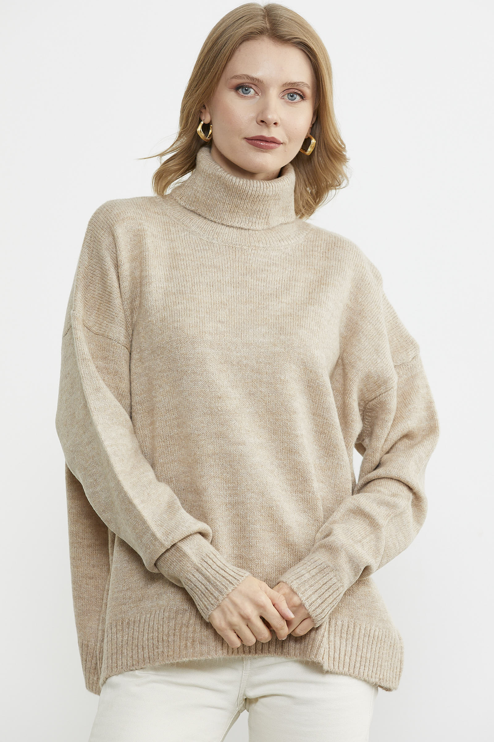 Tam Balıkçı Dökümlü Triko Kazak - Bej
