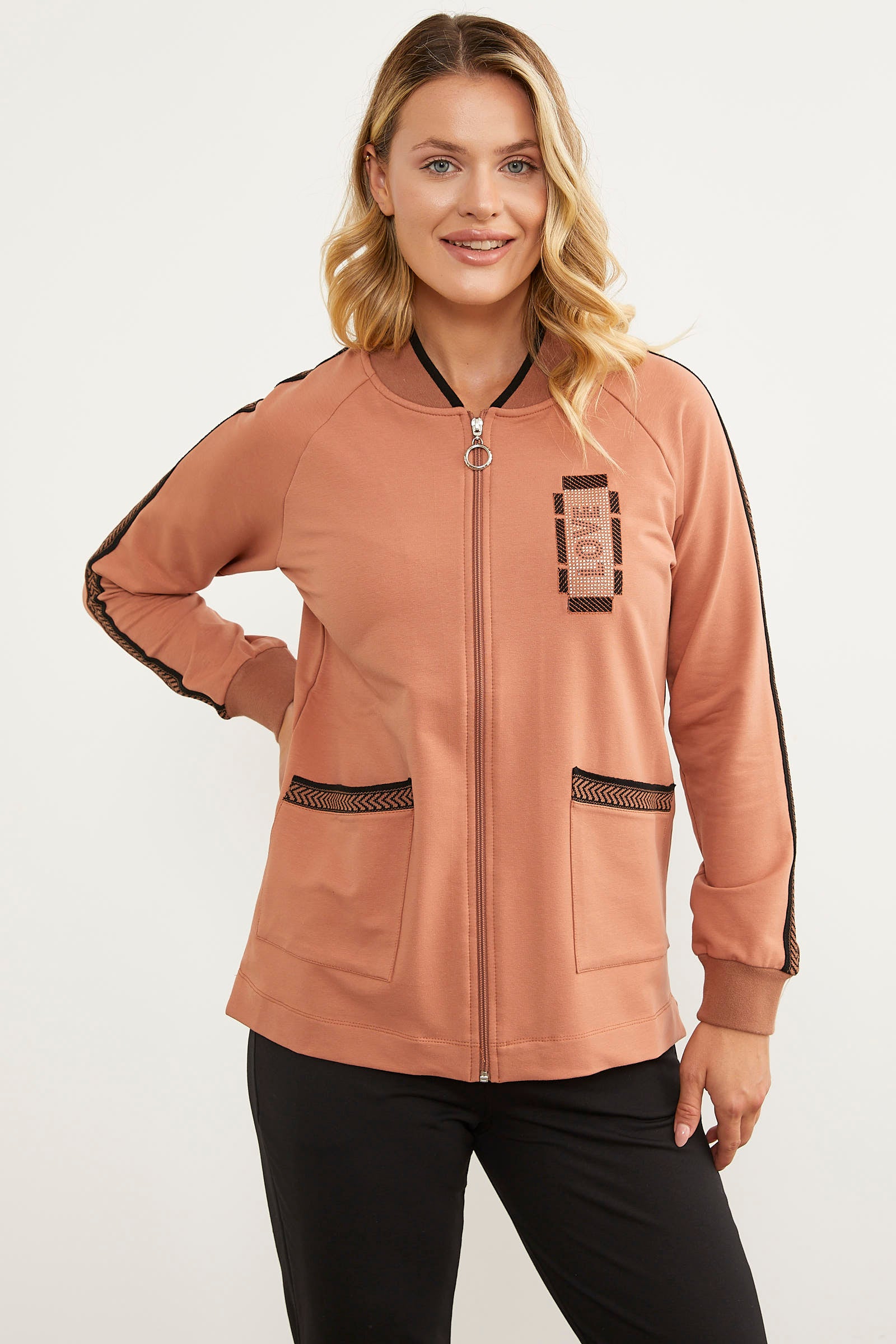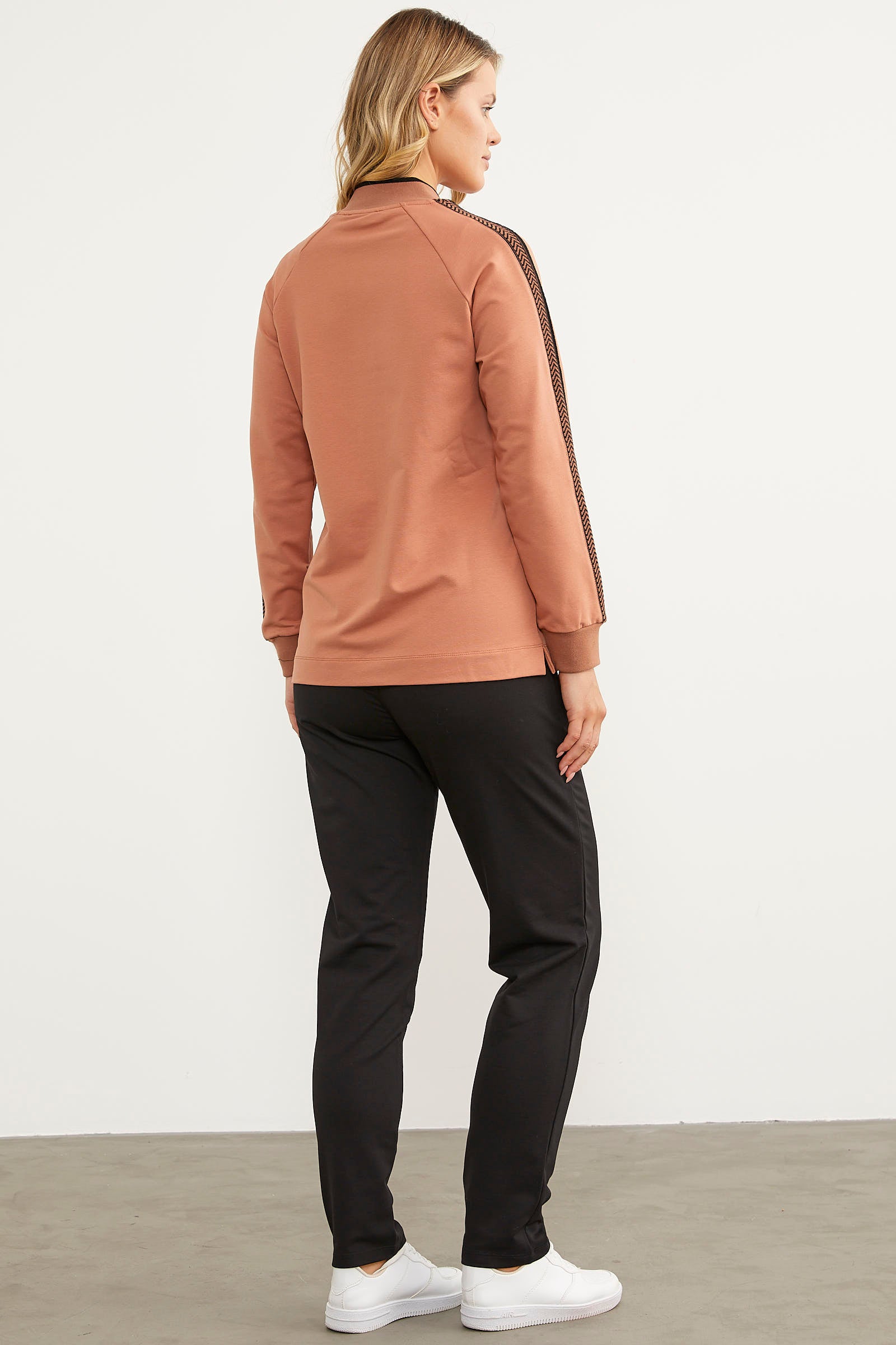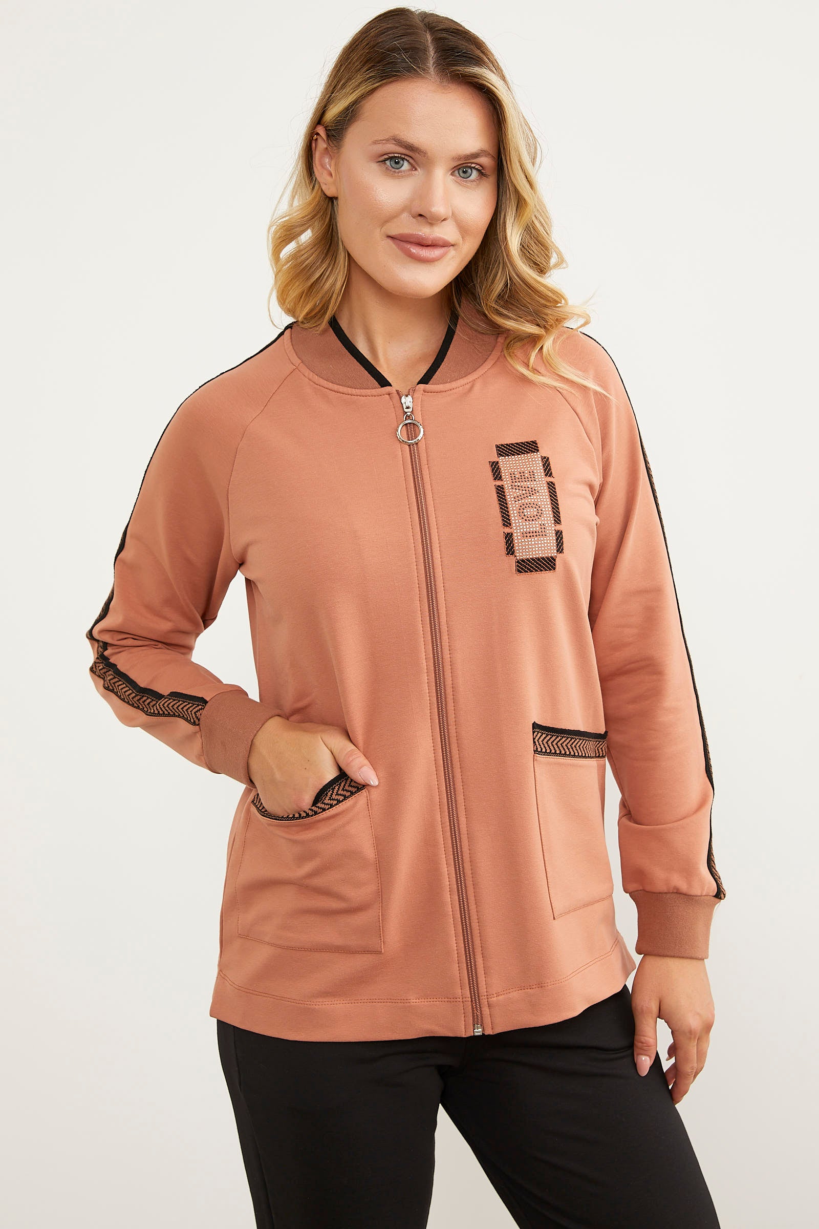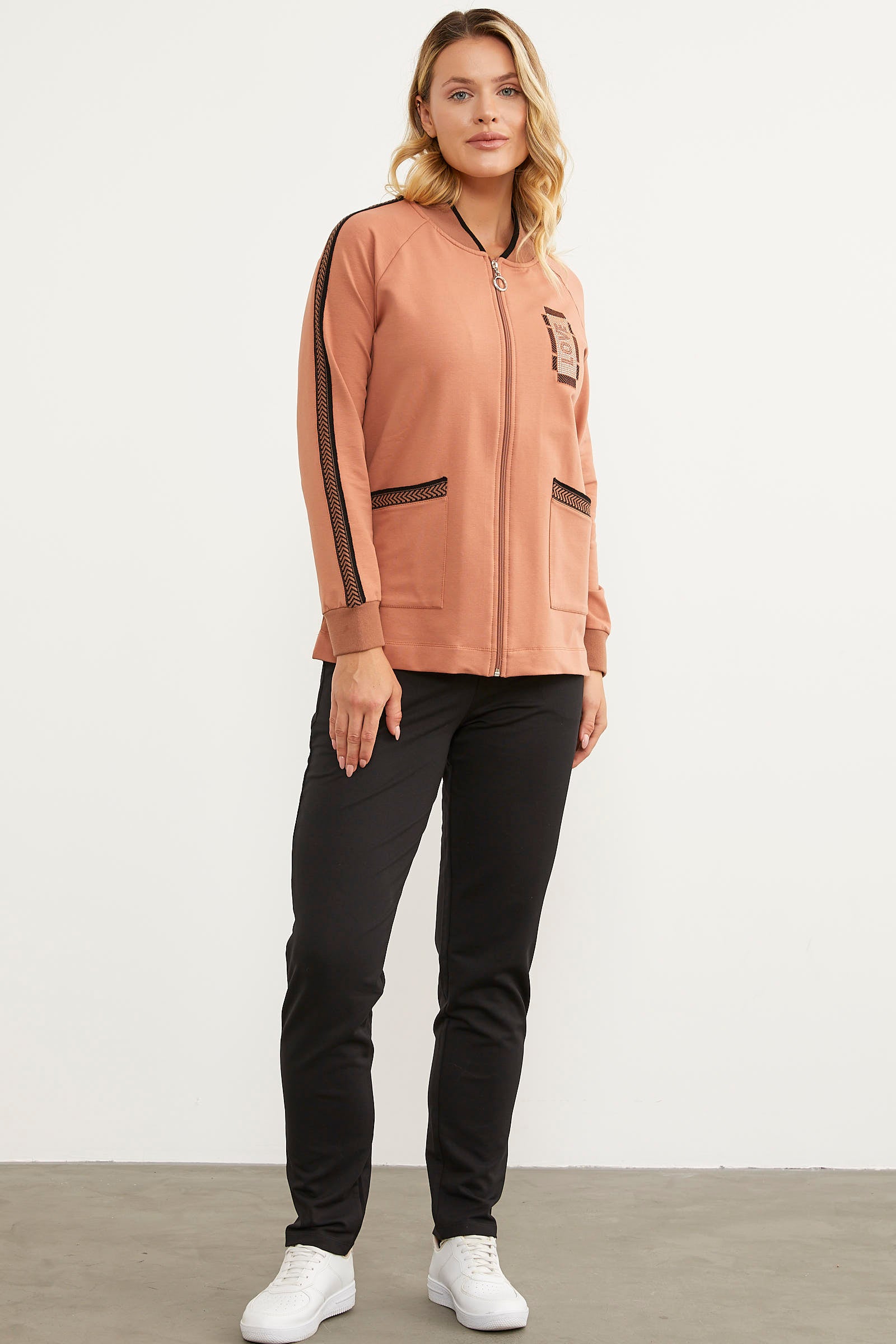 Cep, kol ve göğüs kısımları taş işlemeli, boydan fermuarlı, iki ön cebe sahip tunik üst ve iki yan cepli düz alttan oluşan ikili eşofman takımı pamuk içeren yumuşacık dokusuyla sizi sıcacık hissettiriken sportif stilinizin şık yansıması oluyor.