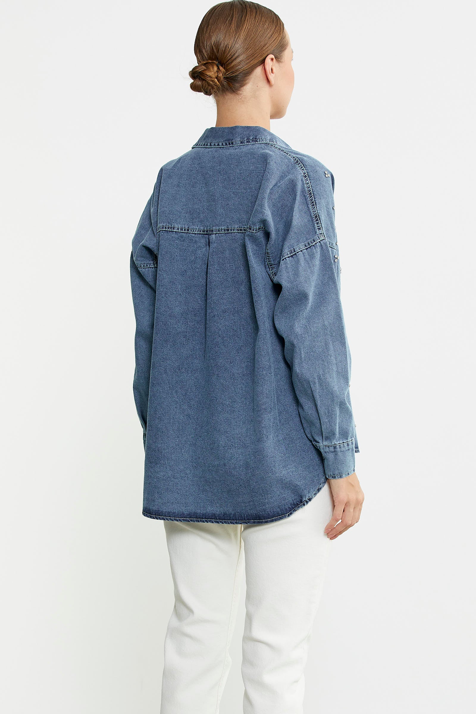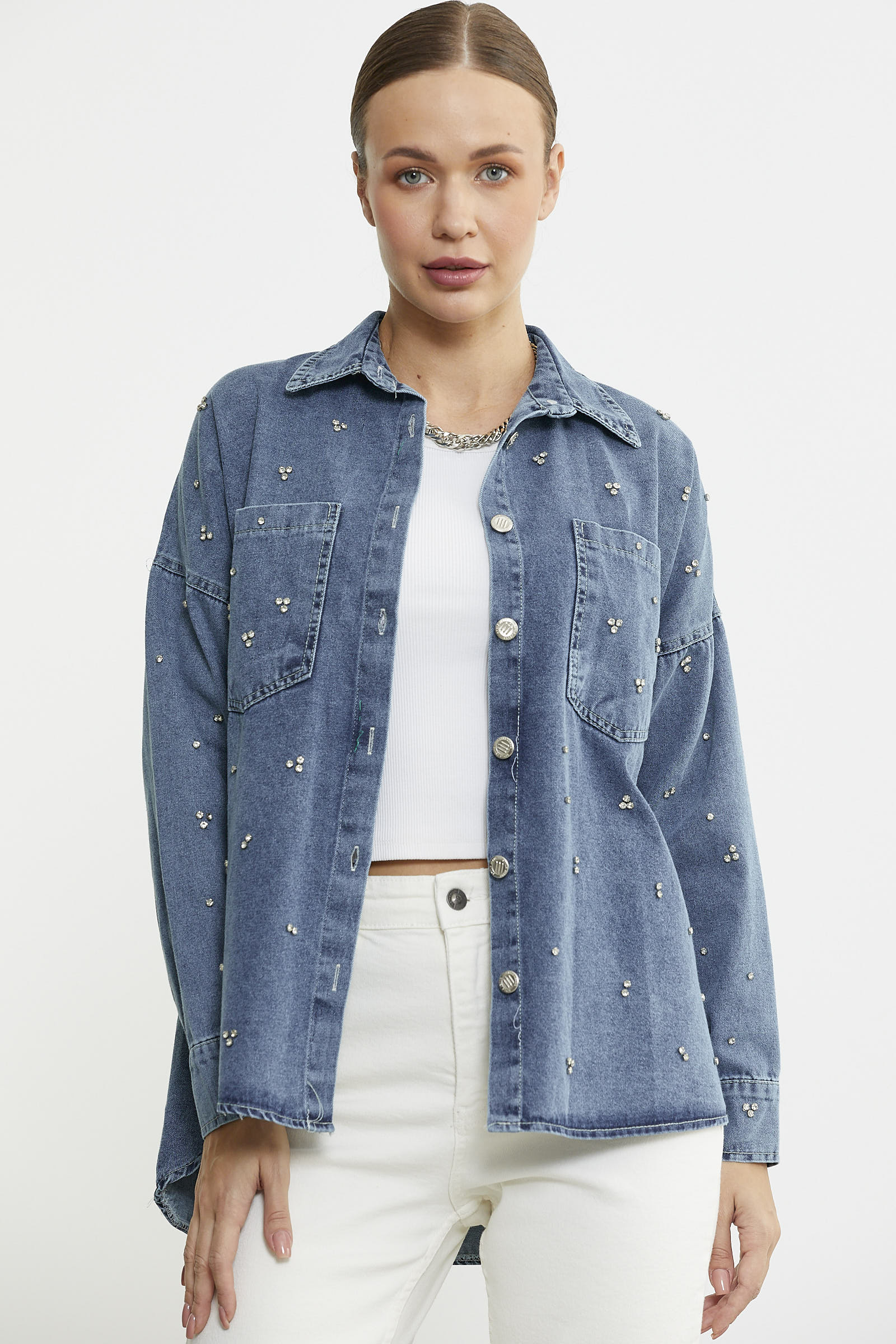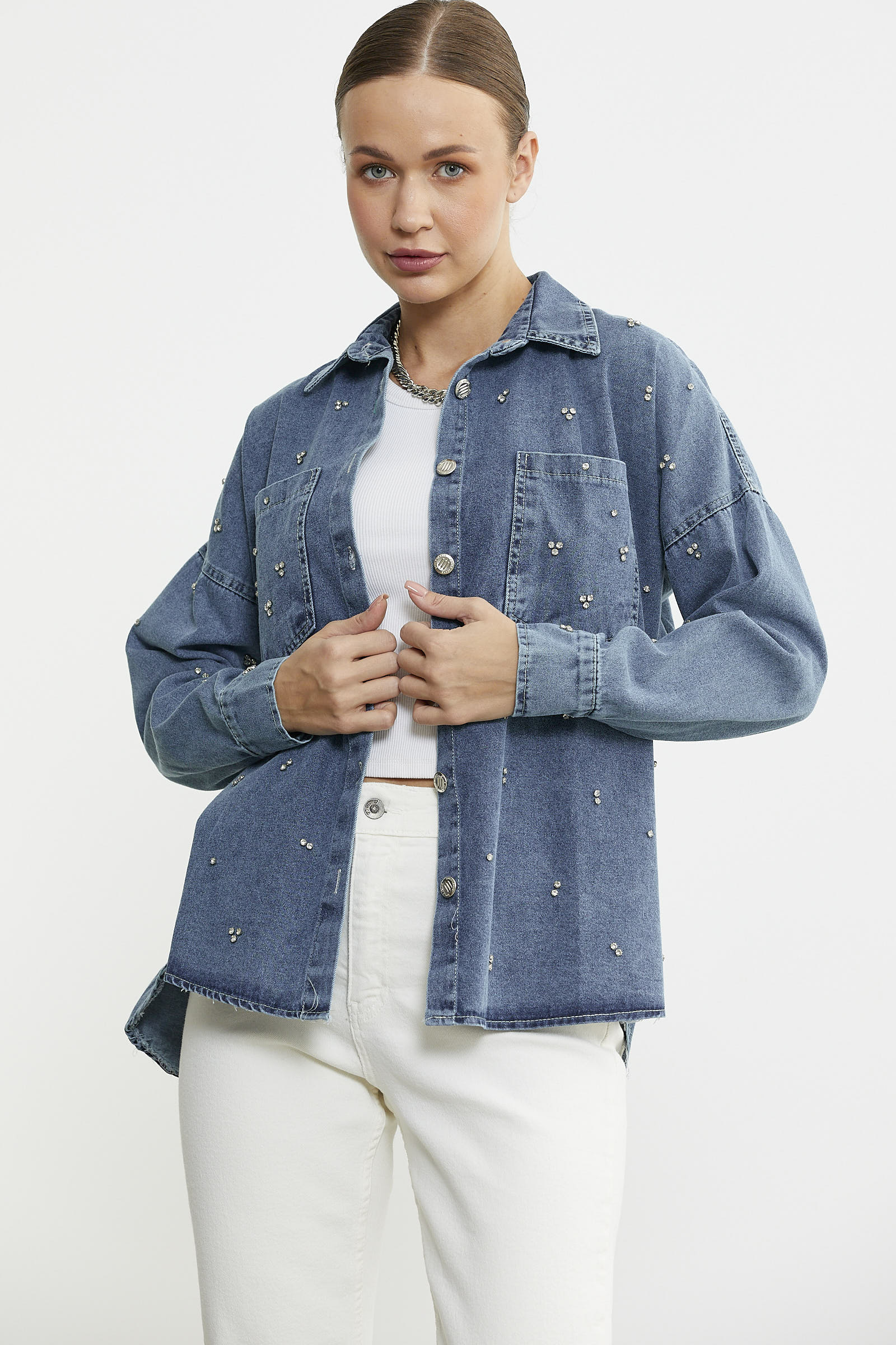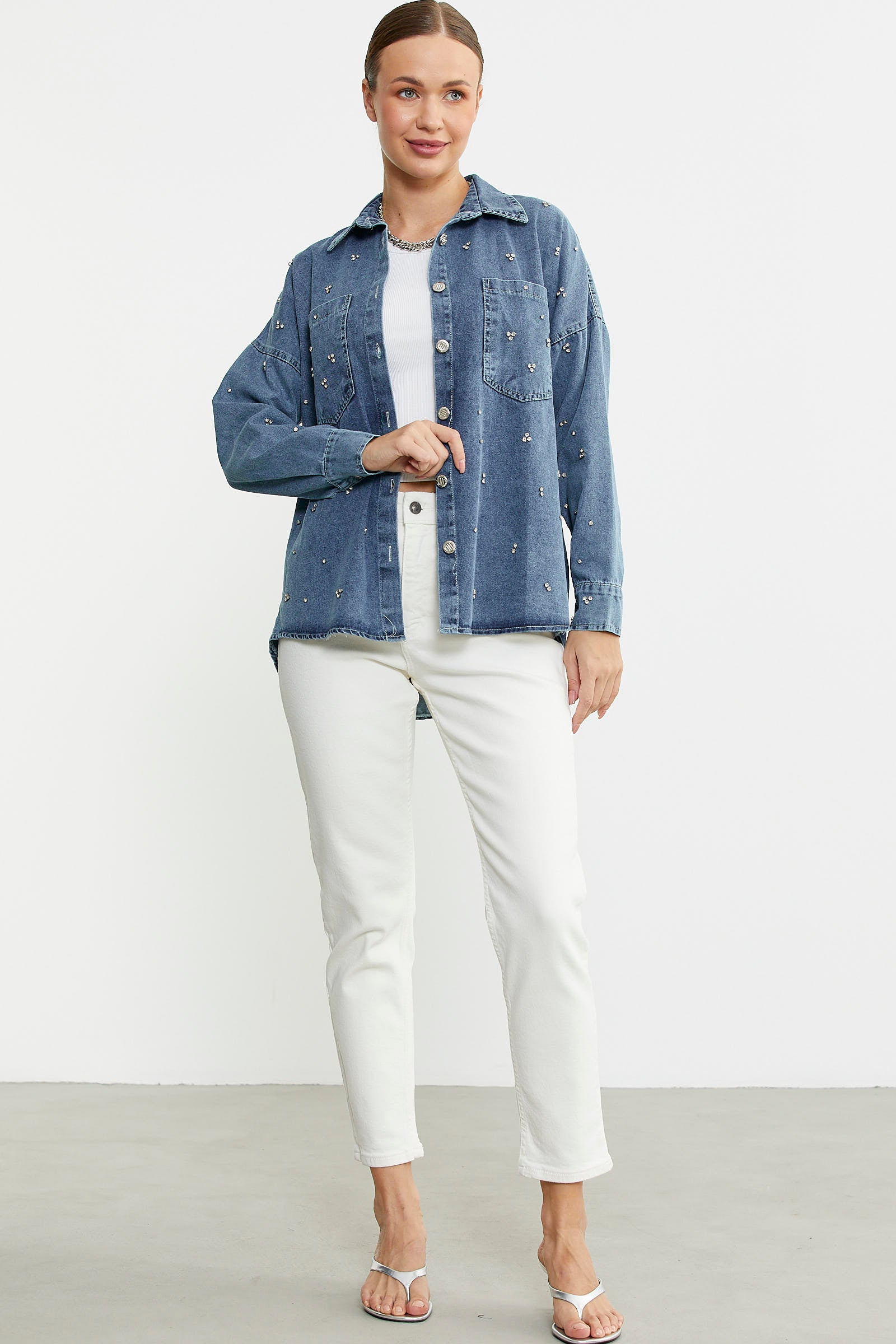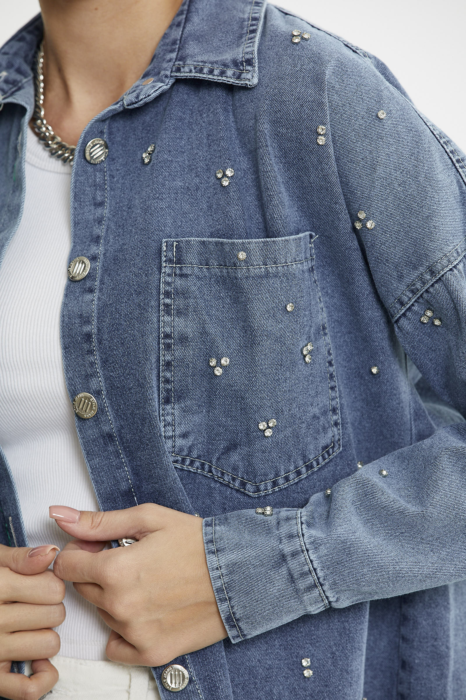 Taş Detaylı Jean Gömlek Ceket - Mavi